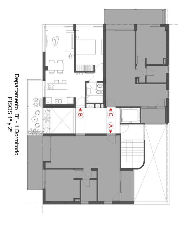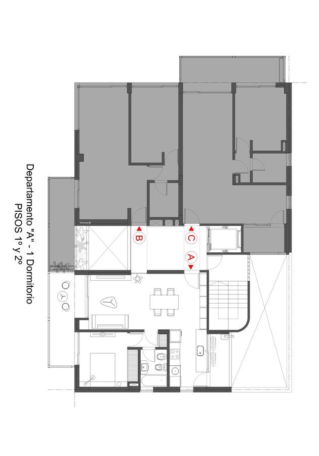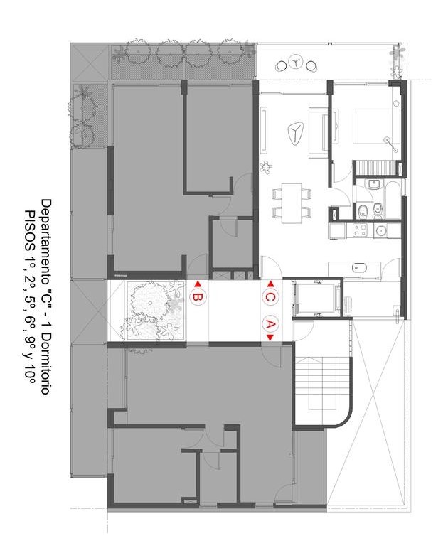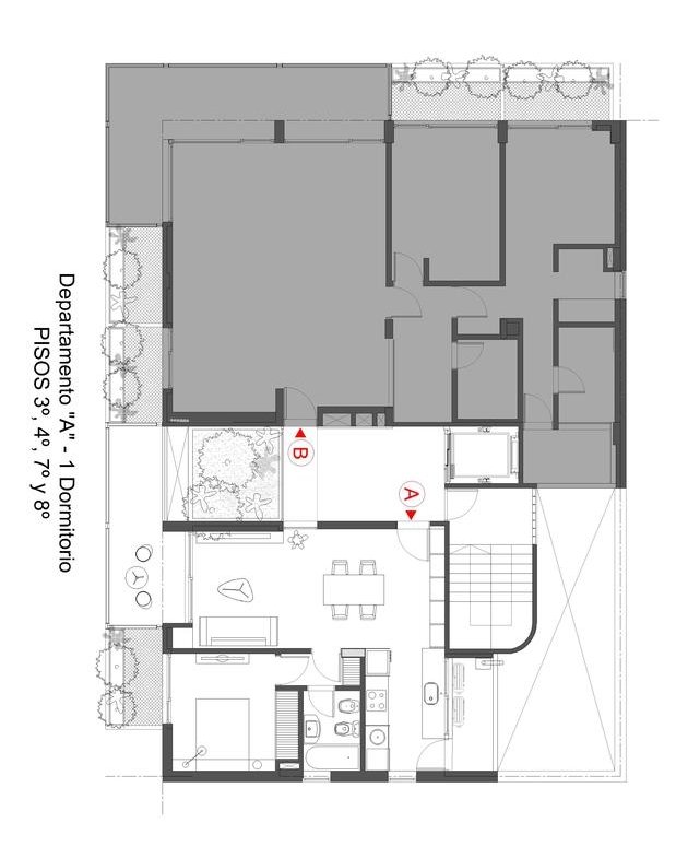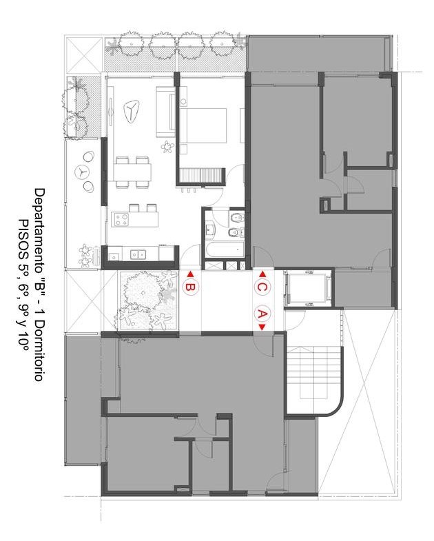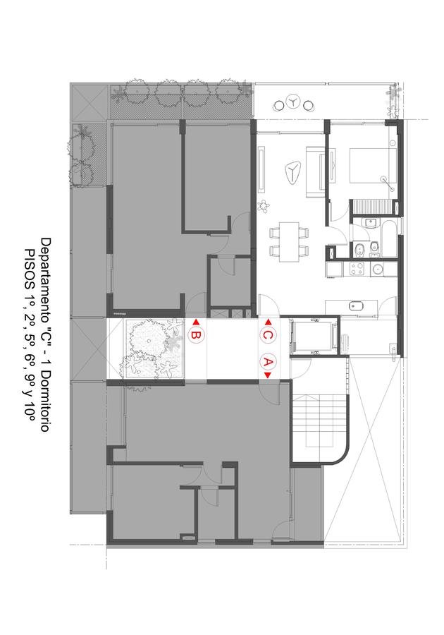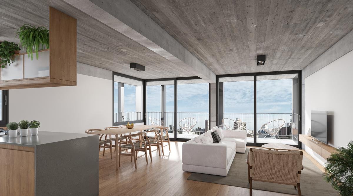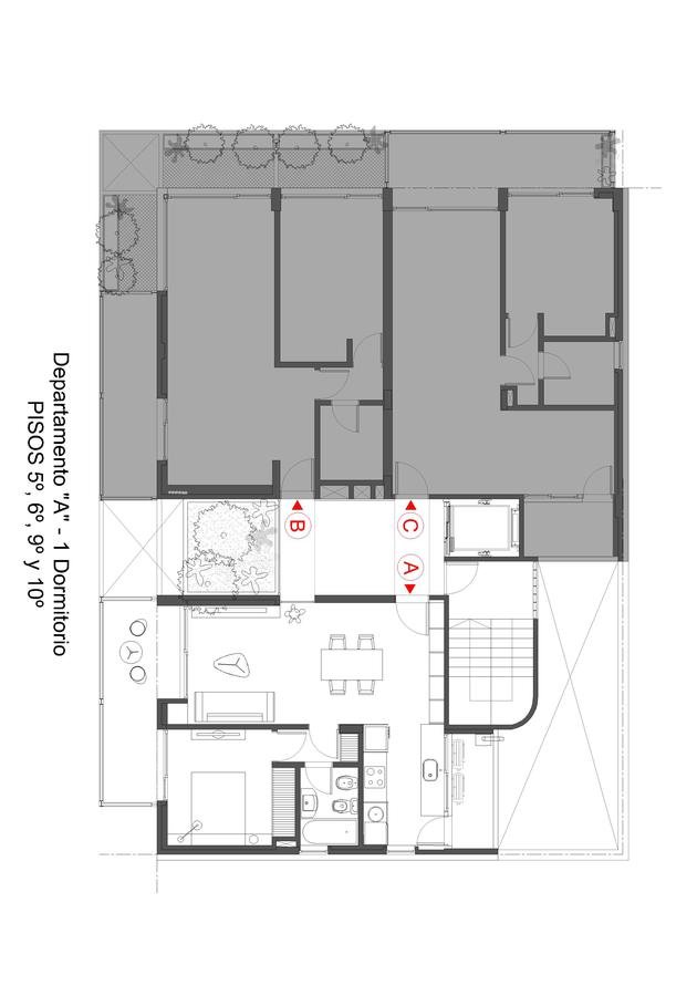 Proyecto de PB + 10 pisos con 22 unidades de 1 dormitorio de 54 m², 62 m² y 63 m² exclusivos 4 unidades de 2 dormitorios de 116 m² exclusivos 4 cocheras simples + 2 cocheras dobles. Terraza verde y canteros con vegetación en balcones. Lockers y guardado de bicicletas. Amenities en azotea: solarium, pileta y quincho.