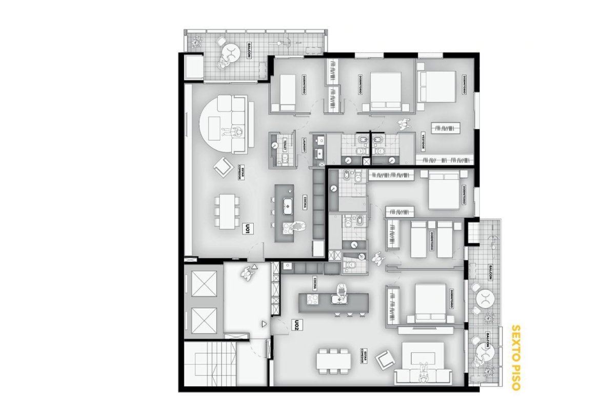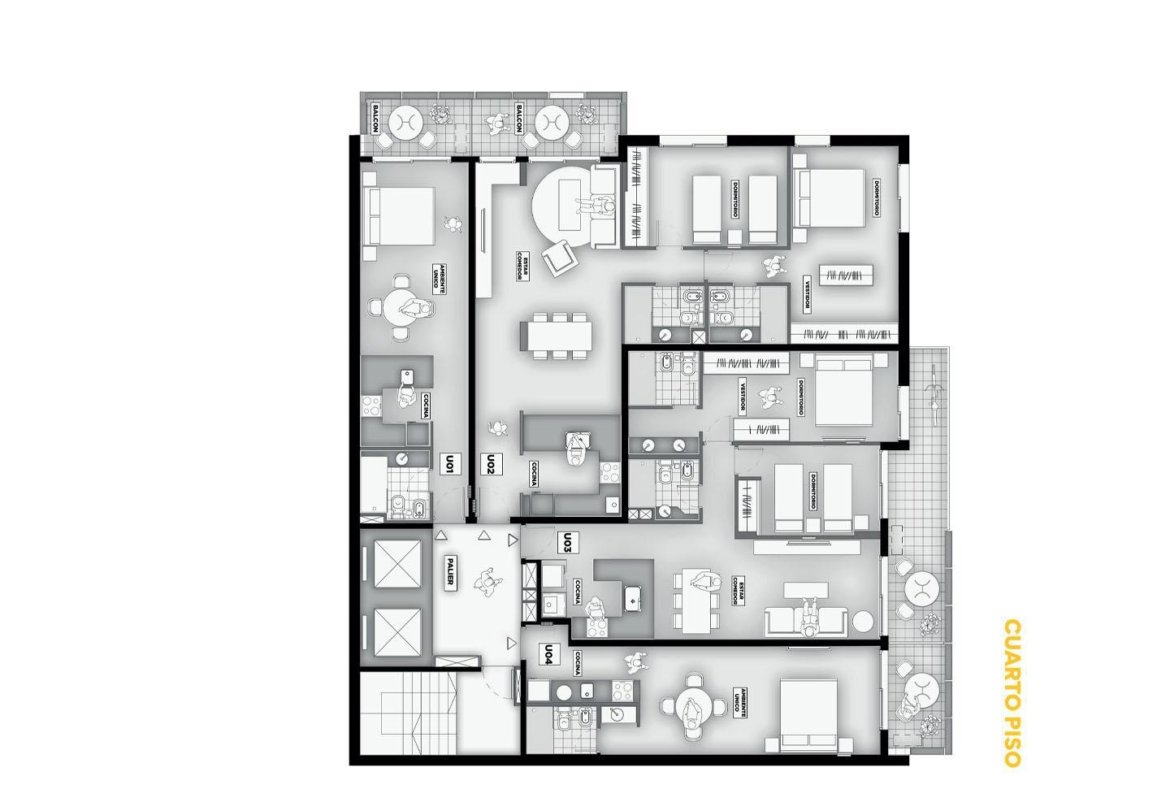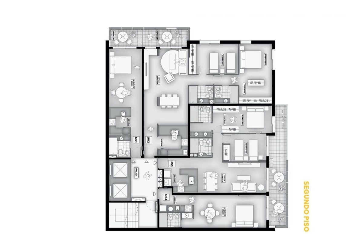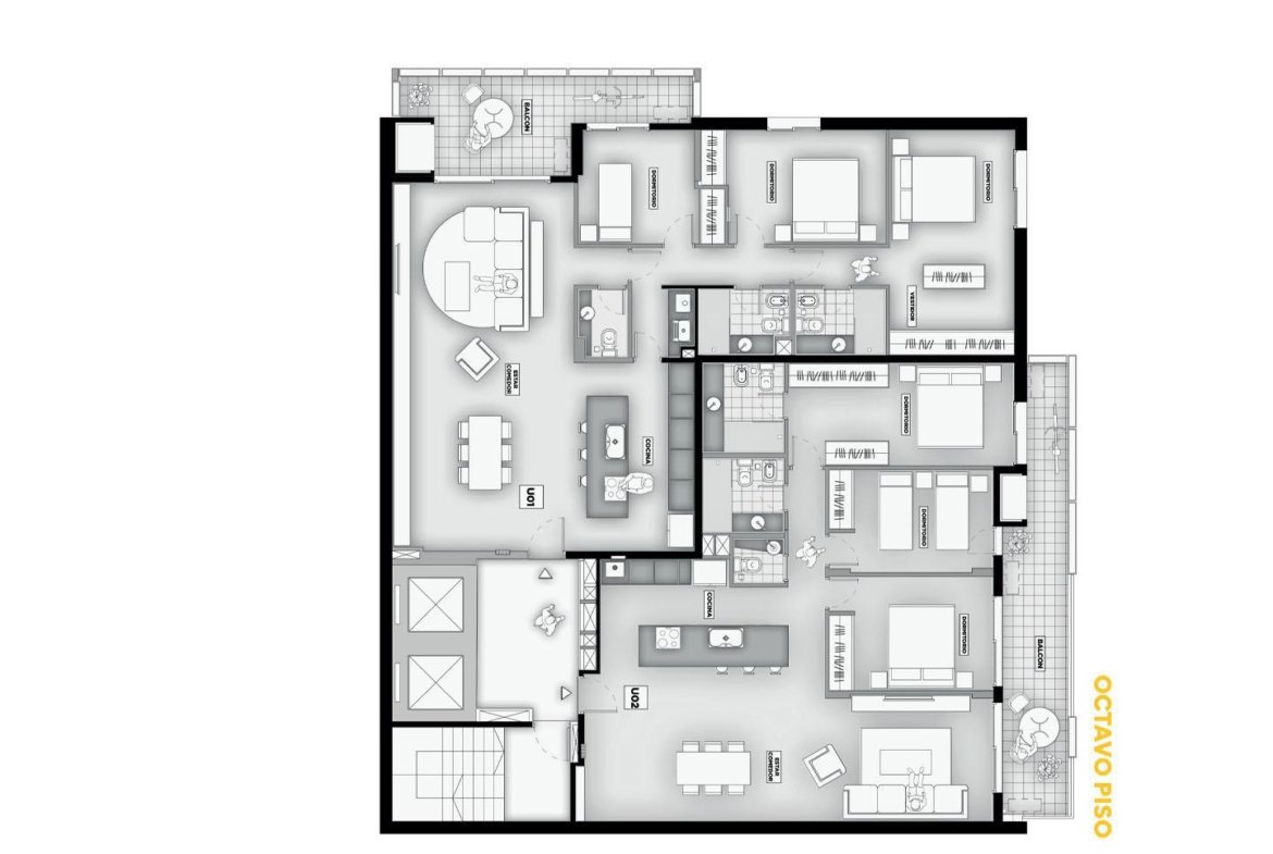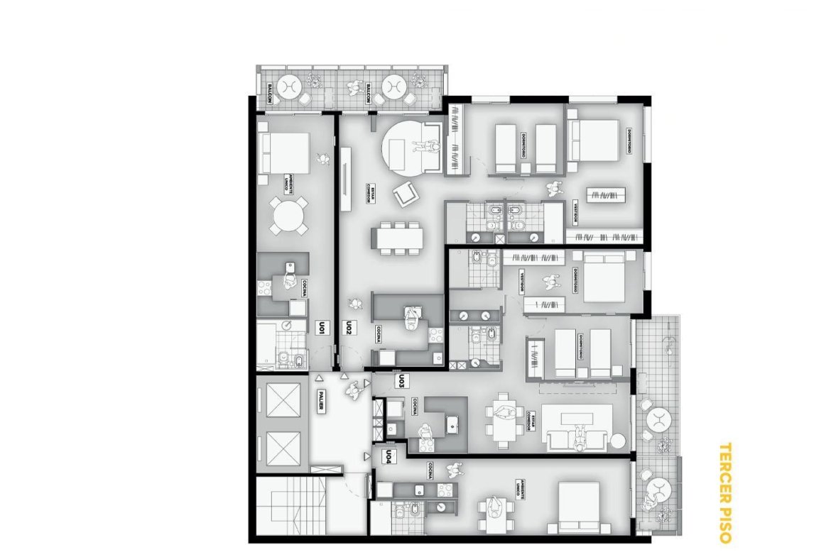 Terminaciones: Pisos vinílicos o porcelanato. Aberturas de aluminio con DVH, línea A30 o similar. Frentes de placar de melanina y kit aluminio. Cocina con mobiliario completo de bajo mesada, alacena con perfil de aluminio anodizado, mesada de granito, se entregará con horno empotrado y anafe, bacha Johnson de acero inoxidable con grifería FV. Calefacción por radiadores y agua caliente por caldera dual para 2 y 3 dormitorios. Termotanques en monoambientes. Las puertas principales de ingreso a los departamentos, serán de madera lustrada, burlete de goma, y cerradura de seguridad. Paredes con yeso. Toma corriente eléctrica especial para la conexión de un Aire Acondicionado. En baños pisos y paredes revestidas en cerámico de primera calidad, Sanitarios marca Roca Línea Mónaco y Grifería FV o similar.
