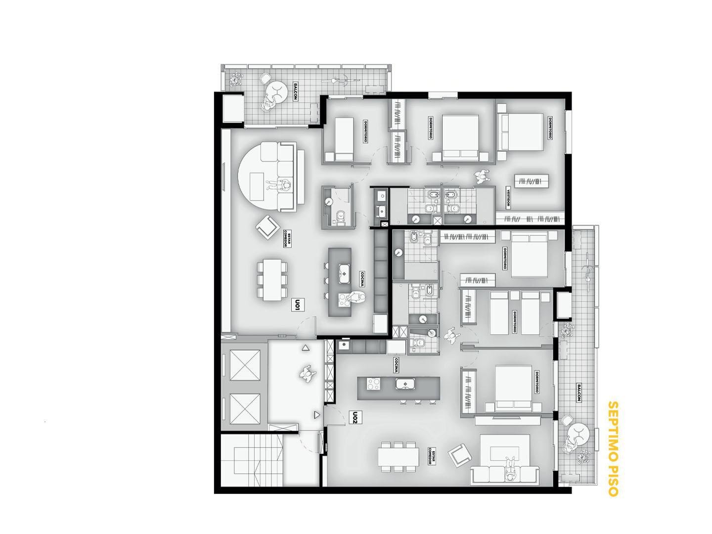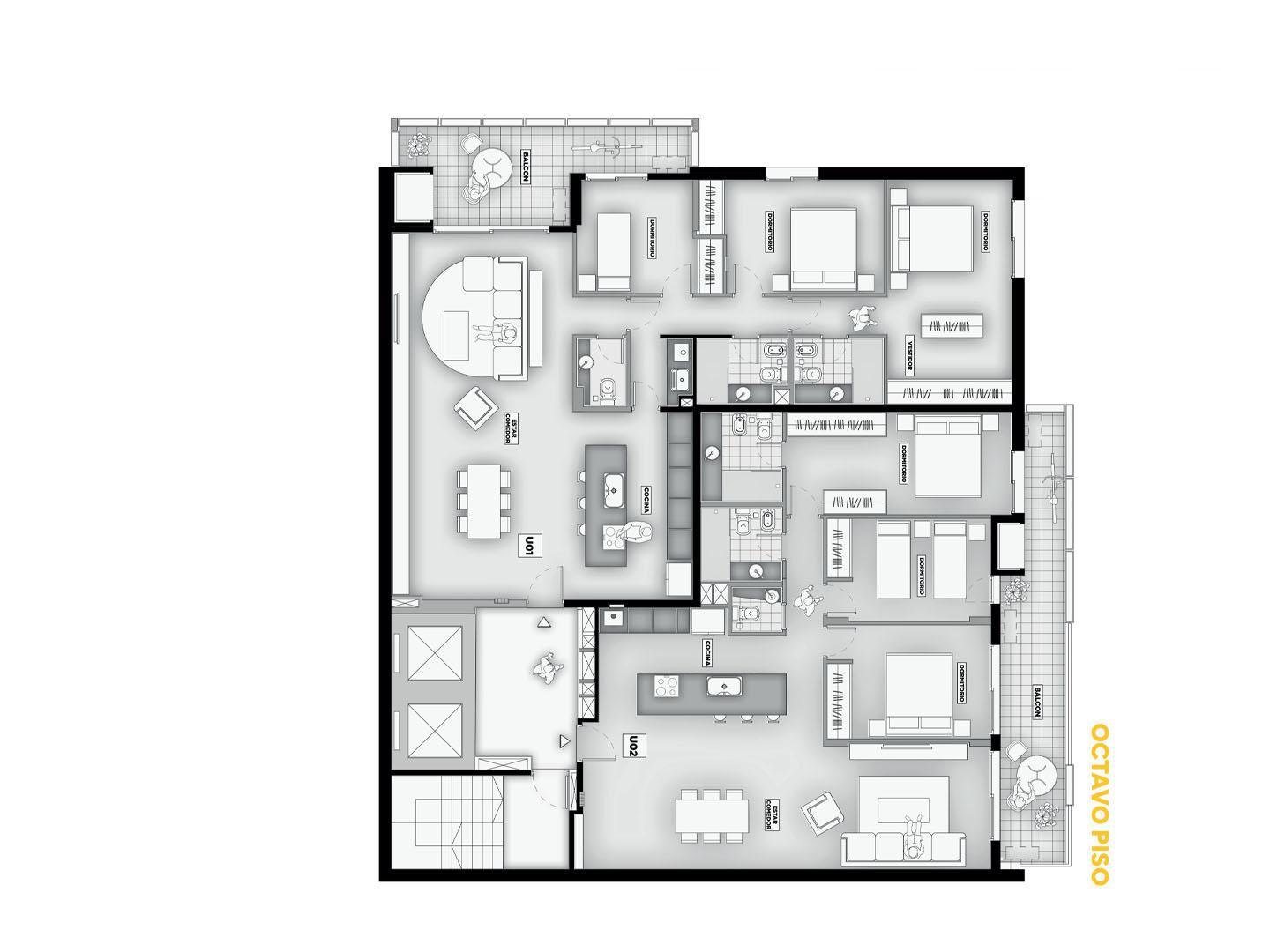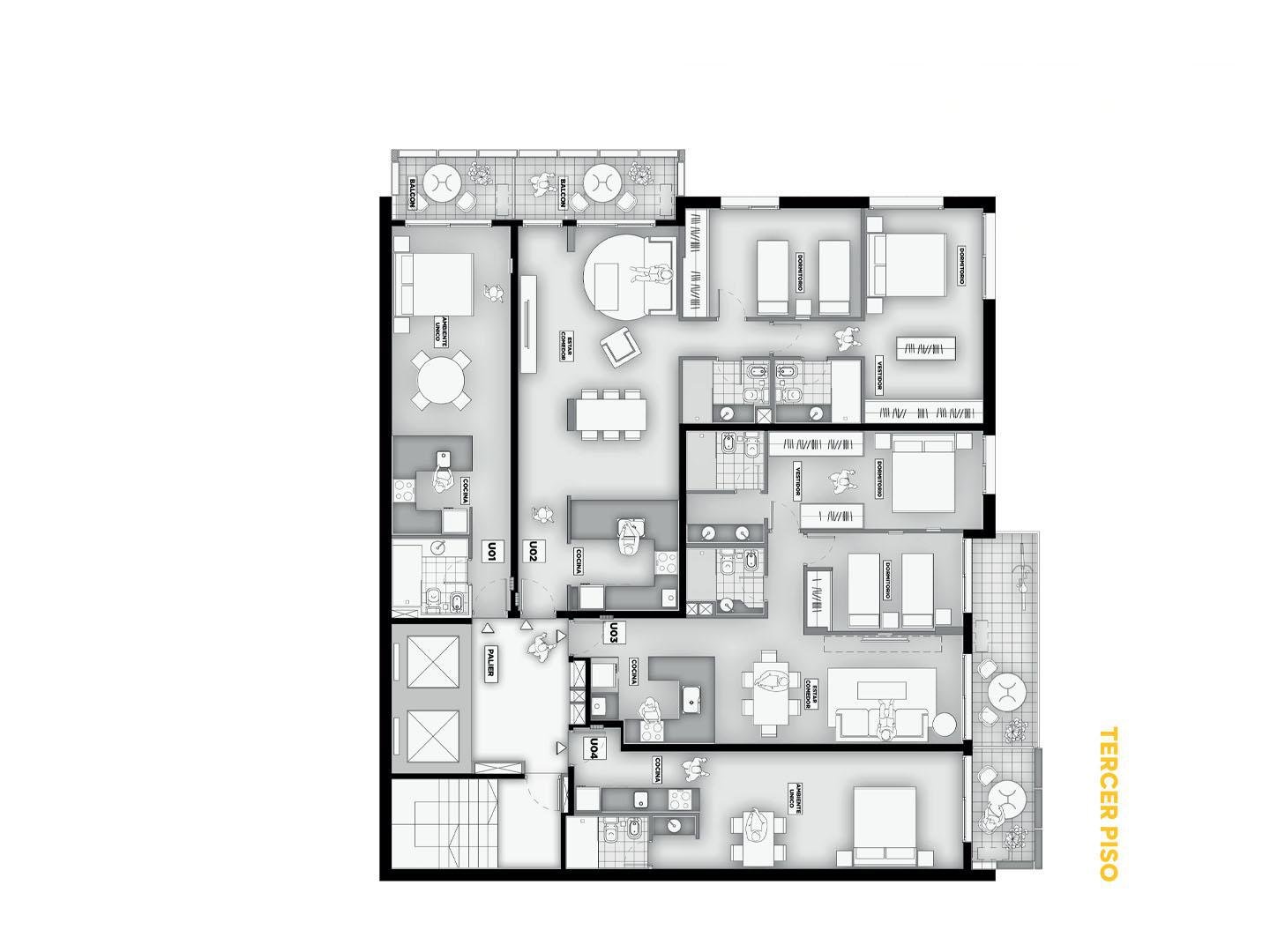 Terminaciones: Pisos vinílicos o porcelanato. Aberturas de aluminio con DVH, línea A30 o similar. Frentes de placar de melanina y kit aluminio. Cocina con mobiliario completo de bajo mesada, alacena con perfil de aluminio anodizado, mesada de granito, se entregará con horno empotrado y anafe, bacha Johnson de acero inoxidable con grifería FV. Calefacción por radiadores y agua caliente por caldera dual para 2 y 3 dormitorios. Termotanques en monoambientes. Las puertas principales de ingreso a los departamentos, serán de madera lustrada, burlete de goma, y cerradura de seguridad. Paredes con yeso. Toma corriente eléctrica especial para la conexión de un Aire Acondicionado. En baños pisos y paredes revestidas en cerámico de primera calidad, Sanitarios marca Roca Línea Mónaco y Grifería FV o similar.