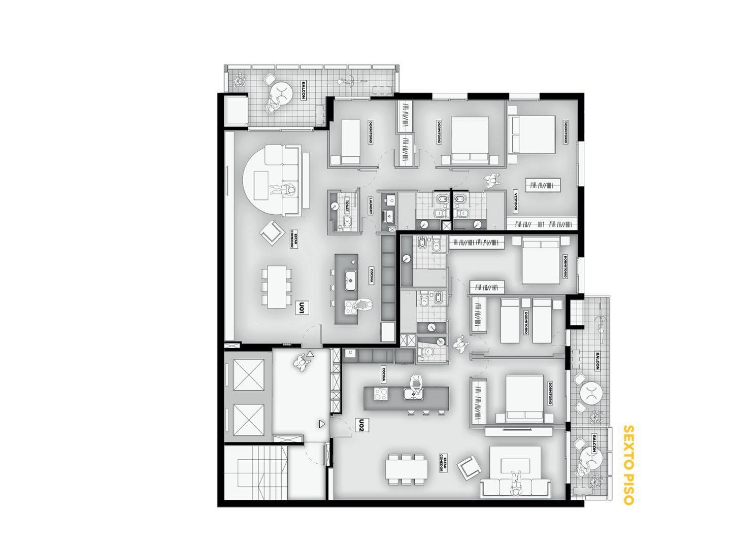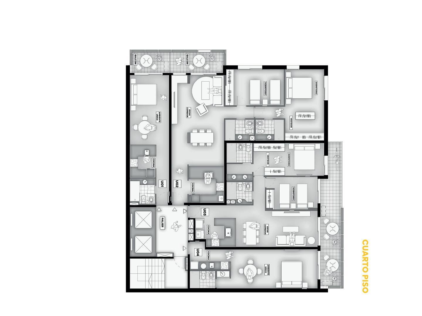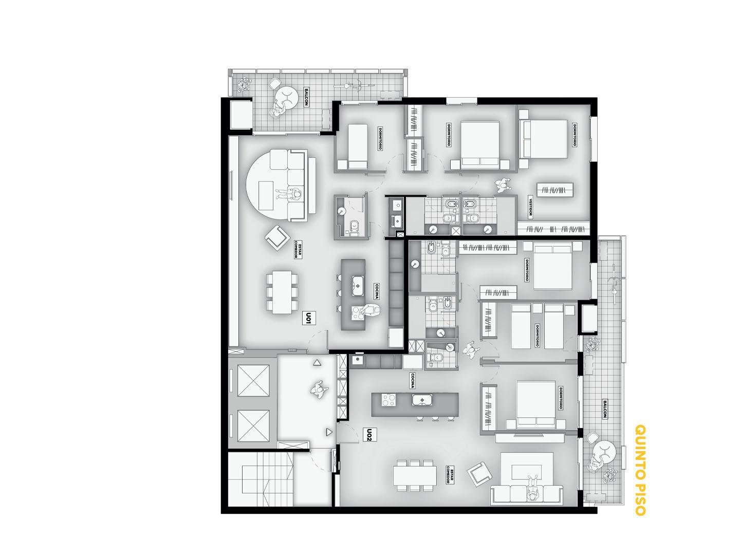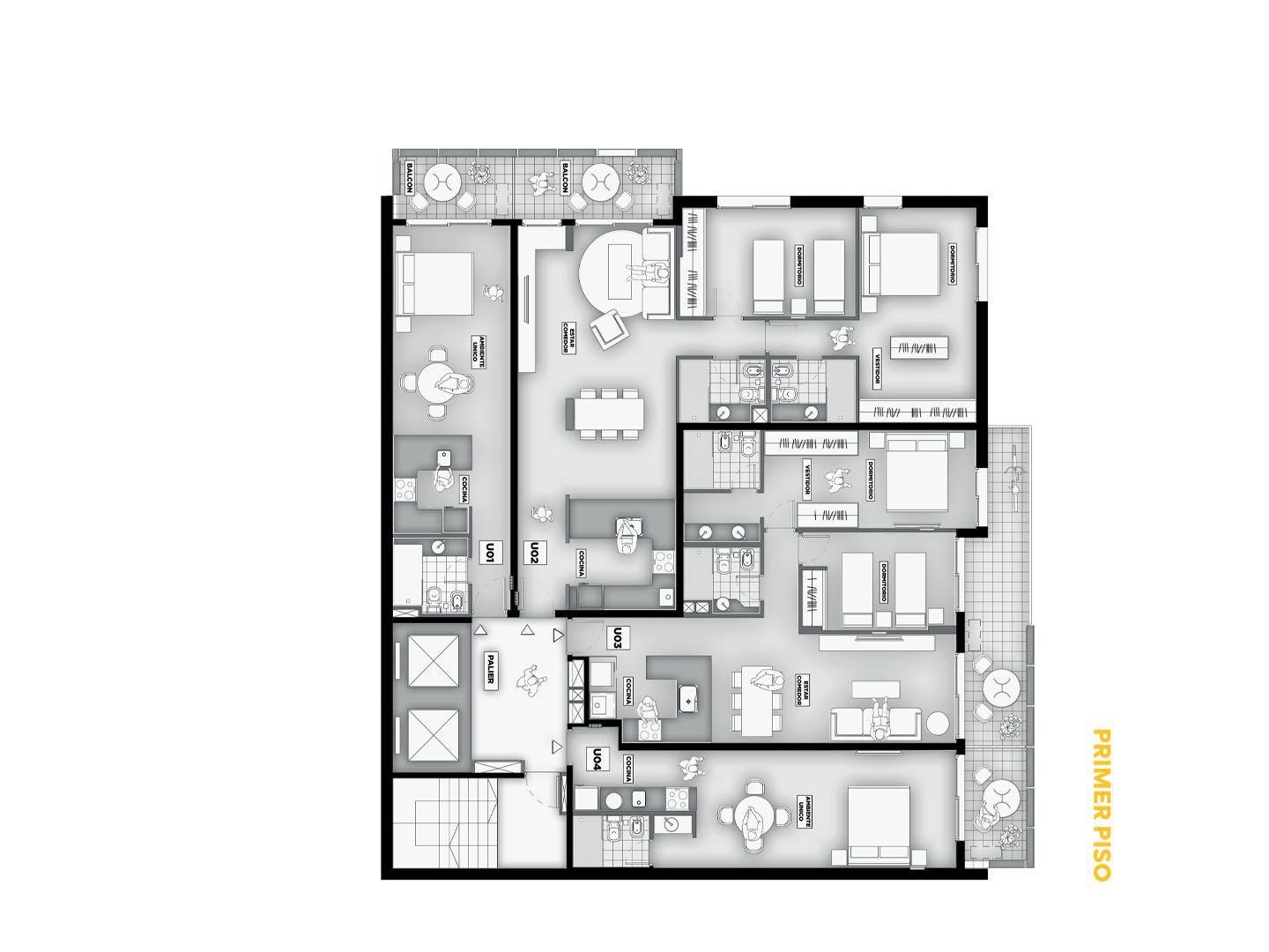 Terminaciones: Pisos vinílicos o porcelanato. Aberturas de aluminio con DVH, línea A30 o similar. Frentes de placar de melanina y kit aluminio. Cocina con mobiliario completo de bajo mesada, alacena con perfil de aluminio anodizado, mesada de granito, se entregará con horno empotrado y anafe, bacha Johnson de acero inoxidable con grifería FV. Calefacción por radiadores y agua caliente por caldera dual para 2 y 3 dormitorios. Termotanques en monoambientes. Las puertas principales de ingreso a los departamentos, serán de madera lustrada, burlete de goma, y cerradura de seguridad. Paredes con yeso. Toma corriente eléctrica especial para la conexión de un Aire Acondicionado. En baños pisos y paredes revestidas en cerámico de primera calidad, Sanitarios marca Roca Línea Mónaco y Grifería FV o similar.