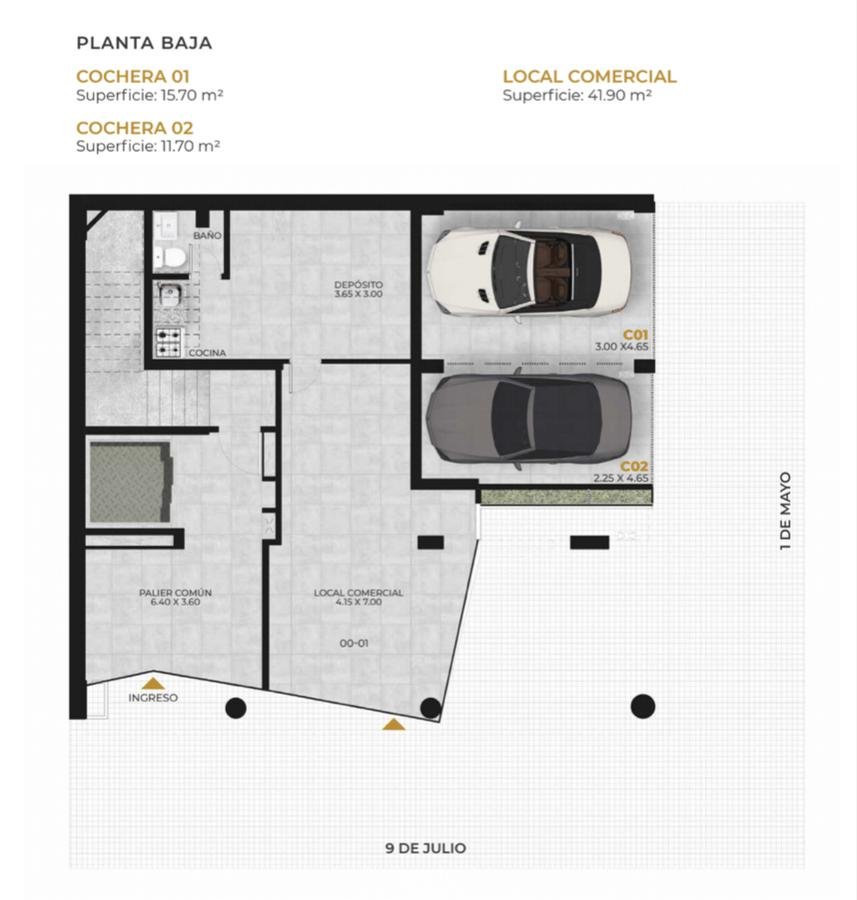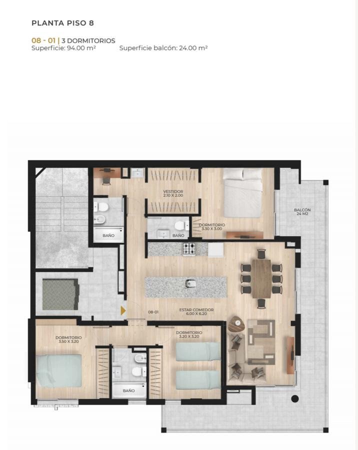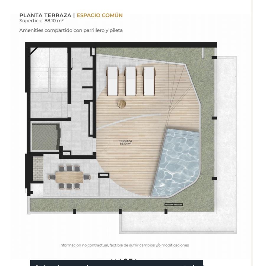 Edificio con hall de ingreso de diseño, local comercial y cocheras. Contarà con 1 ascensor y 3 unidades por planta hasta el piso 6, del 6 al 7 semipisos de 2 dormitorios y piso 8 exclusivo con una unidad de 3 dormitorios. Azotea común con quincho, parrillero, pileta con solárium más deck. Control de acceso y servicio de limpieza.