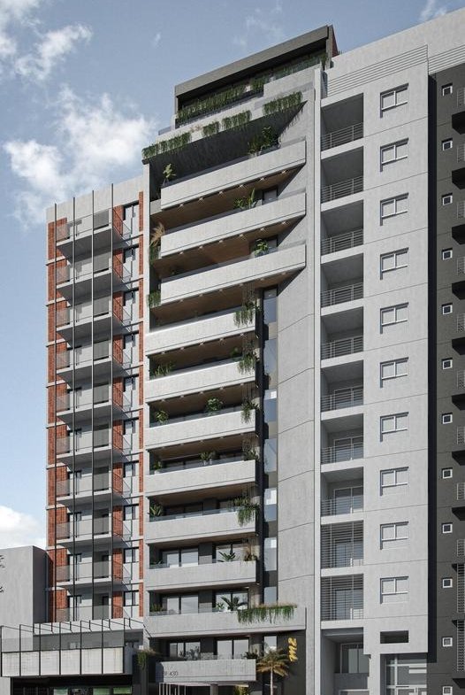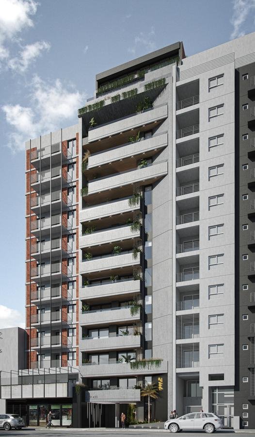 Este ambicioso proyecto, poco común para el área central de Rosario, se desarrolla en planta baja con importante lobby en doble altura, subsuelos de cocheras, 13 pisos con unidades tipo estudio, uno, dos, tres dormitorios y pisos exclusivos.