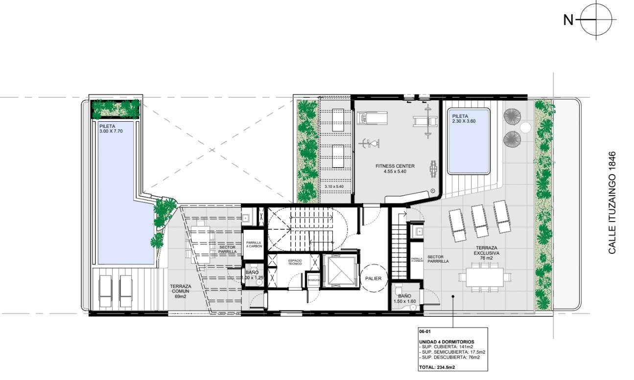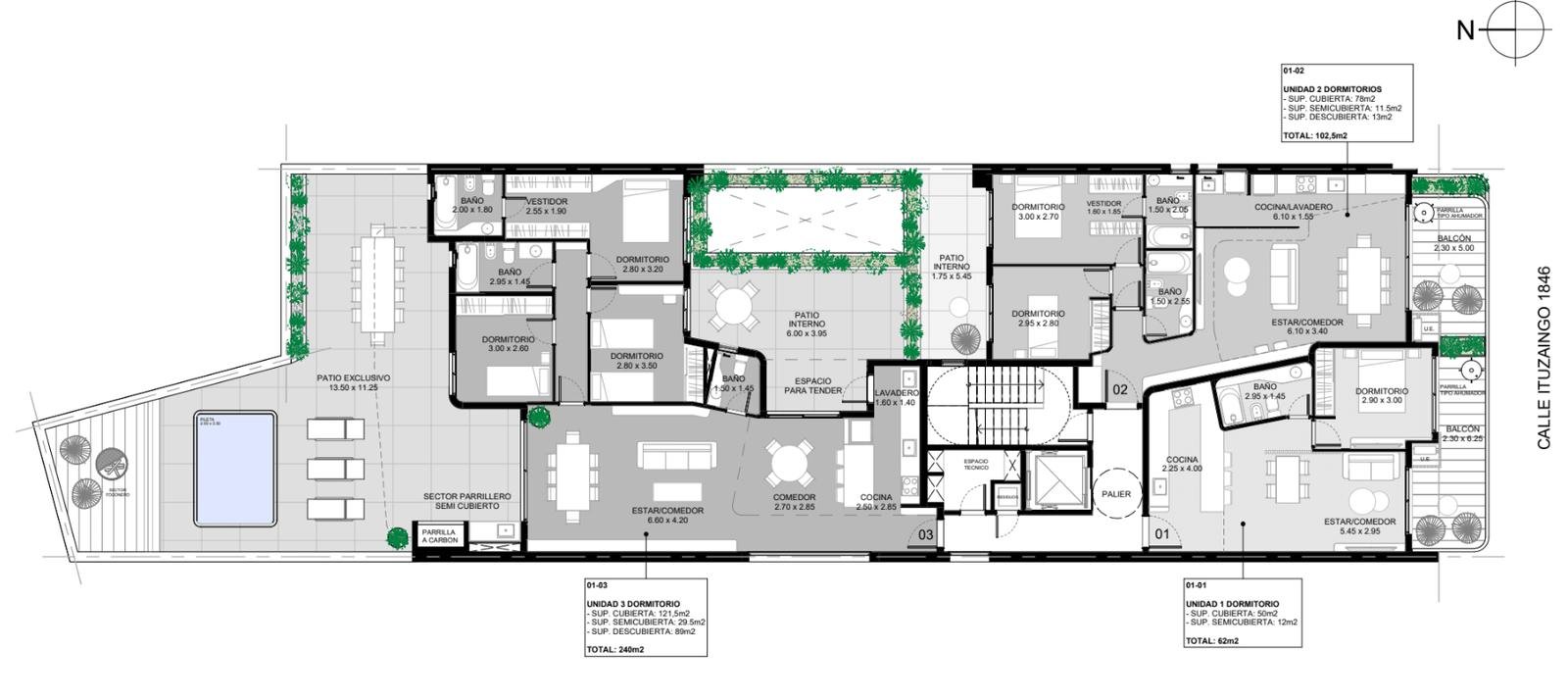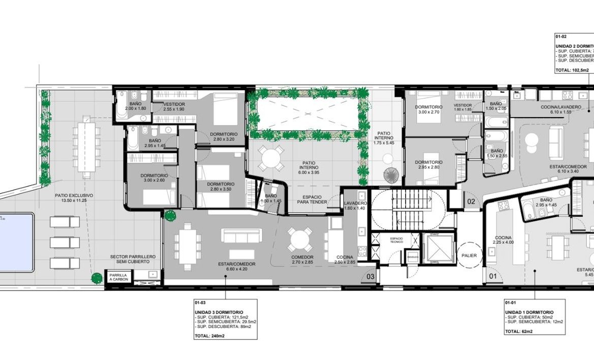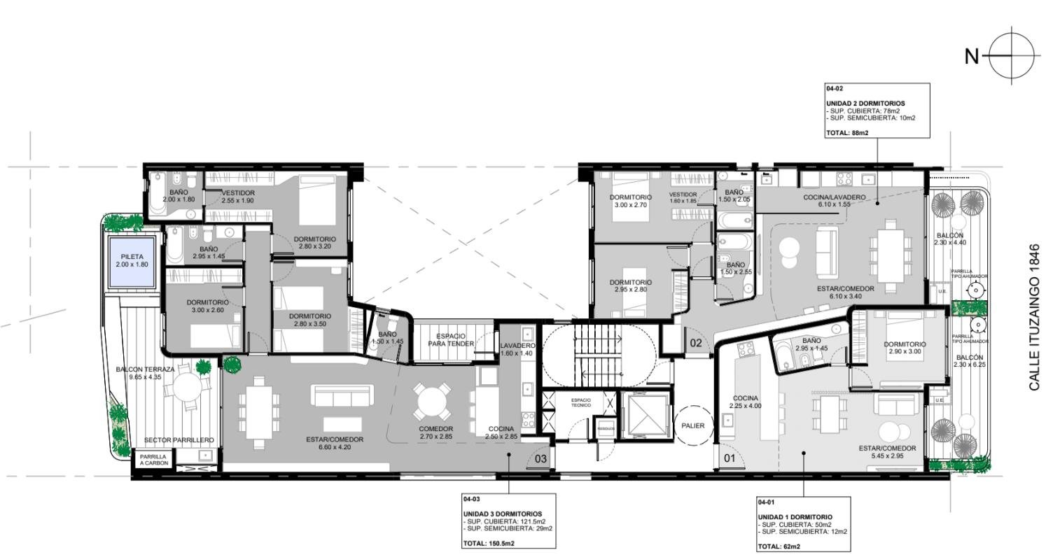 • Sector parrillero con parrilla a carbón y mesada de apoyo con bacha en balcones terraza (02-03, 03-03, 04-03).
