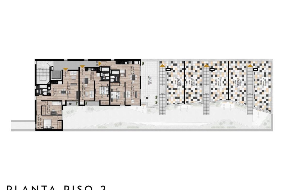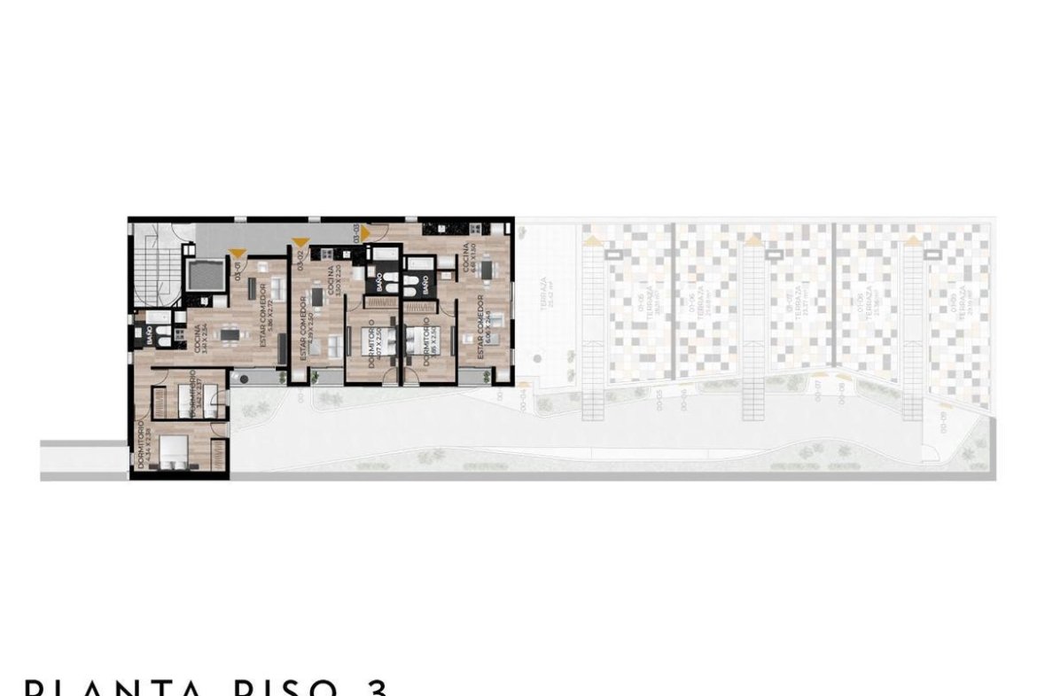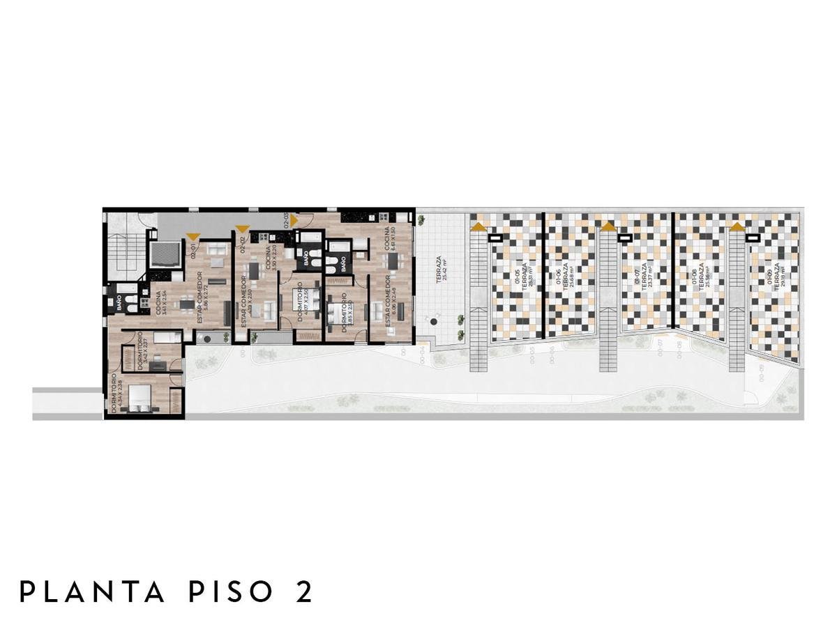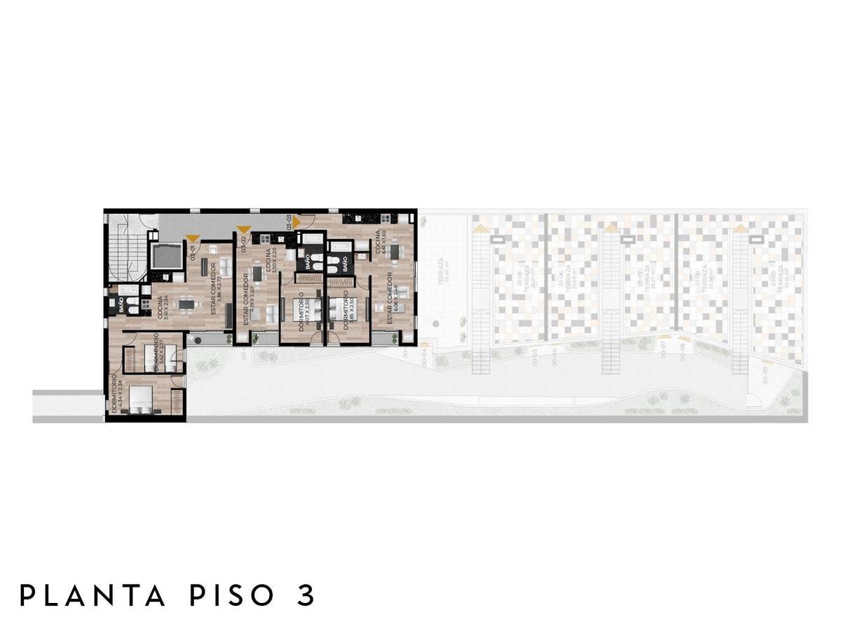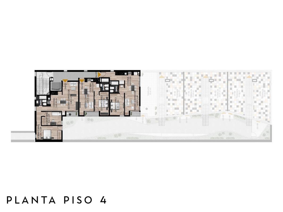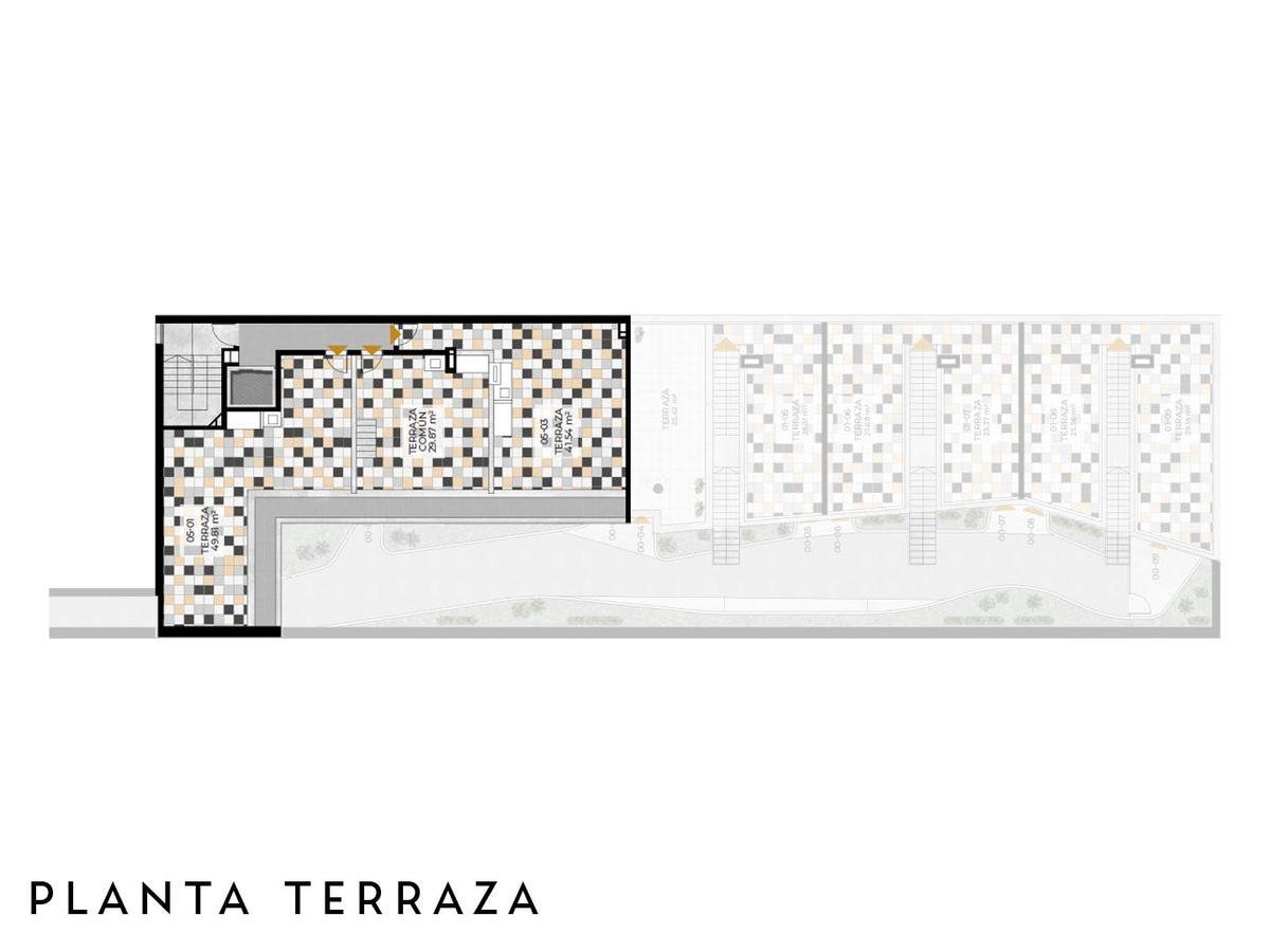 Edificio de PB+4 pisos, unidades con acceso por ascensor y escalera, con terrazas exclusivas con parrillero propio.