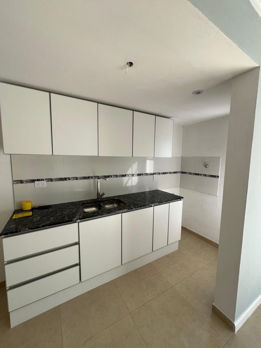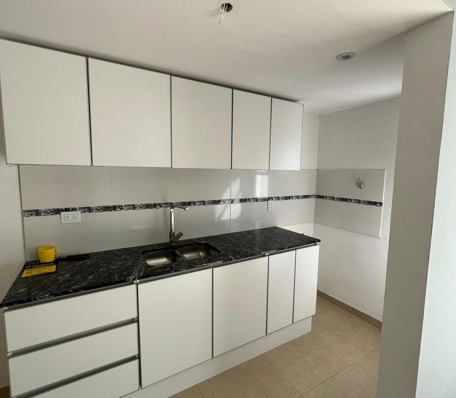 Cocina con mesada de mármol, alacenas y bajo mesada en melanina blanca con canto de aluminio.