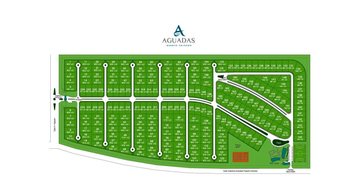 Aguadas es un desarrollo consolidado de 30 hectáreas, con 234 lotes que parten desde los 800 m², ideales para proyectar viviendas con amplitud y confort. El barrio se encuentra prácticamente terminado y cada una de sus calles está forestada con árboles de más de 15 años que hoy alcanzan los 4 metros de altura, creando un entorno verde y agradable durante todo el año.