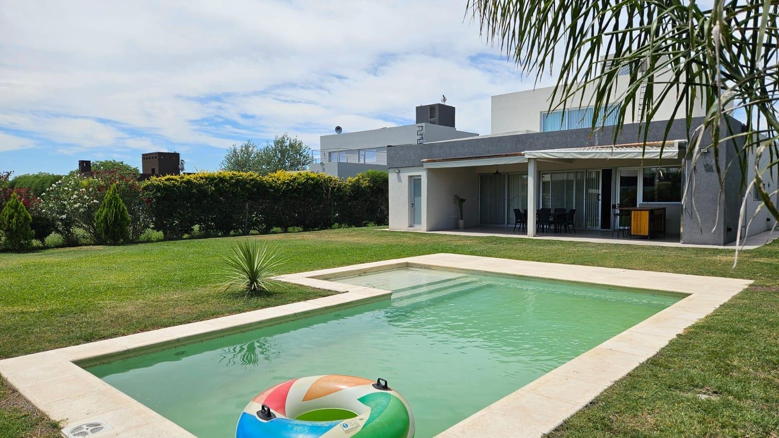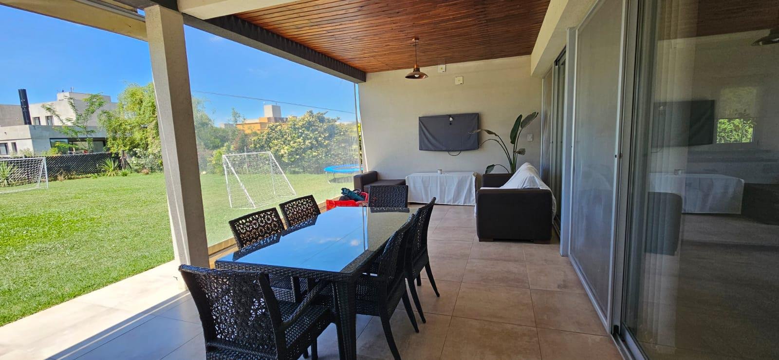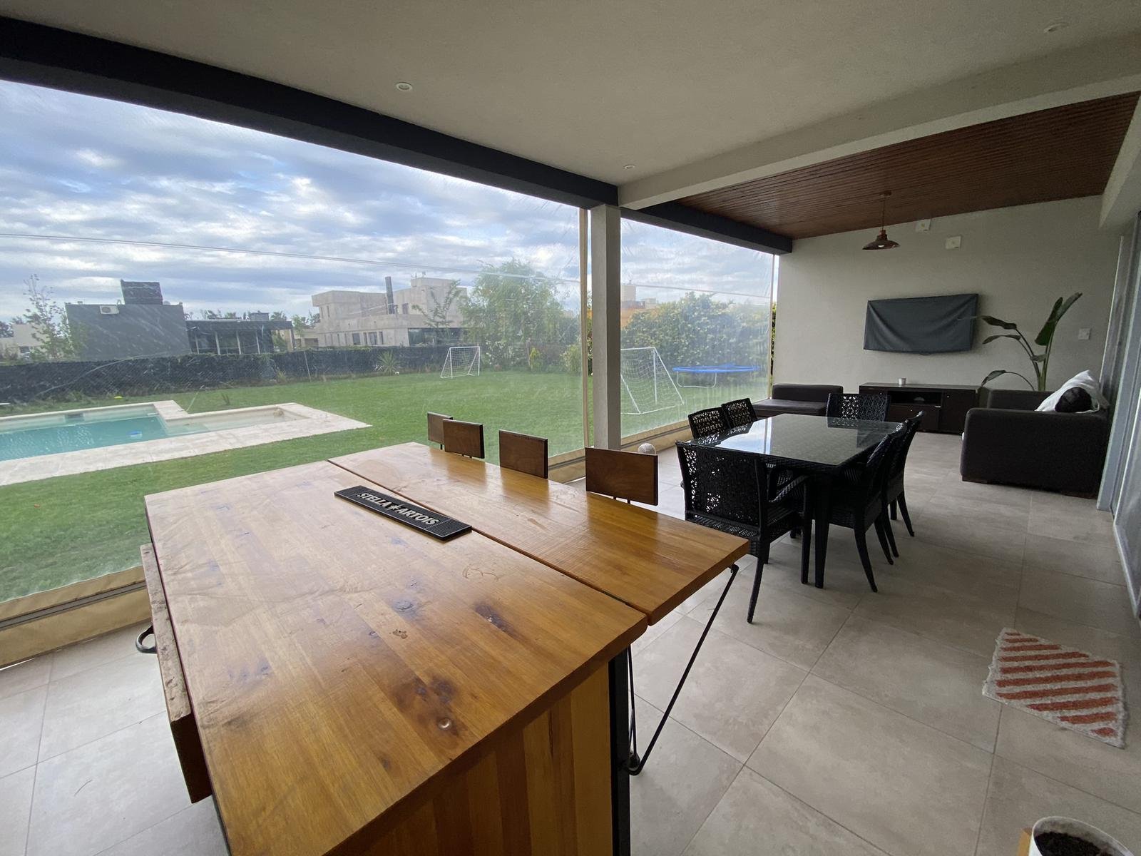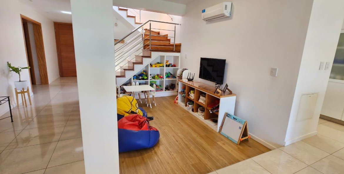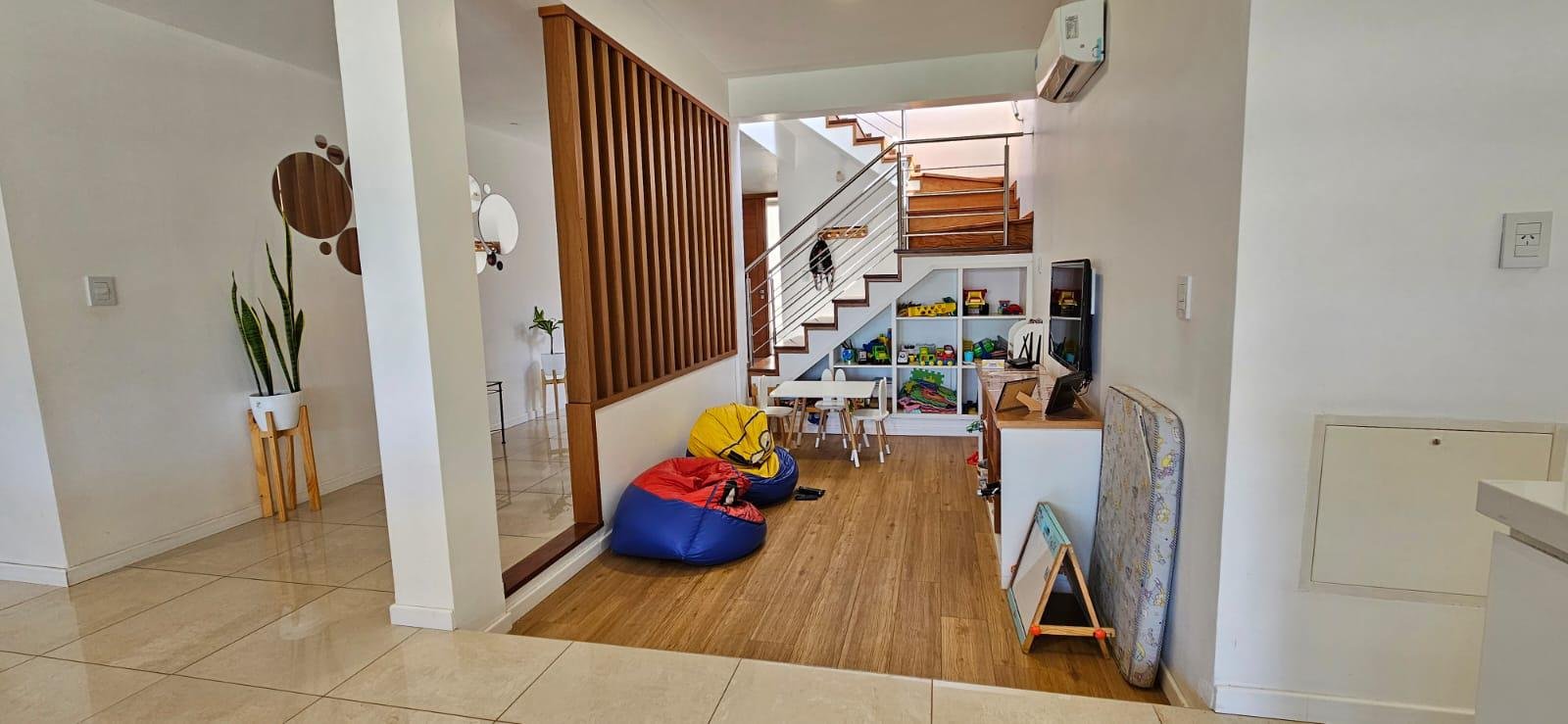 La casa se encuentra desarrollada en dos plantas, cuenta con un imponente frente y cochera cubierta para dos autos. En el interior nos encontramos con un hall recibidor el cual conecta el dormitorio principal en suite, segundo dormitorio con baño completo y la escalera hacia planta alta. Luego contamos con un amplio living comedor con cocina semi integrada y un espacio de Playroom, nos desplazamos por un lavadero independiente con salida hacia el patio lateral en el cual encontraremos un deposito o bicicletero. La casa cuenta con un quincho muy completo con living y barra, parrilla y horno de fundición; está cerrado por toldo movible para acceder al patio donde se encuentra la piscina de 32m2 y mini cancha de futbol; el patio cuenta con un baño de servicio en su exterior y un deposito. En planta alta: encontraremos un amplio espacio de gimnasio o sala de trabajo, un dormitorio de servicio, baño completo y deposito.