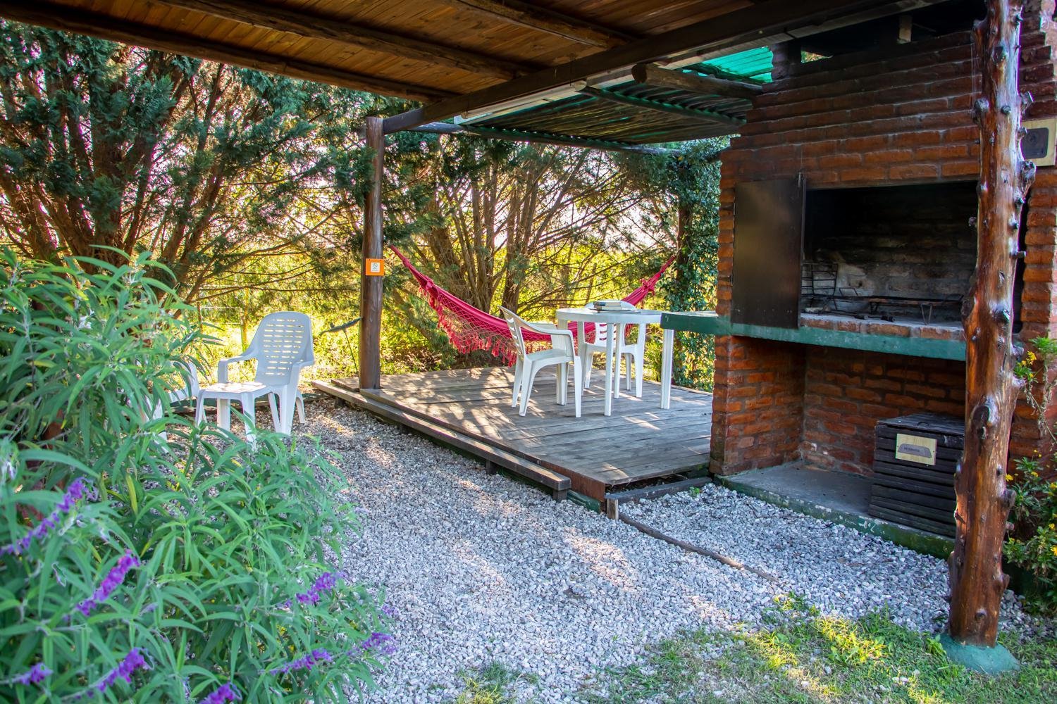 Mobiliario de jardín: mesa canadiense, 2 reposeras plásticas, hamaca paraguaya, asador individual techado con elementos de parrilla completo.