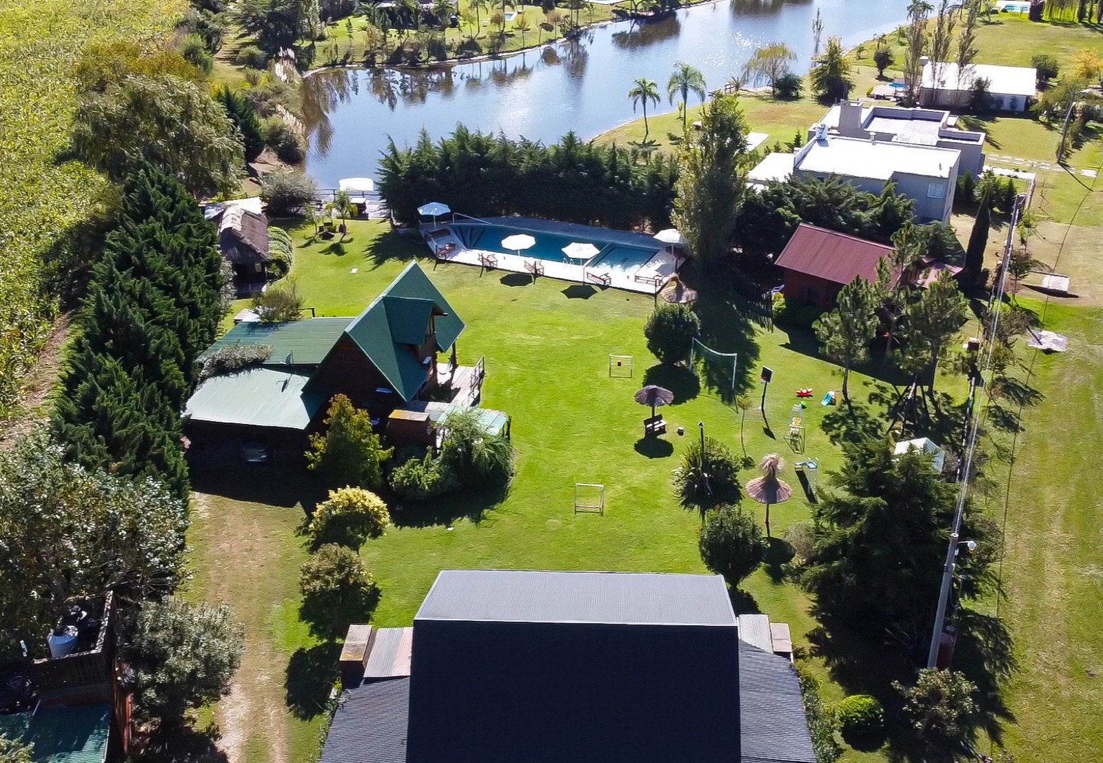 Parque de 5000 mt2 rodeado de naturaleza y vista hacia una laguna artificial.