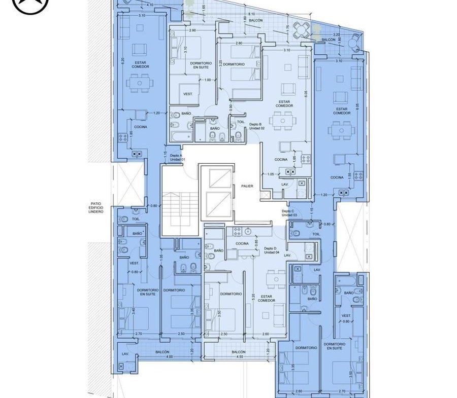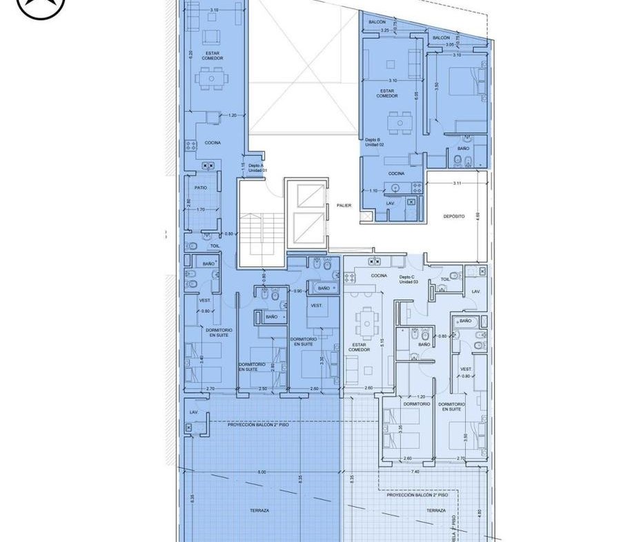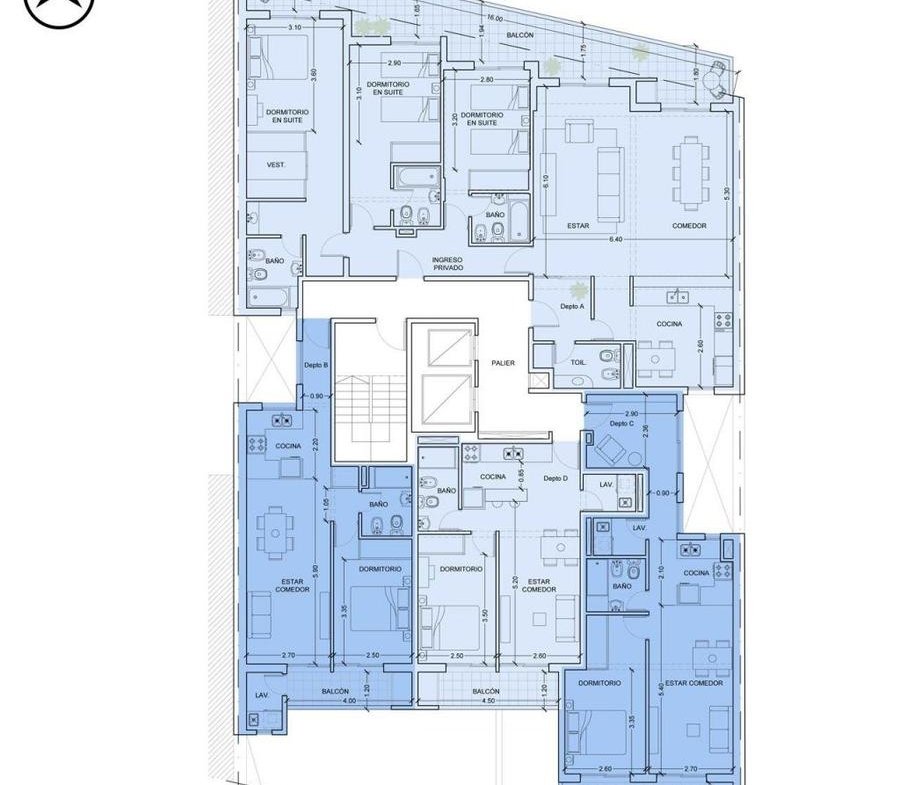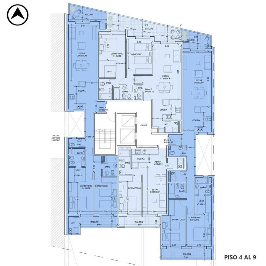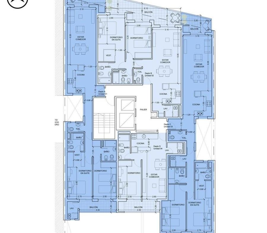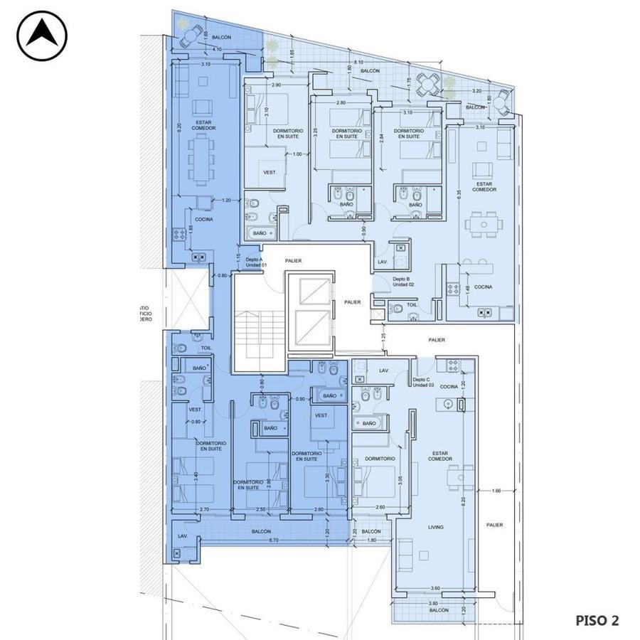Depto de 103 m2 de superficie. Estar comedor con cocina semiseparada por una barra, toilette de recepción y salida a un balcón al frente. Dos dormitorios con baño en suite, el principal con vestidor. Lavadero independiente.