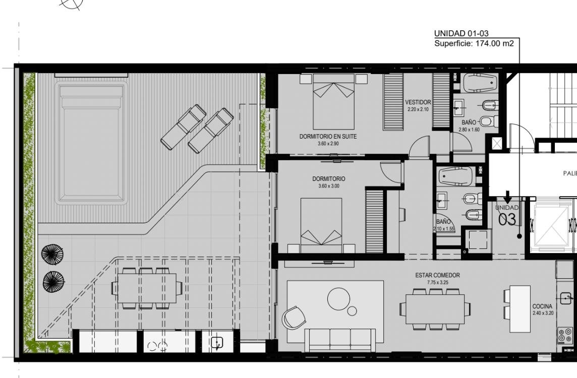 A continuación nos encontramos con un amplio living que nos da acceso al patio de más de 80 mts2 que cuenta con pileta de uso exclusivo con deck, sector de solarium, quincho semicubierto con parrillero, mesada y bacha, y canteros integrados brindando un espacio verde a la propiedad.