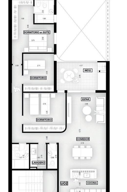 Cómodo patio de uso exclusivo de 12 mts2 con parrillero.
