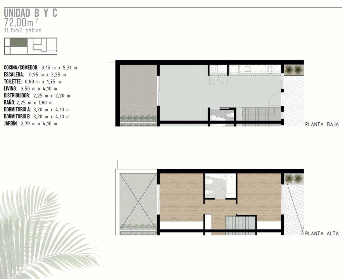 PLANTA ALTA: al fin de las escaleras tendremos un intimo que nos conectara con el baño principal y los dormitorios, el principal con placard que abarca toda la pared sur y da con ventanal al contrafrente con vista al patio. Dormitorio secundario con placar que abarca pared norte y ventanal que da al ingreso de la unidad.
