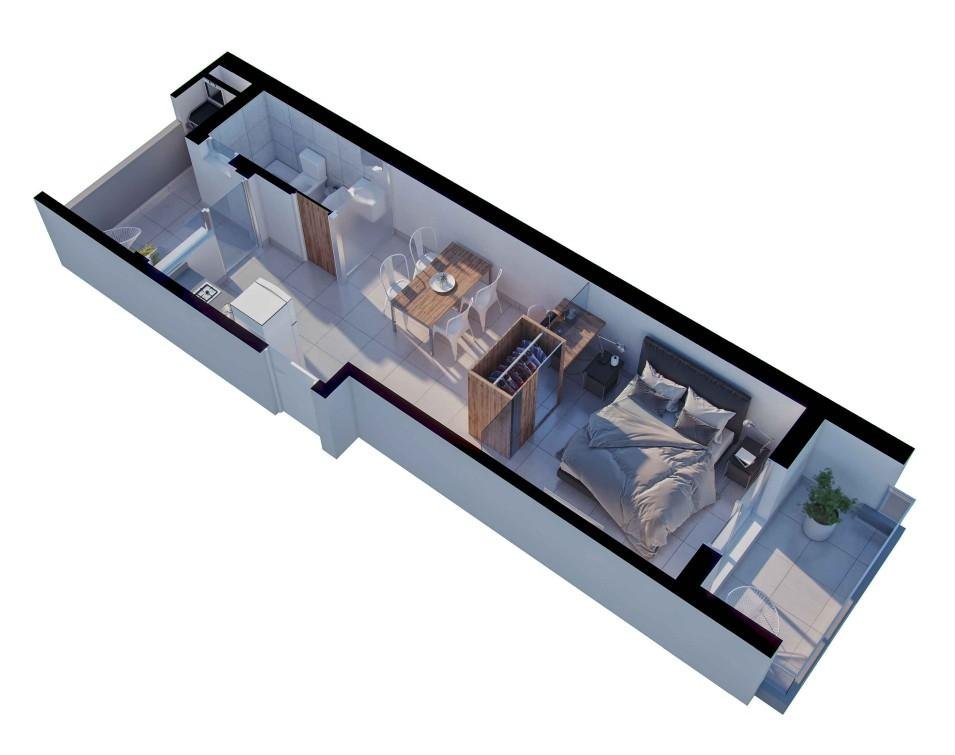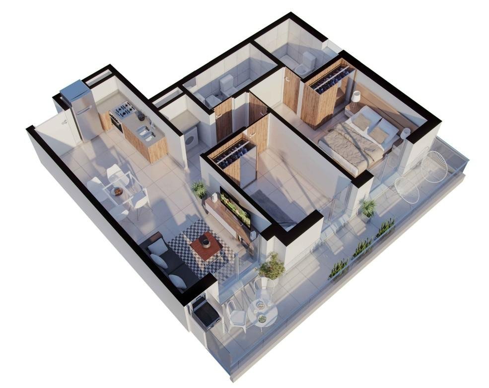 Departamento: Unidad al frente de 53,64 m2 de Superficie Cubierta y 11 m2 de Superficie Semicubierta con orientación Este. Ingreso a la cocina integrada al living comedor con salida al amplio balcón corrido. Pasando al íntimo el lavadero independiente un baño completo para el dormitorio dsecundario y el dormitorio principal con baño en suite.