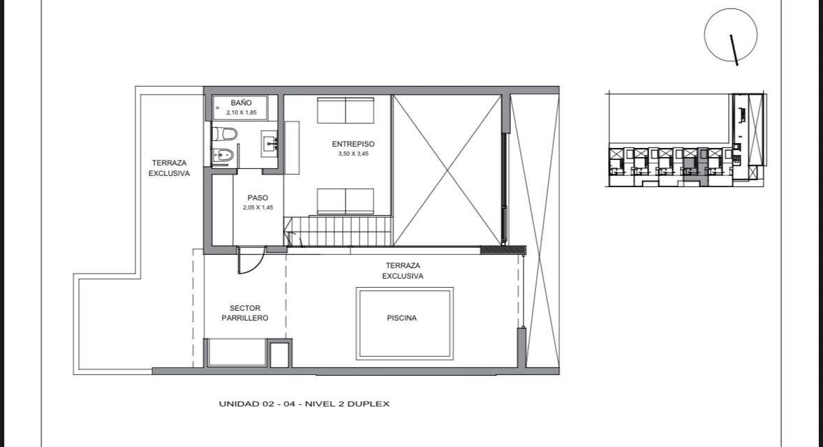 En el entrepiso: 1 dormitorio con baño completo, una amplia terraza exclusiva con parrillero y una pileta chica.