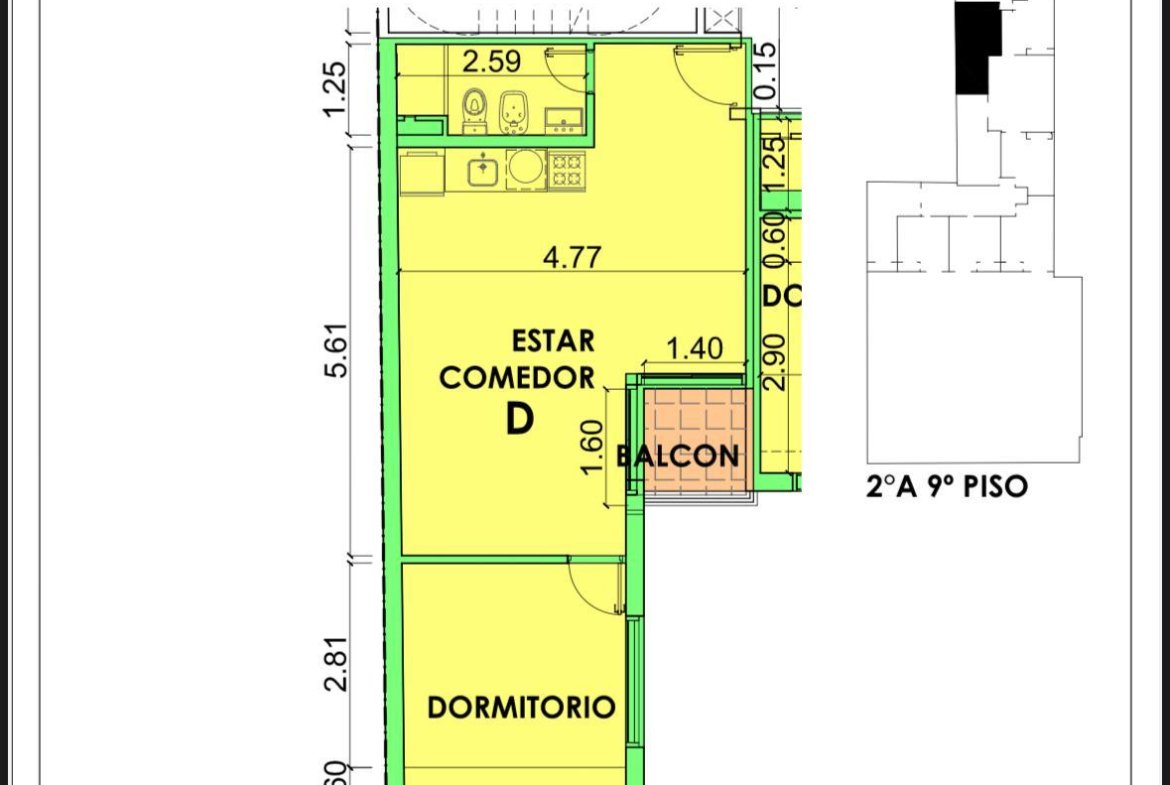 Descripción: Departamento de 1 dormitorio de 50 M2. Ingreso al estar comedor con cocina integrada, a la derecha se encuentra el baño completo y luego a su izquierda el balcón. Al fondo se encuentra el dormitorio.