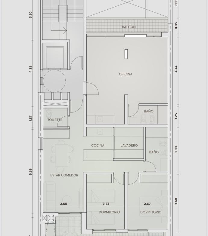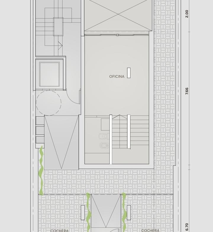 › El proyecto surge de la necesidad de dar respuesta de una manera simple y eficiente a la relación entre materialidad y asoleamiento. El requisito de proteger la fachada principal de la orientación Este es la que define la utilización del ladrillo como material principal para resolver toda la piel del edificio. La nobleza y plasticidad de este material permite resolver diversas situaciones a partir de diferentes combinaciones de uso. Es así que logra ser piel completamente opaca, parasol- cribado y permeable-, o baranda según sea necesario.