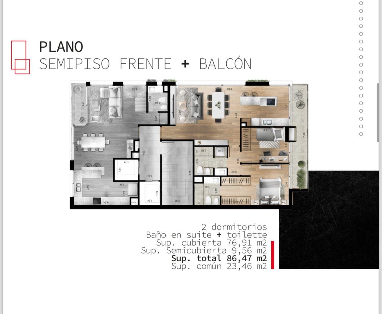 Pasando al intimo nos encontramos con 2 dormitorios, al frente con balcon corrido, placares empotrados. Un baño completo y el dormitorio restante con baño completo en suite y vestidor.