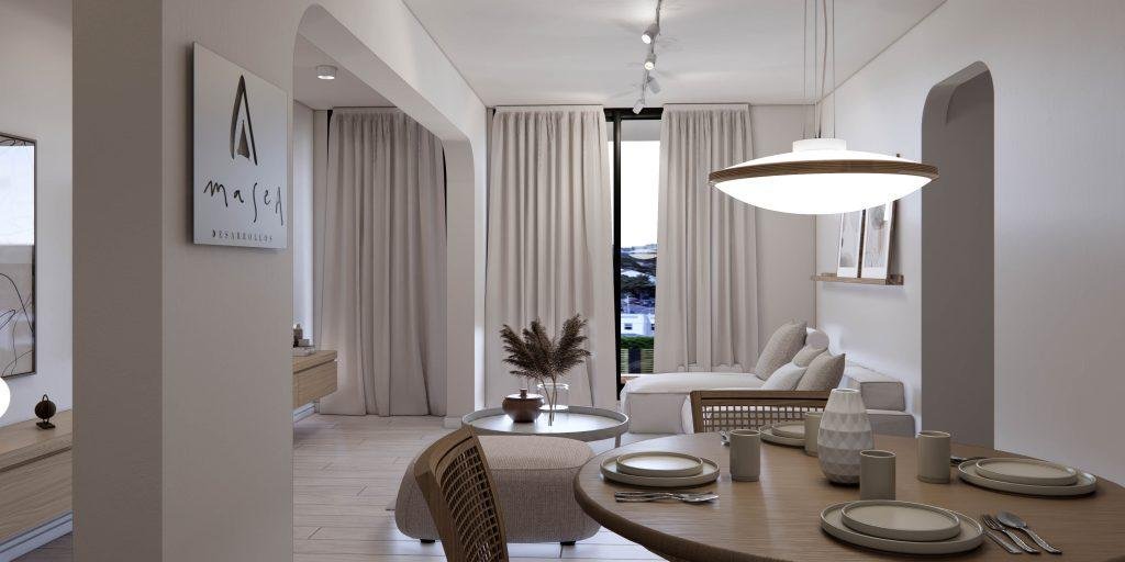 • PUERTAS: Puertas principales de ingreso a los departamentos, serán de macizas con cerradura de seguridad y las puertas interiores del departamento serán puertas placas y llevarán pintura semi-mate color blanco. Las carpinterías metálicas llevarán la protección anti-óxido y tres manos de pintura sintética