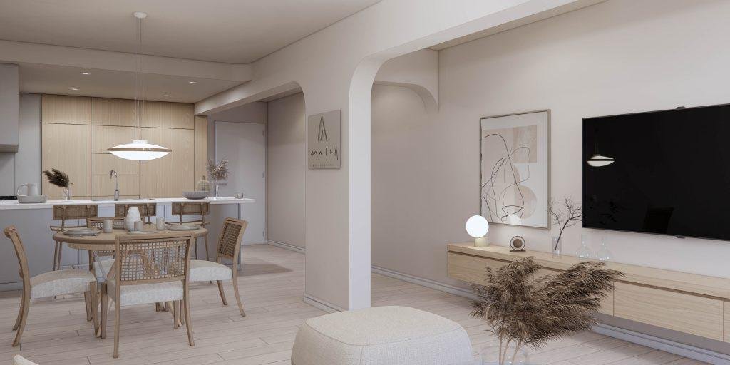 • LIVING Y DORMITORIO: Porcelanatos o pisos vinilicos y pre instalación para aire acondicionado. Placares completos con frente de melamina 18 mm y kit aluminio para sistema corredizo. En unidades de 2 y 3 dormitorios calefacción por radiadores y agua caliente a través de caldera dual.