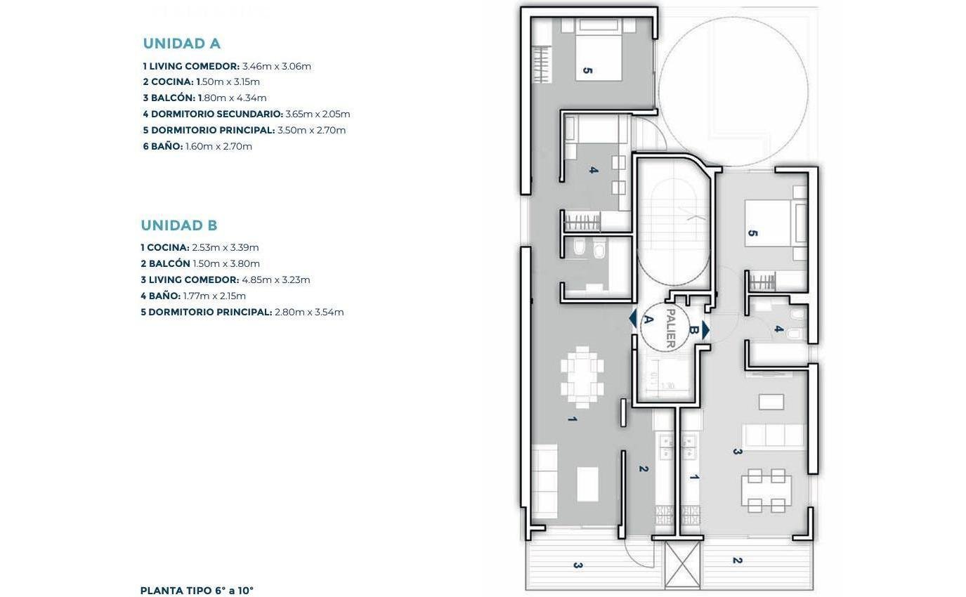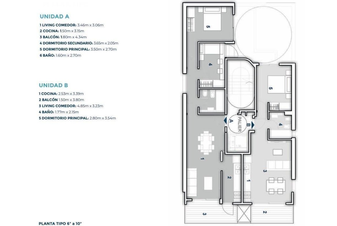 – 6to piso al 10mo las plantas estan divididas en semipisos de 1 y 2 dormitorios . Unidad “A” 2 dormitorios y unidad “B” 1 dormitorio. Ambos con disposicion al frente y ventilacion al contrafrente obteniendo ventilacion cruzada. Monoambiente “A” – 33,6 m2