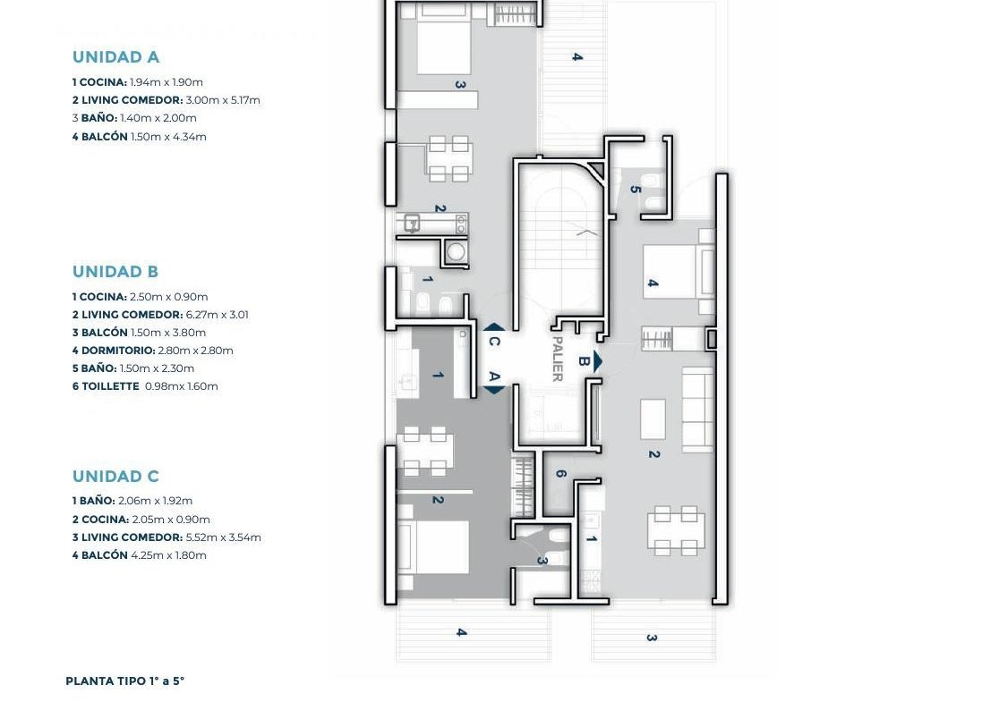 – 1er piso al 5to vamos a encontrar 3 unidades de tipo monoambientes “A” al frente, C” al contrafrente y “B” que da al frente y contrafrente otorgando ventilacion cruzada.