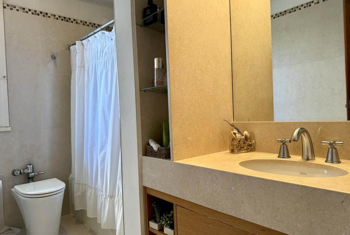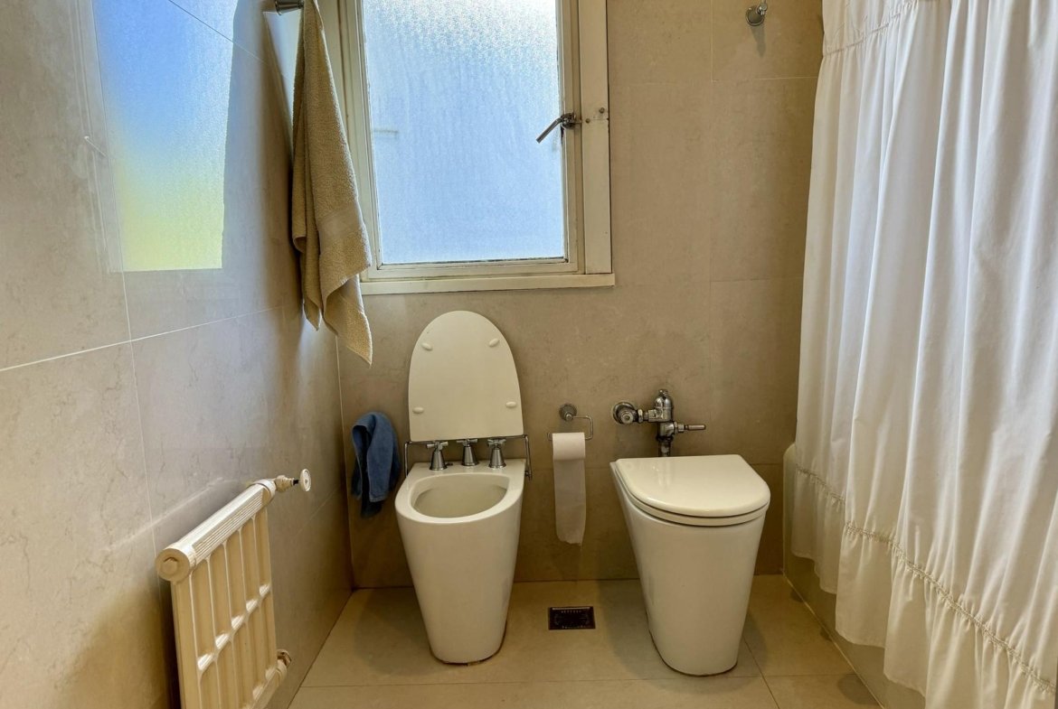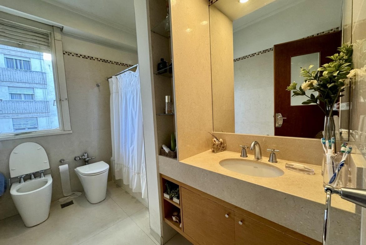 Baño principal: piso y revestimientos de Porcellanato español de placas grandes, griferia FV, bidet e inodoro linea Marina de Ferrum.