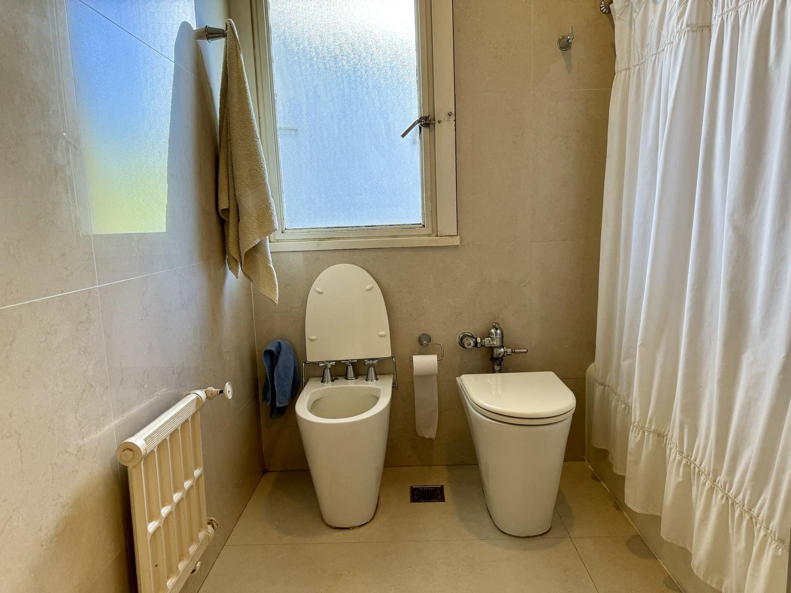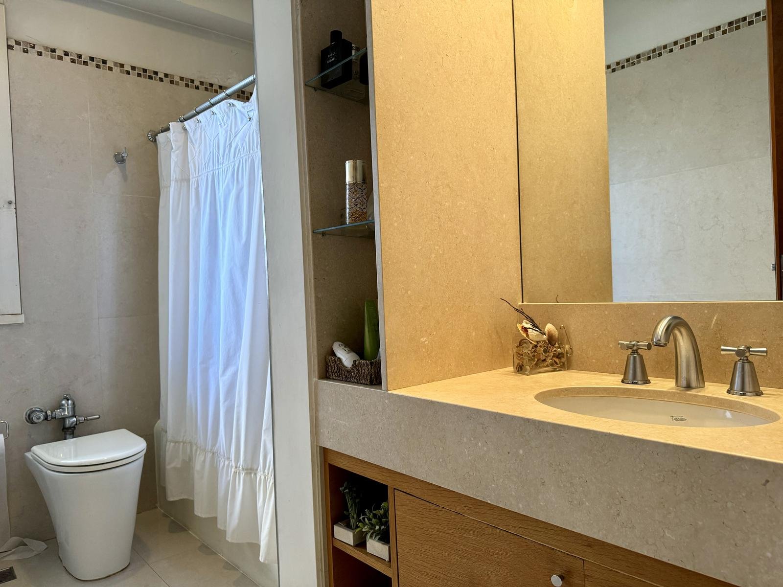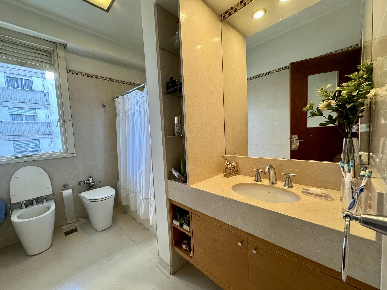 Baño principal: piso y revestimientos de Porcellanato español de placas grandes, griferia FV, bidet e inodoro linea Marina de Ferrum.