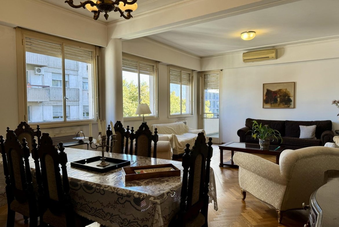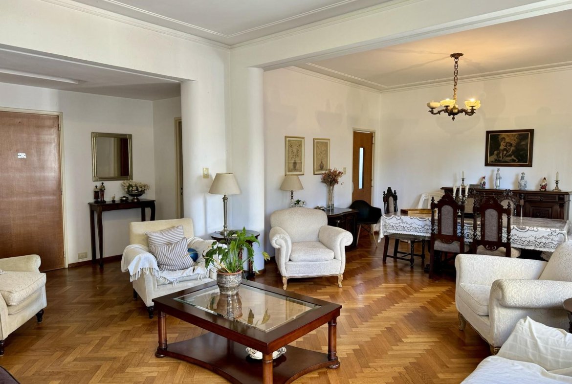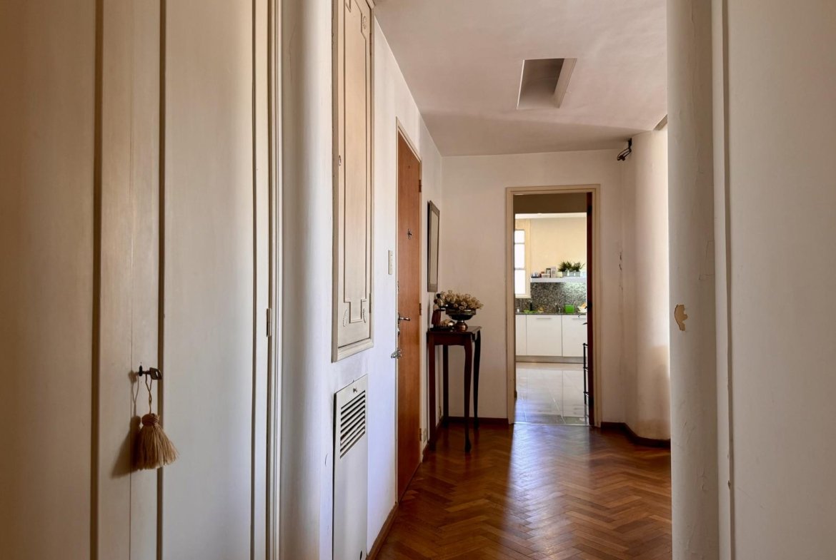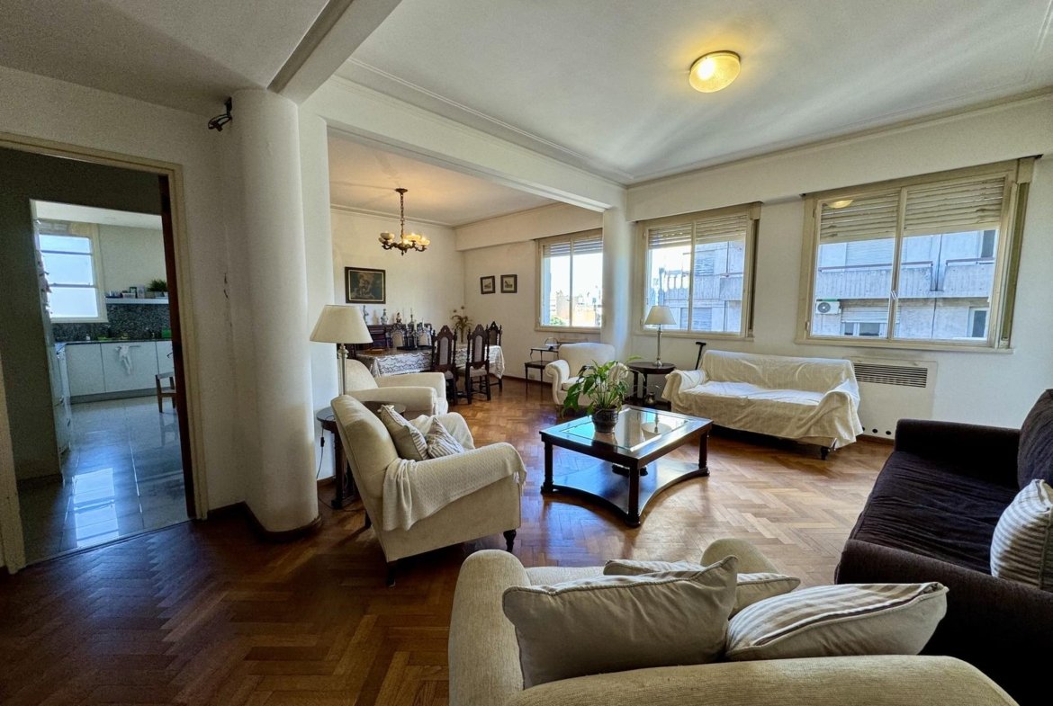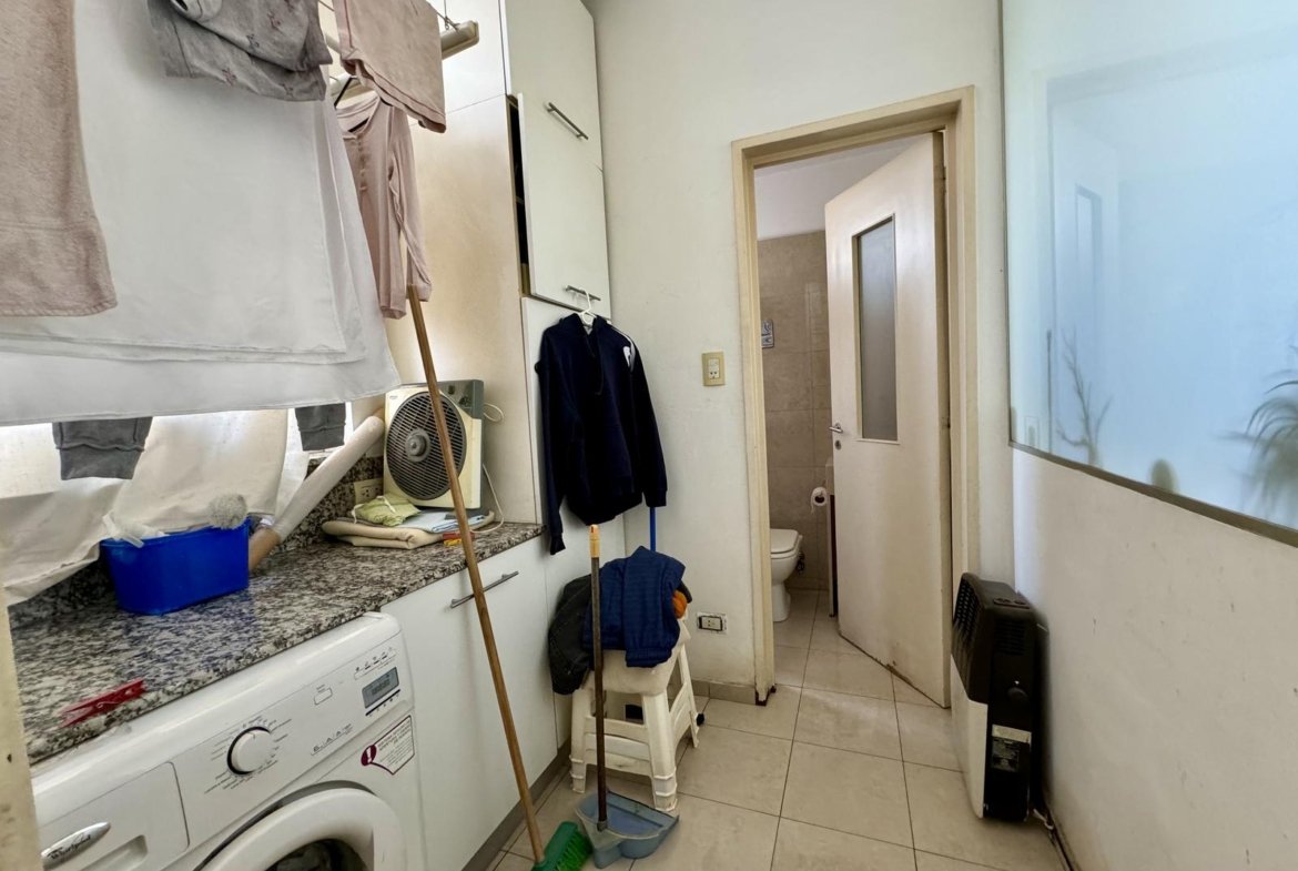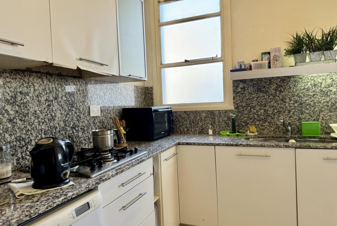 Ubicado en la 5ta planta del edificio, articulado en semipiso, esta unidad nos recibe con un hall, que nos introduce al enorme ambiente principal social, permitiendo el desarrollo del living, y el comedor principal. La cocina, con excelente luminosidad y ventilación natural, se encuentra totalmente reciclada, desde sus cañerías, mobiliario, horno y anafe por separado, y pisos. A continuación de la misma, lavadero sectorizado seguido por un toilette de servicio, y el espacio de comedor diario de generosas dimensiones.