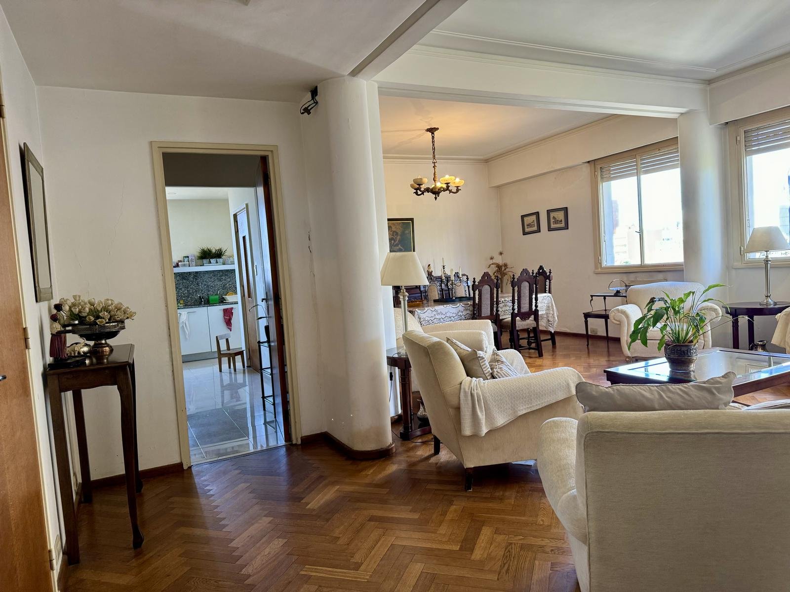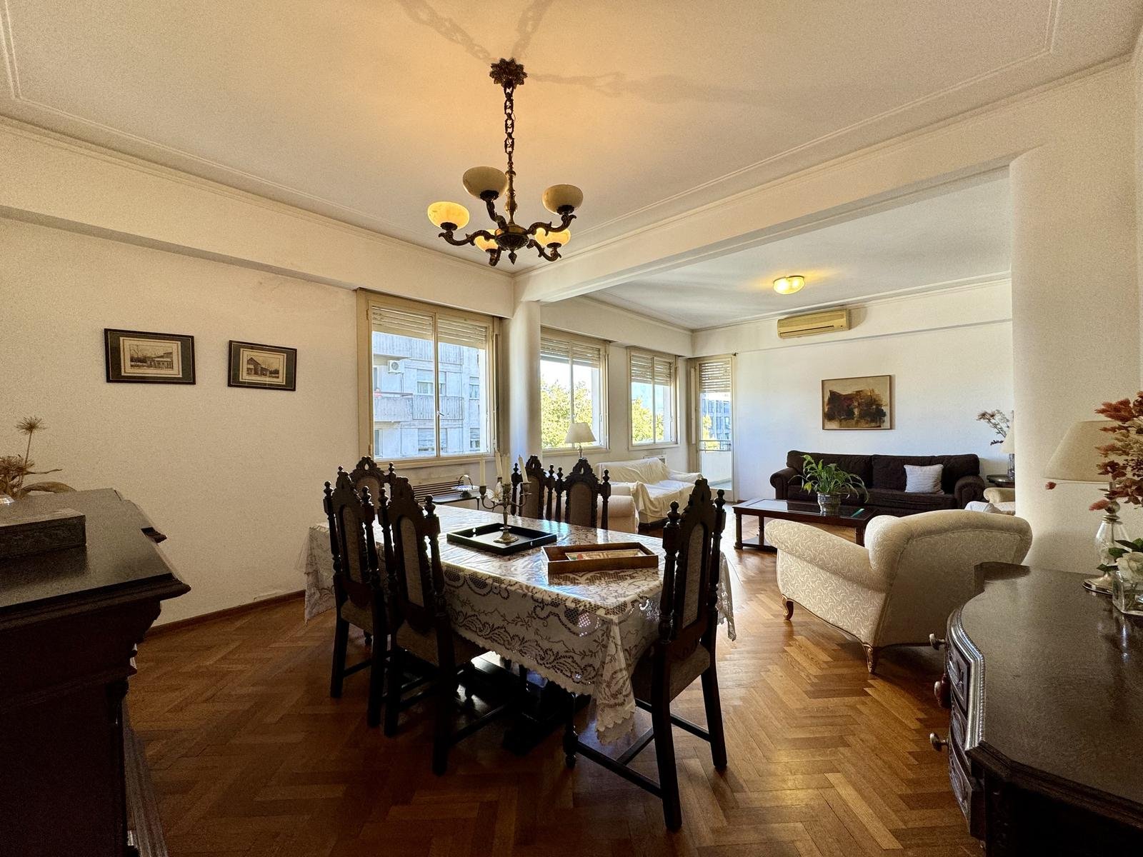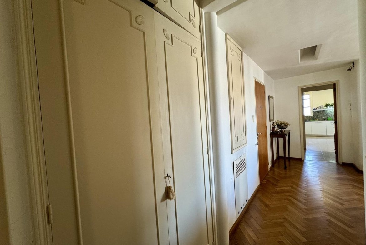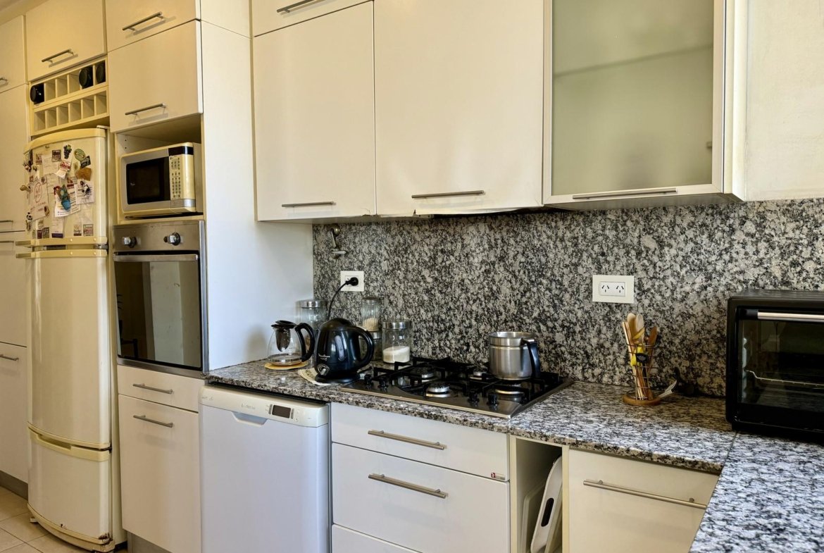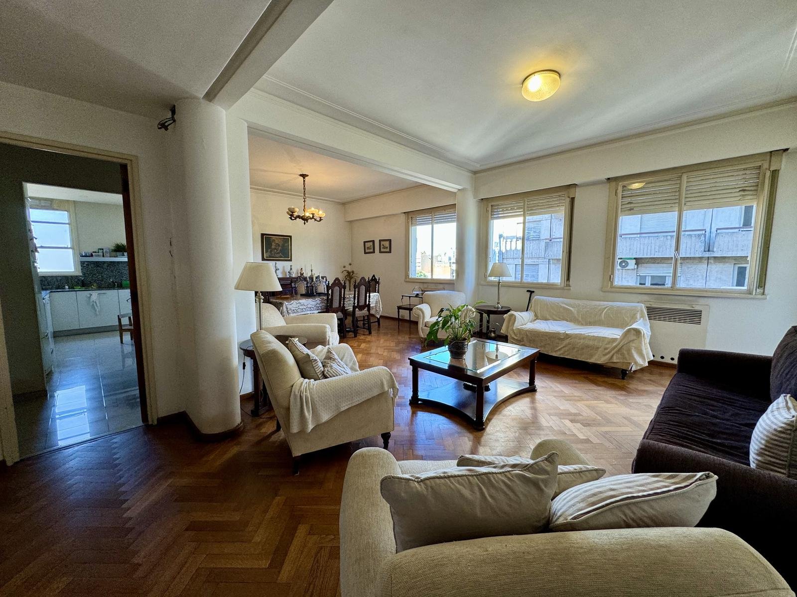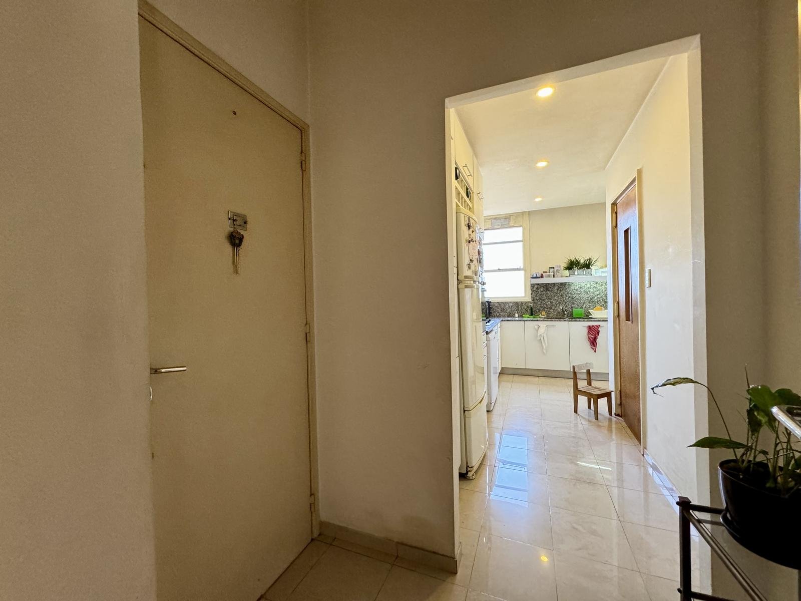 Ubicado en la 5ta planta del edificio, articulado en semipiso, esta unidad nos recibe con un hall, que nos introduce al enorme ambiente principal social, permitiendo el desarrollo del living, y el comedor principal. La cocina, con excelente luminosidad y ventilación natural, se encuentra totalmente reciclada, desde sus cañerías, mobiliario, horno y anafe por separado, y pisos. A continuación de la misma, lavadero sectorizado seguido por un toilette de servicio, y el espacio de comedor diario de generosas dimensiones.
