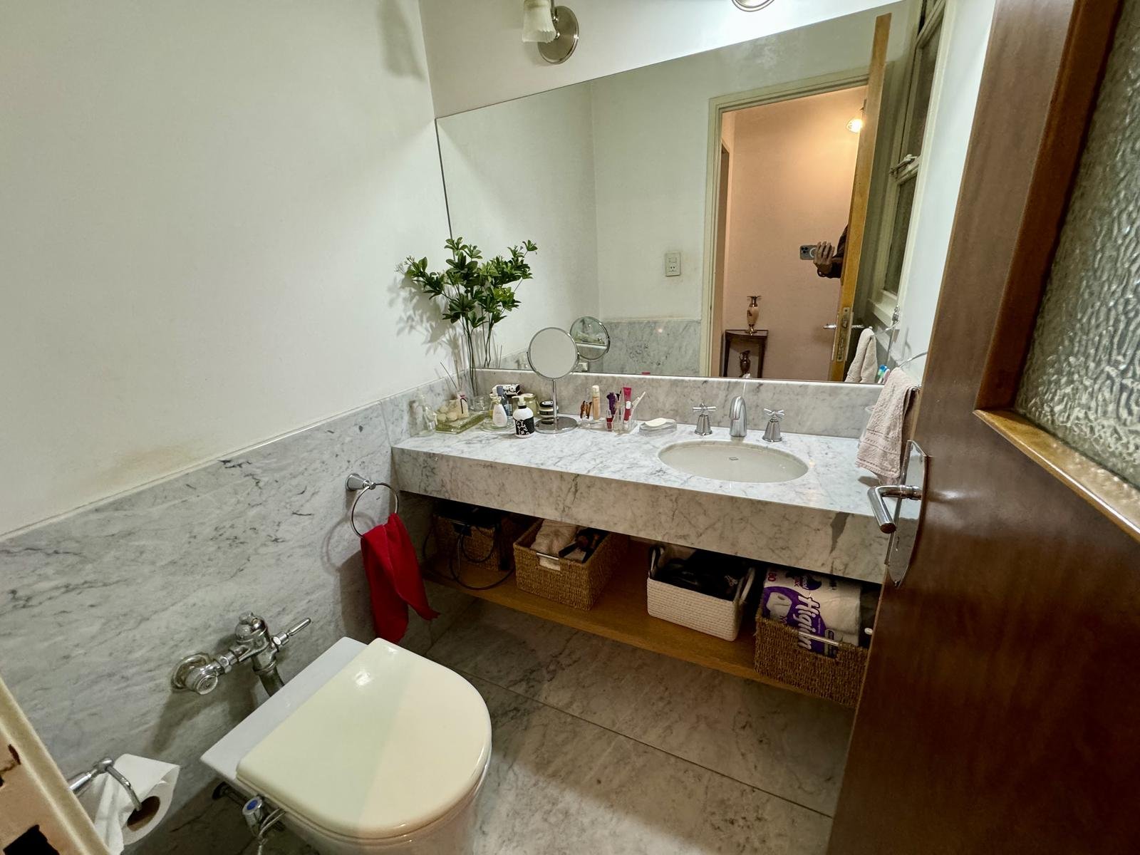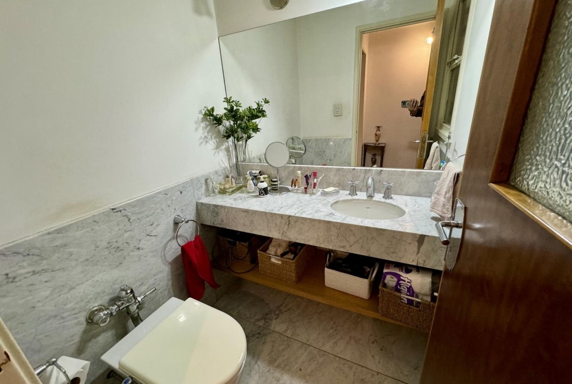 Toilette: Mármol carrara, grifería FV, sanitarios Ferrum.