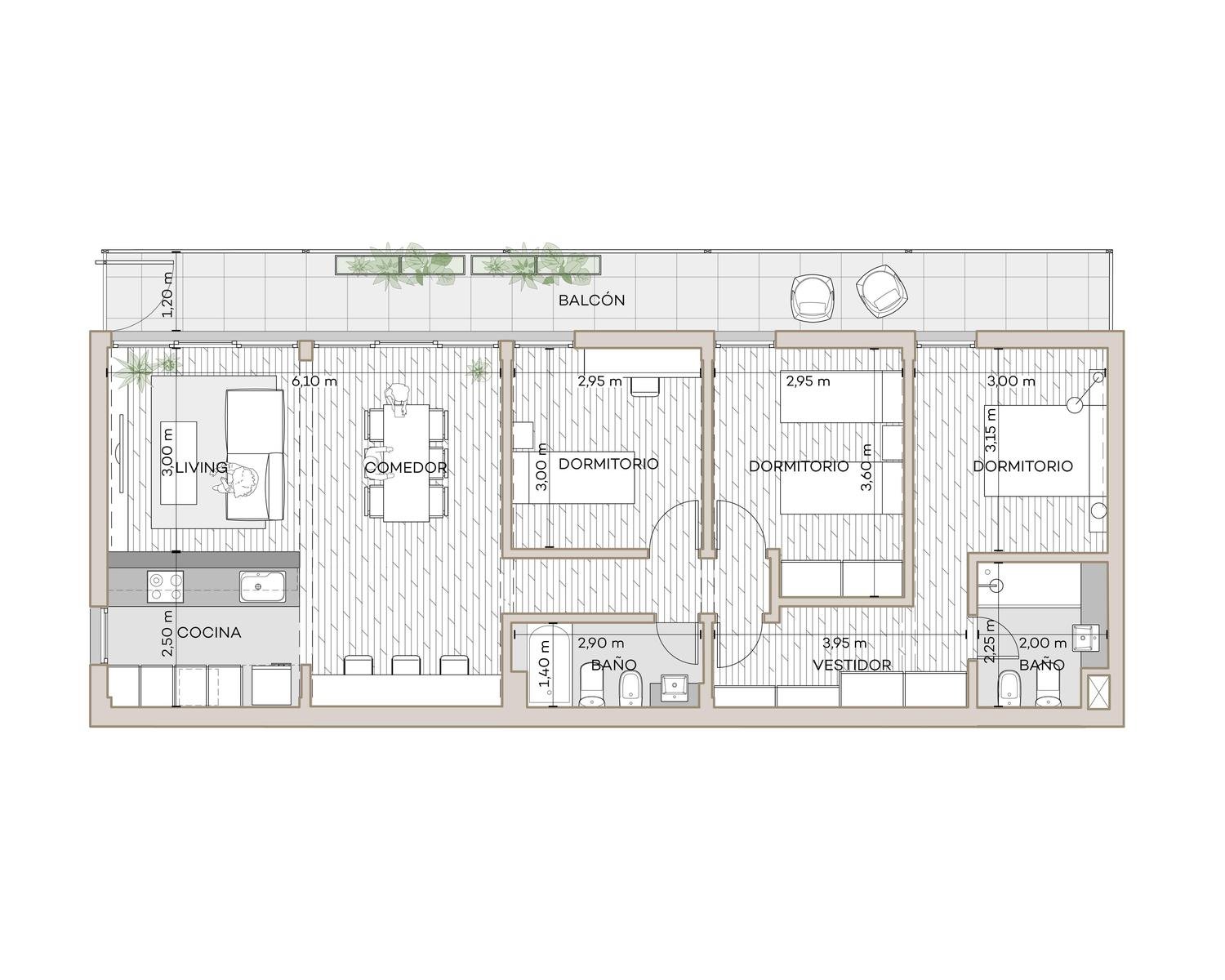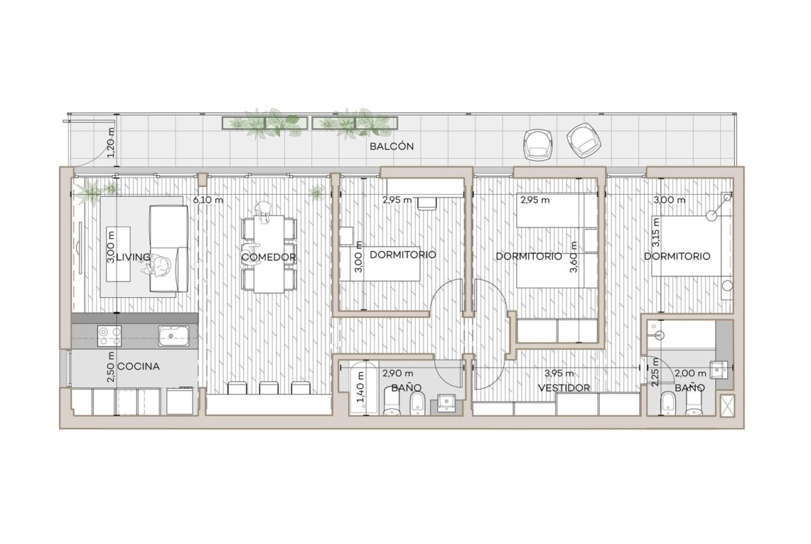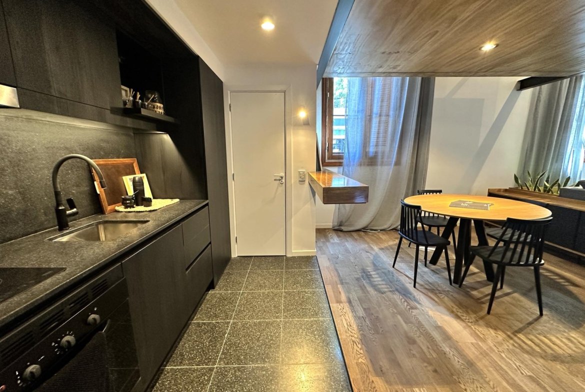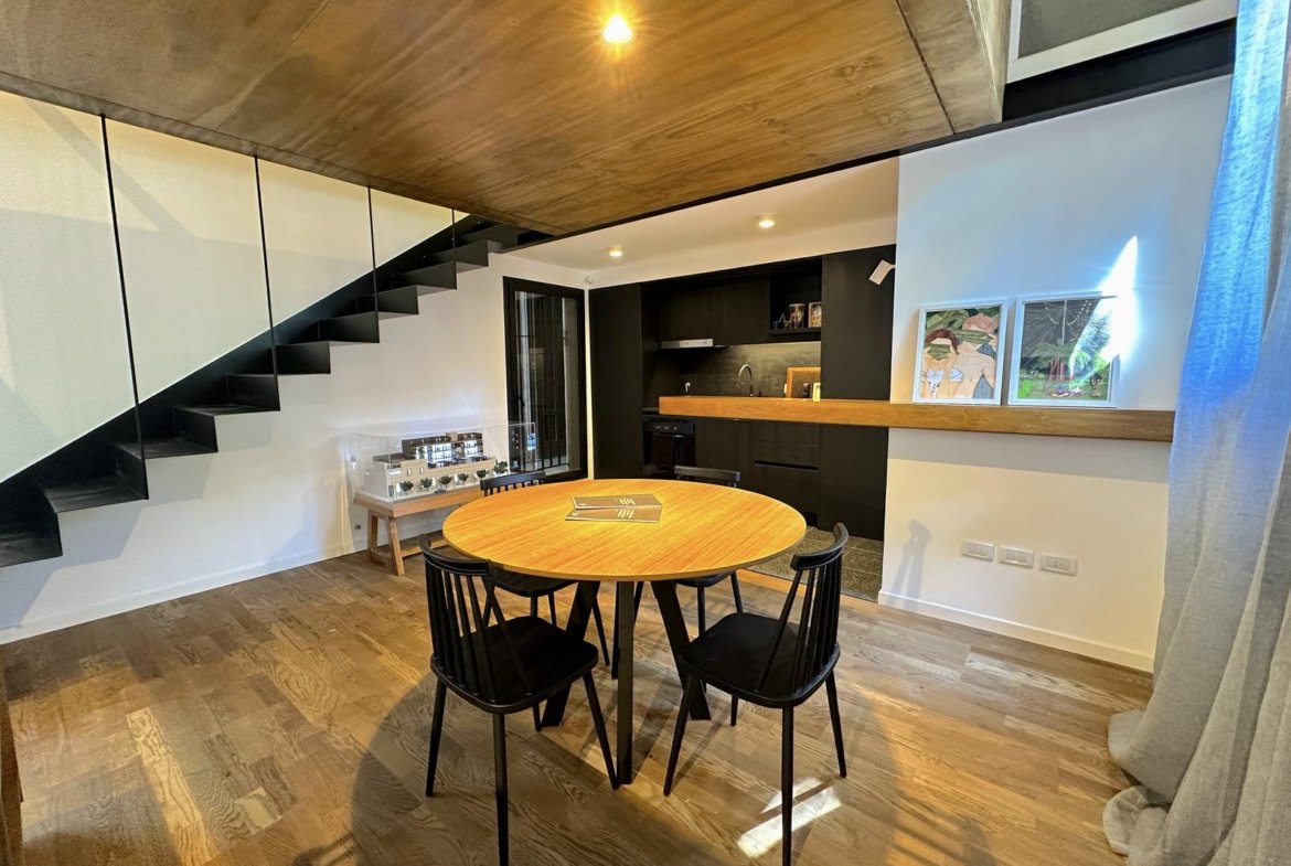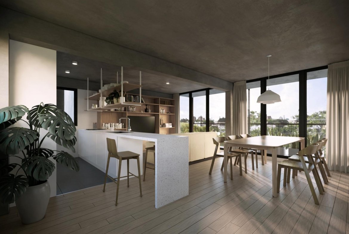 Unidad de 113,70 m2 totales, ubicado en el primer piso. Ambiente social principal integrado a la cocina, totalmente equipada, amoblamiento bajomesada y alacena completo, horno y anafe por separado, con purificador.