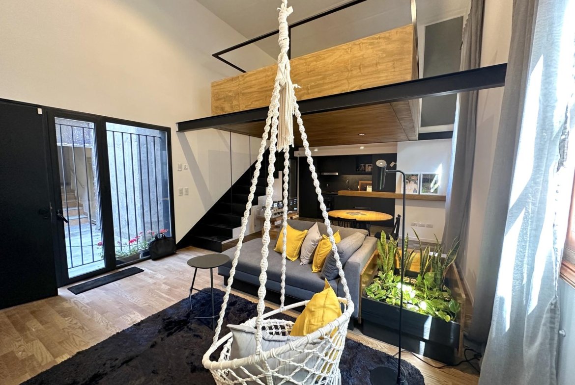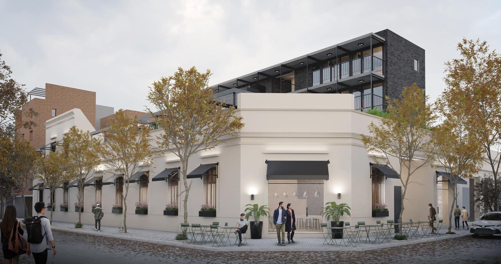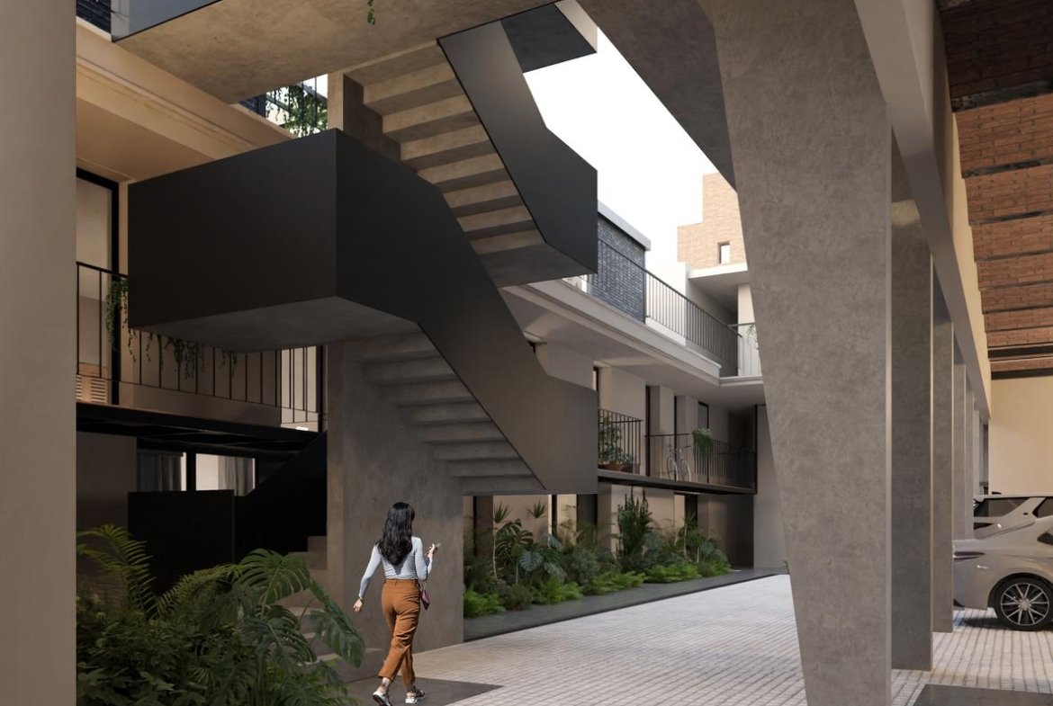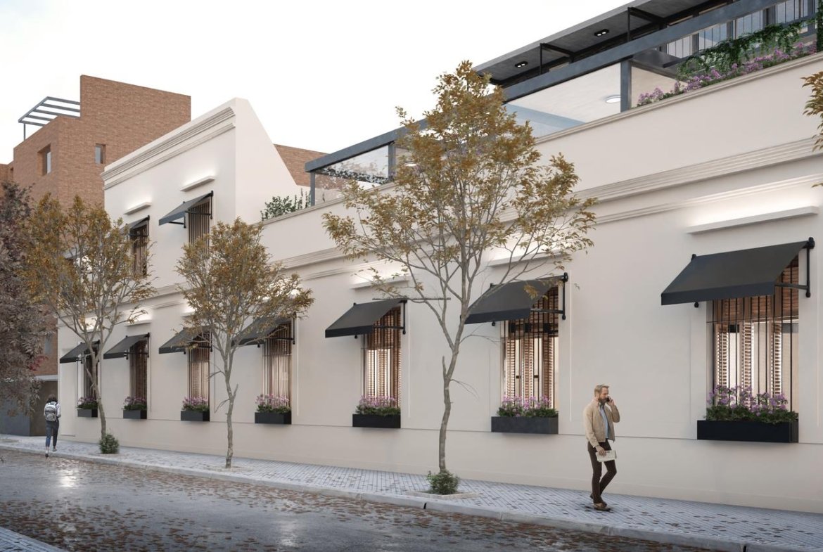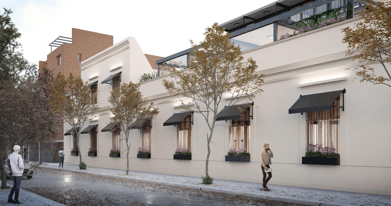 Sector original del edificio: 4 departamentos a calle Jujuy, Lofts con entrepisos y espacios de doble altura. Posibilidad de uso mixto, como vivienda o estudio profesional. Los otros 3 departamentos alojados en este espacio preexistente, tienen 2 dormitorios, opción balcón con terraza, y patio.