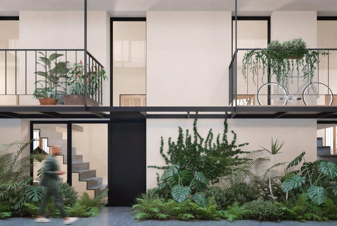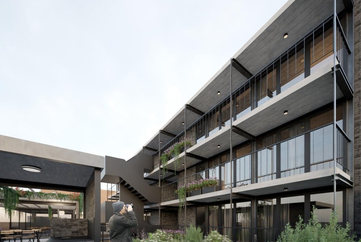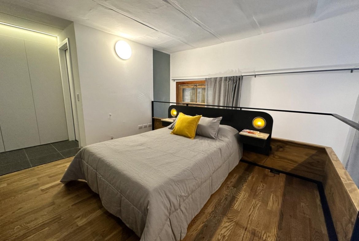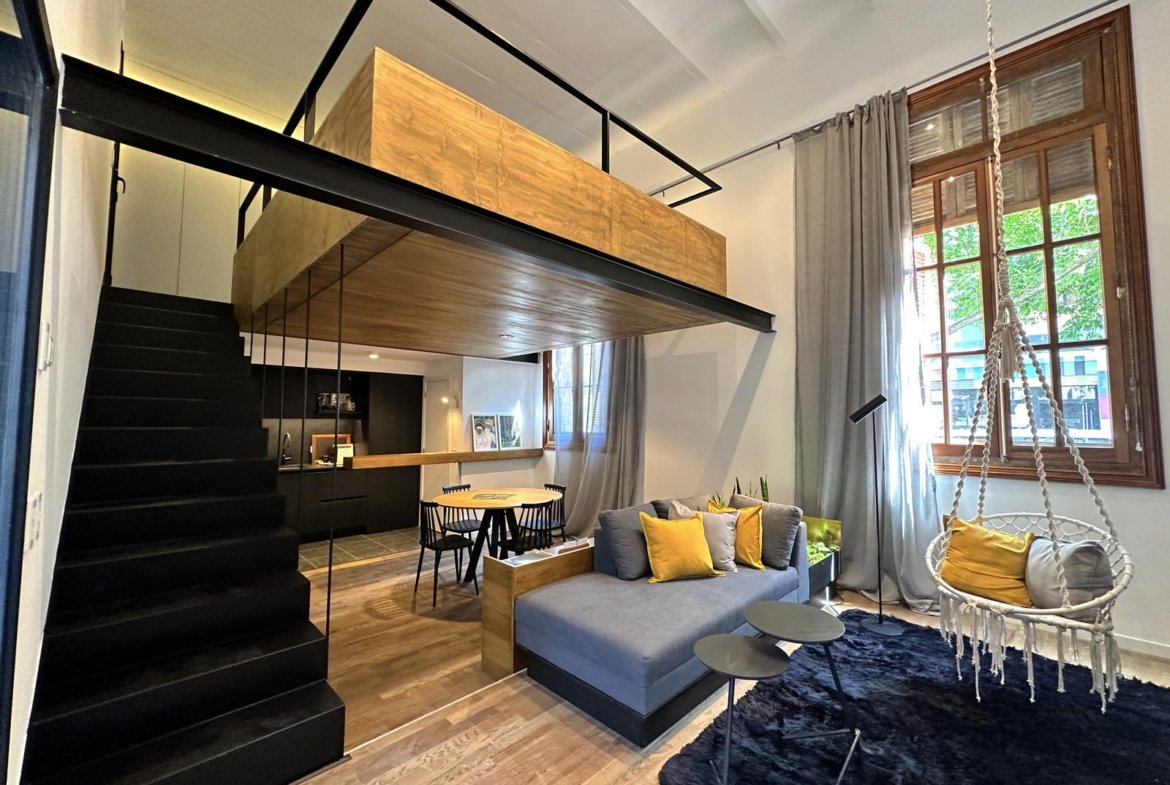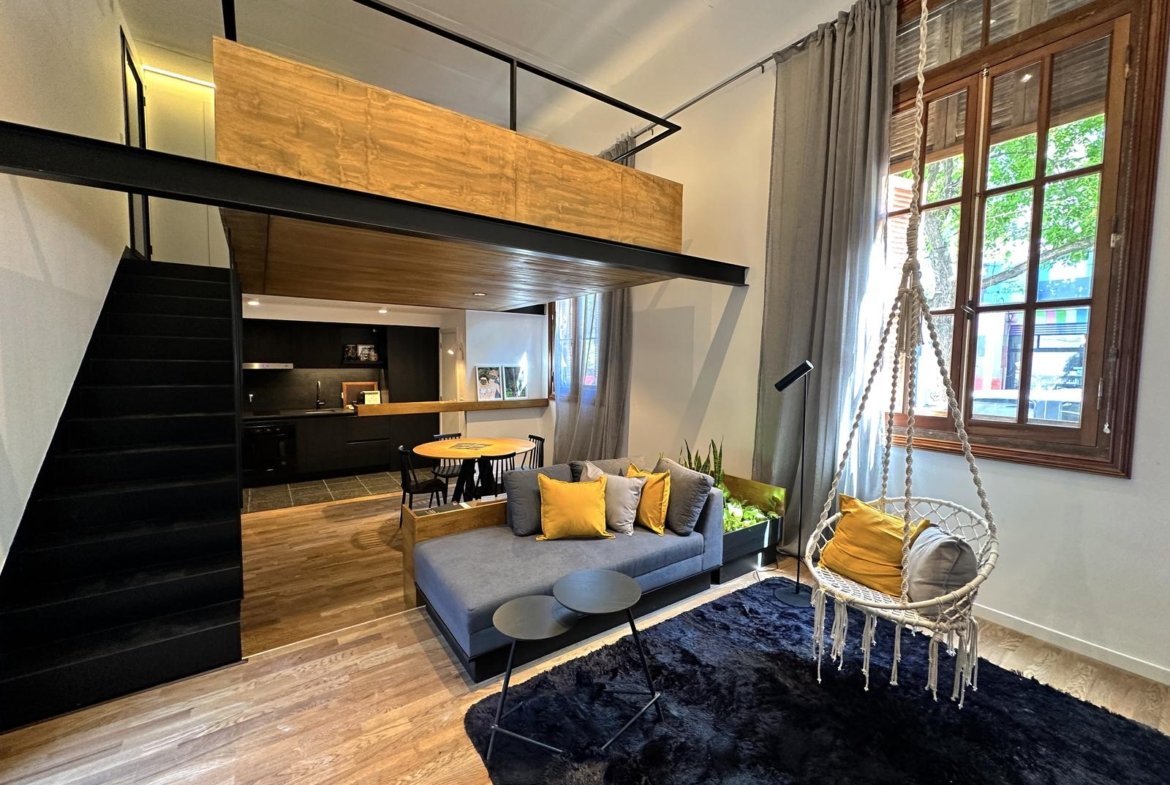 Sector original del edificio: 4 departamentos a calle Jujuy, Lofts con entrepisos y espacios de doble altura. Posibilidad de uso mixto, como vivienda o estudio profesional. Los otros 3 departamentos alojados en este espacio preexistente, tienen 2 dormitorios, opción balcón con terraza, y patio.