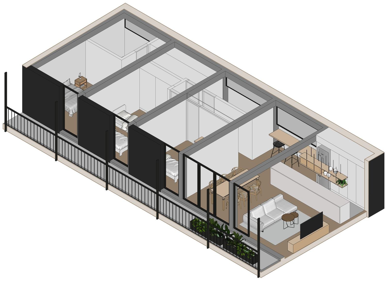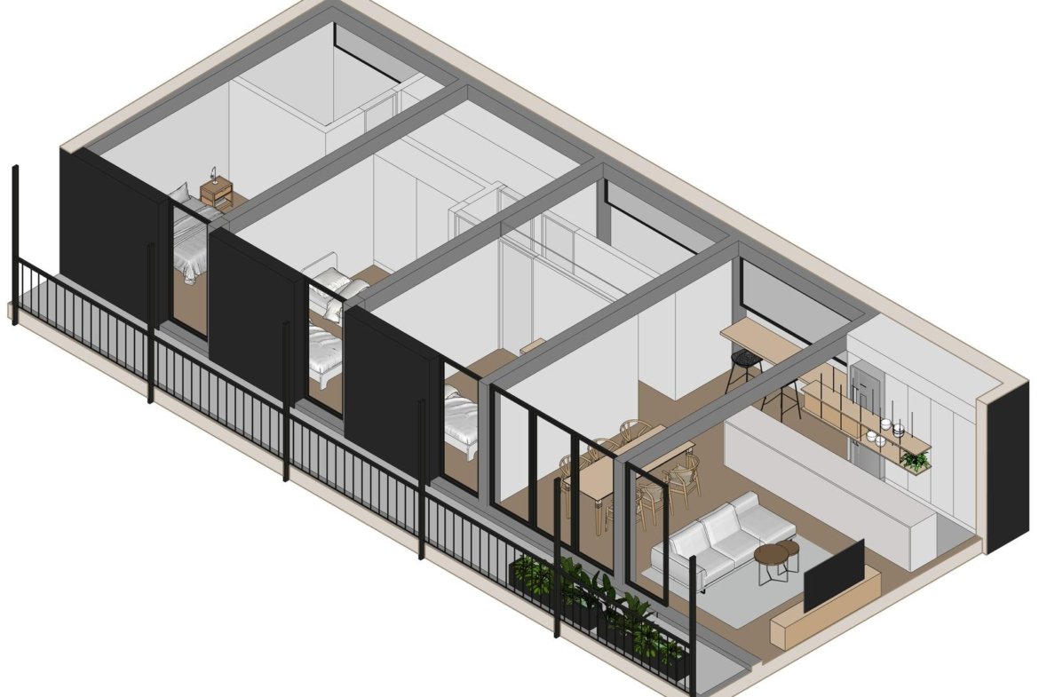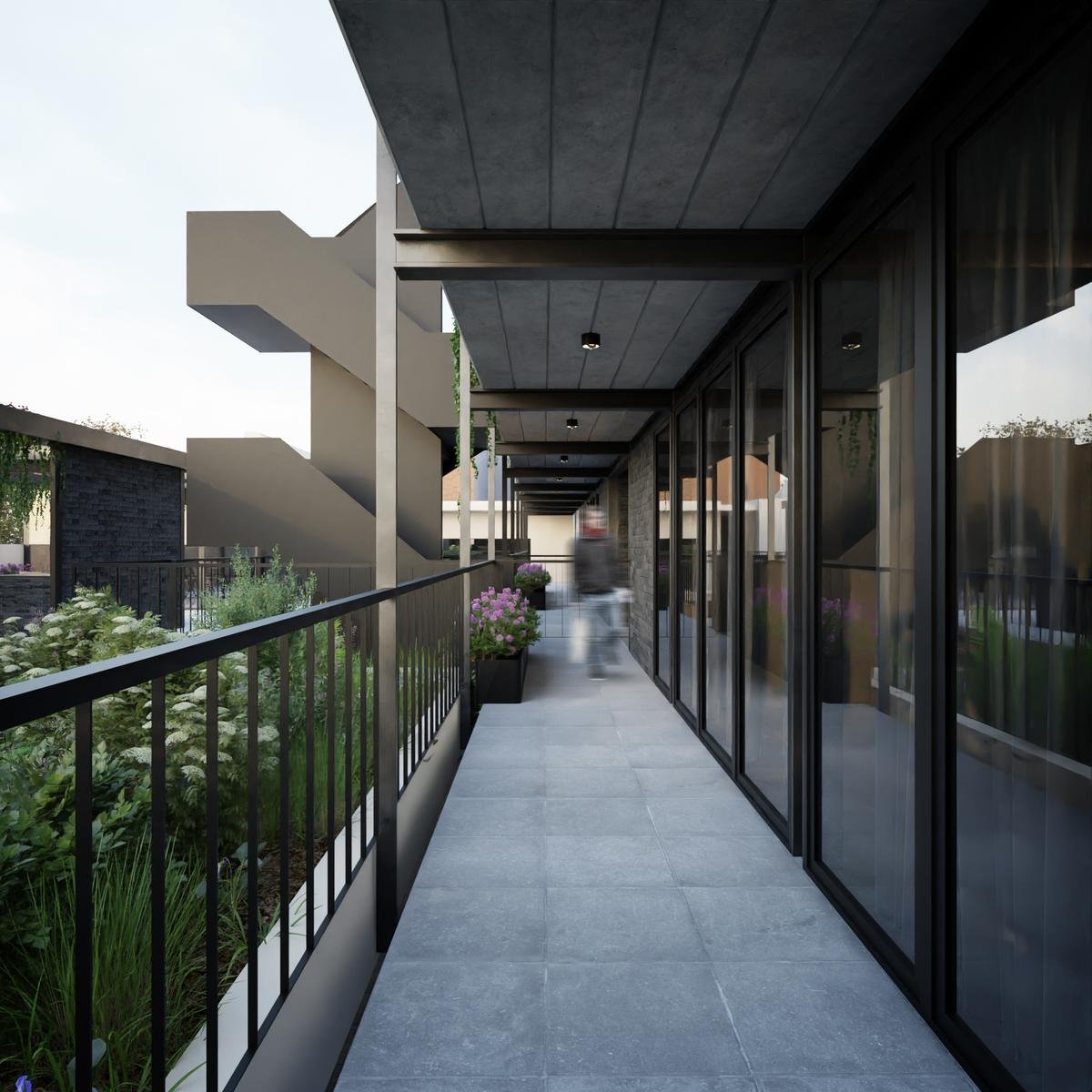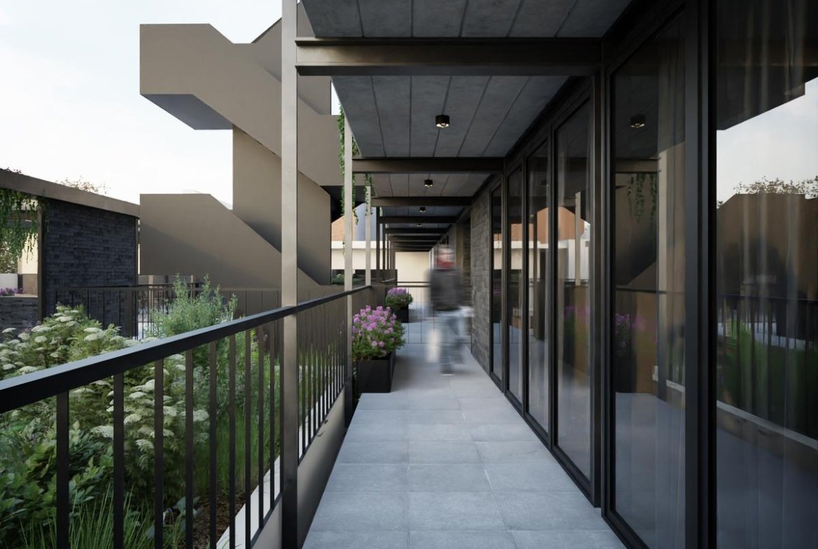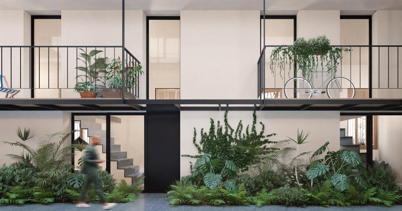 Sector original del edificio: 4 departamentos a calle Jujuy, Lofts con entrepisos y espacios de doble altura. Posibilidad de uso mixto, como vivienda o estudio profesional. Los otros 3 departamentos alojados en este espacio preexistente, tienen 2 dormitorios, opción balcón con terraza, y patio.
