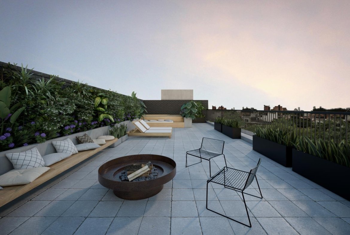 Generoso balcón terraza de casi 20 m2, orientado al Norte, con vistas al patio central verde del edificio.
