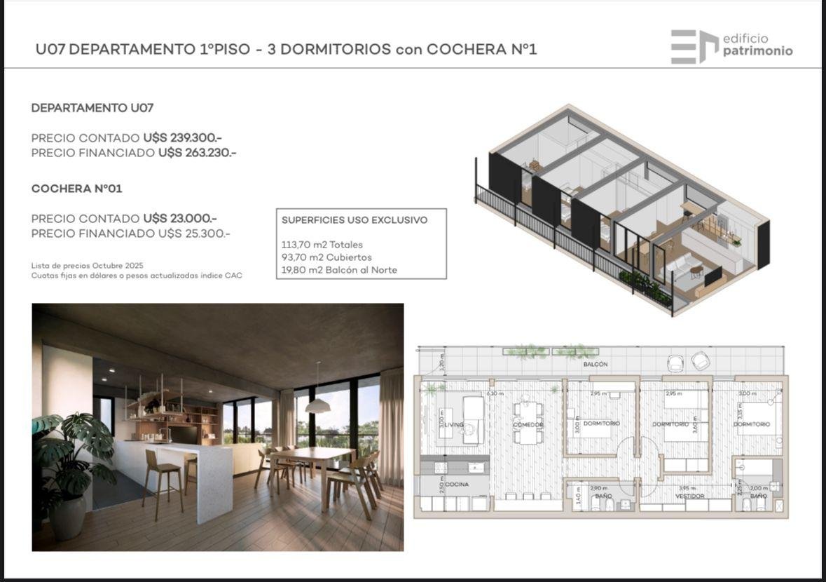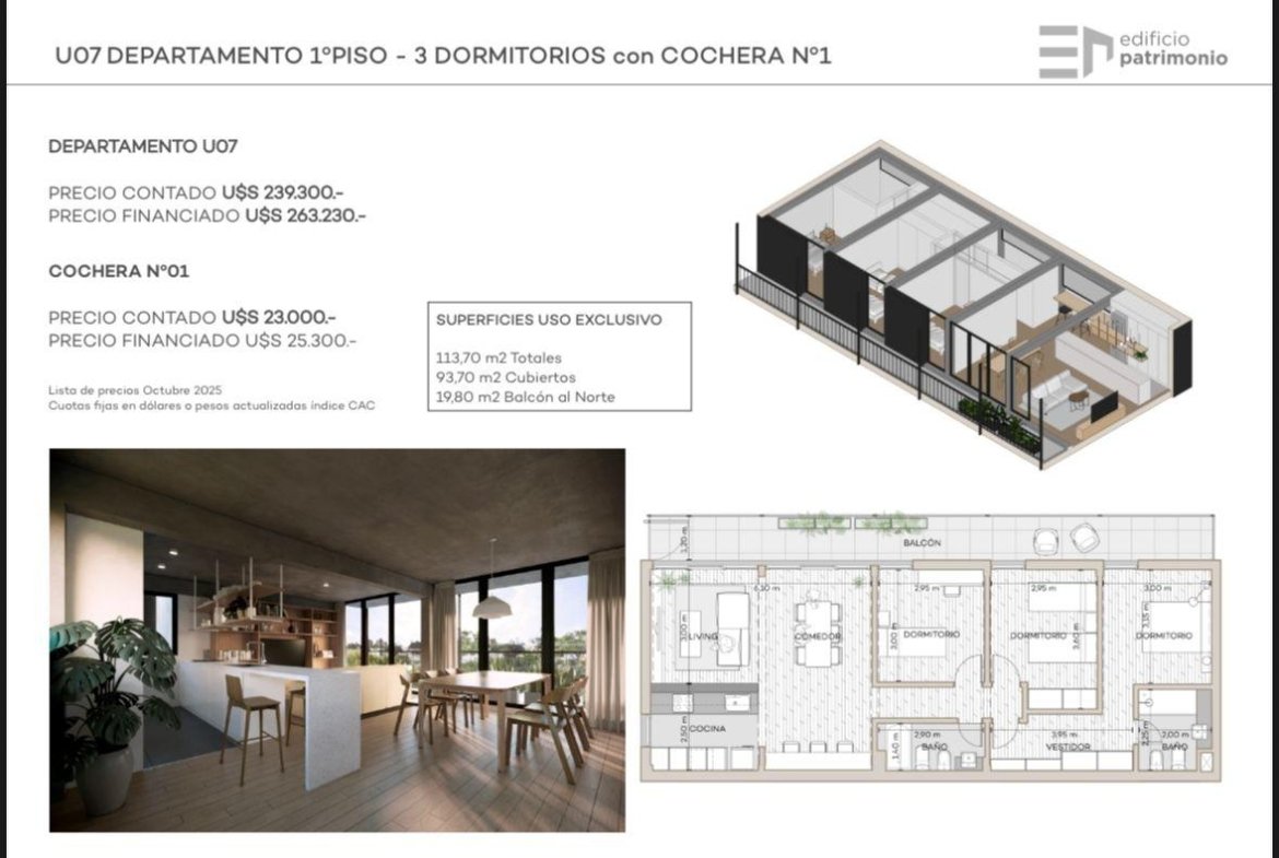 Forma de pago: Anticipo del 45%, saldo en 10 cuotas en USD mensuales, iguales y consecutivas o en Pesos actualizados al índice C.A.C.