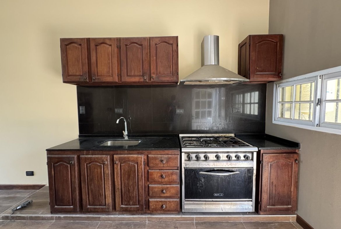 La cocina, integrada al living-comedor cuanta con muebles de roble, cocina de estilo industrial marca Morelli y campana purificadora de aluminio. Seguido a esta daremos con el patio seco donde se ubica el lavadero y parrillero.