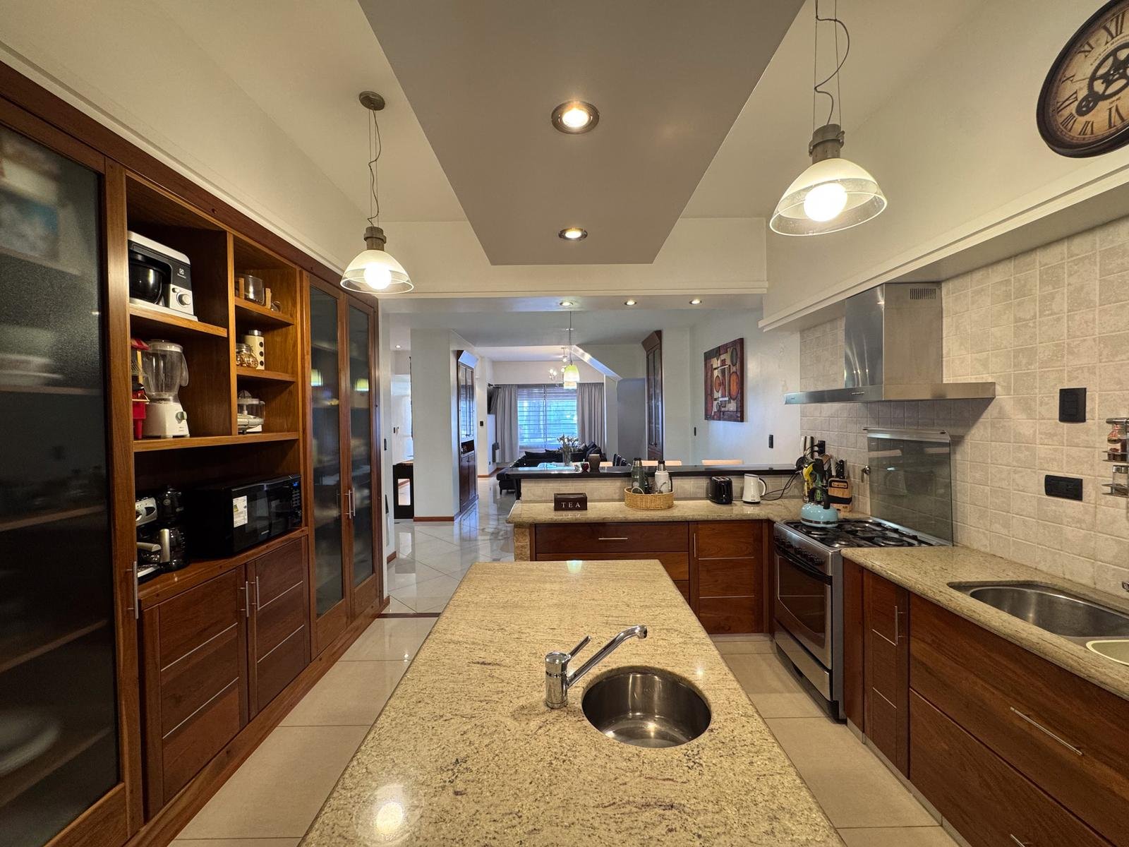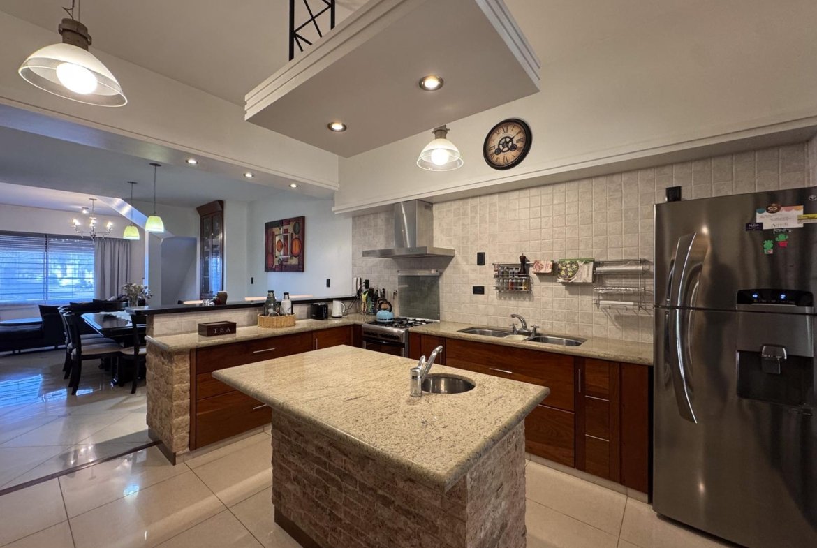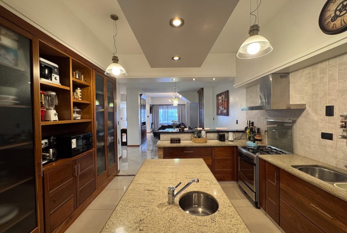 – Doble bacha en amplio mesada, bacha adicional en isla y gran espacio bajo mesada con muebles de madera.