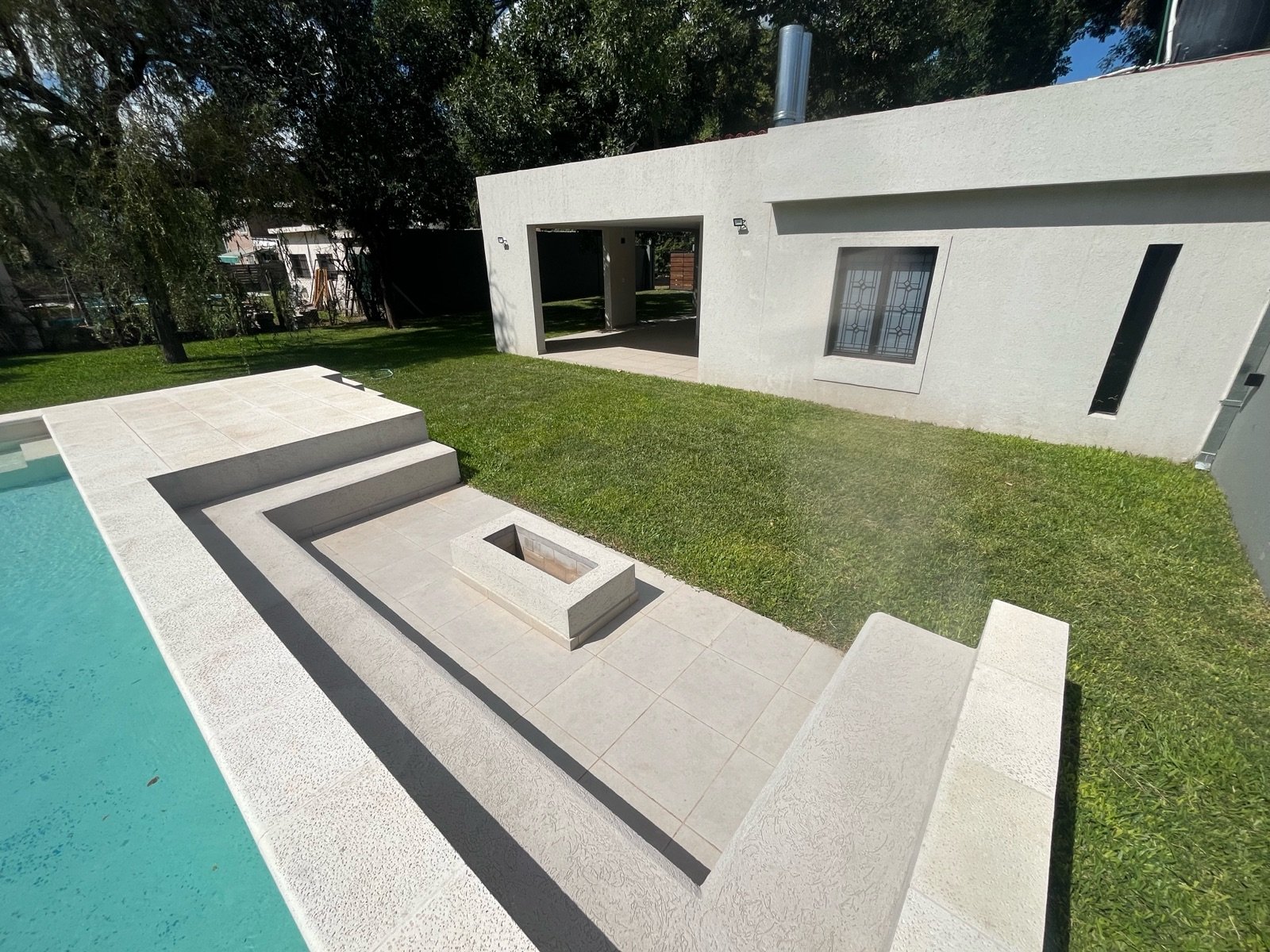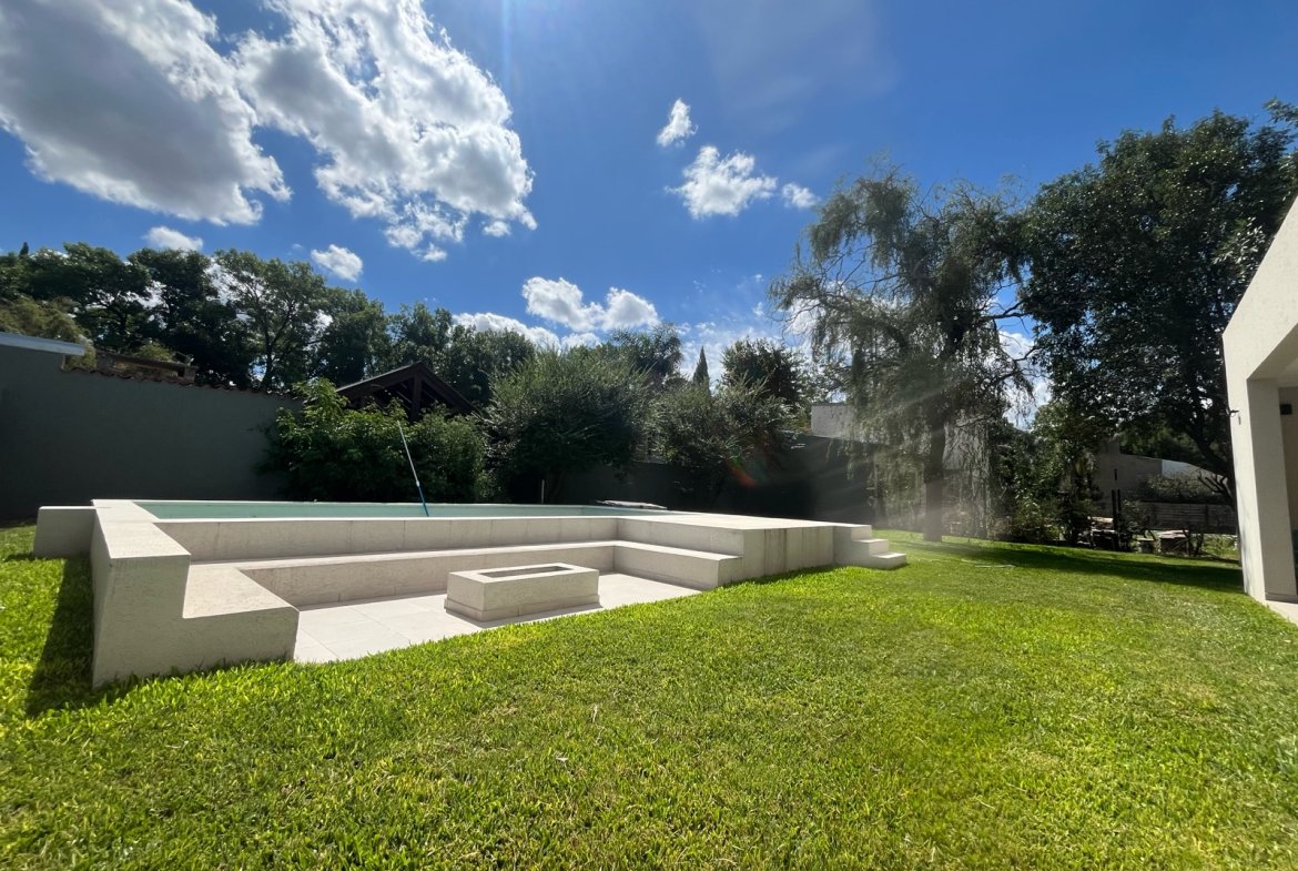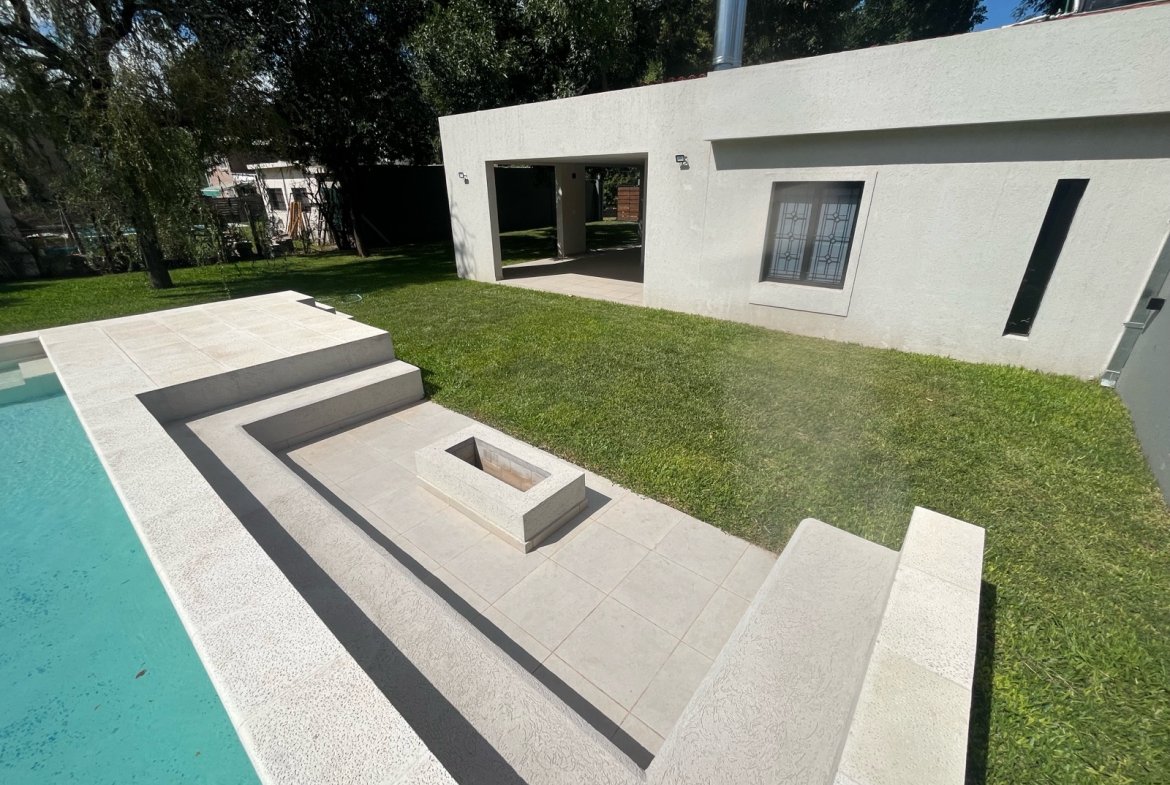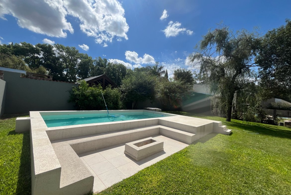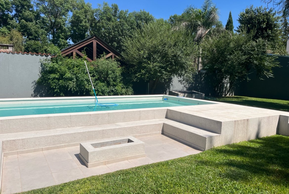 En el exterior se destaca una piscina de 32 m², acompañada por solárium y fogonero, creando un espacio ideal para disfrutar al aire libre en un entorno verde y relajado.