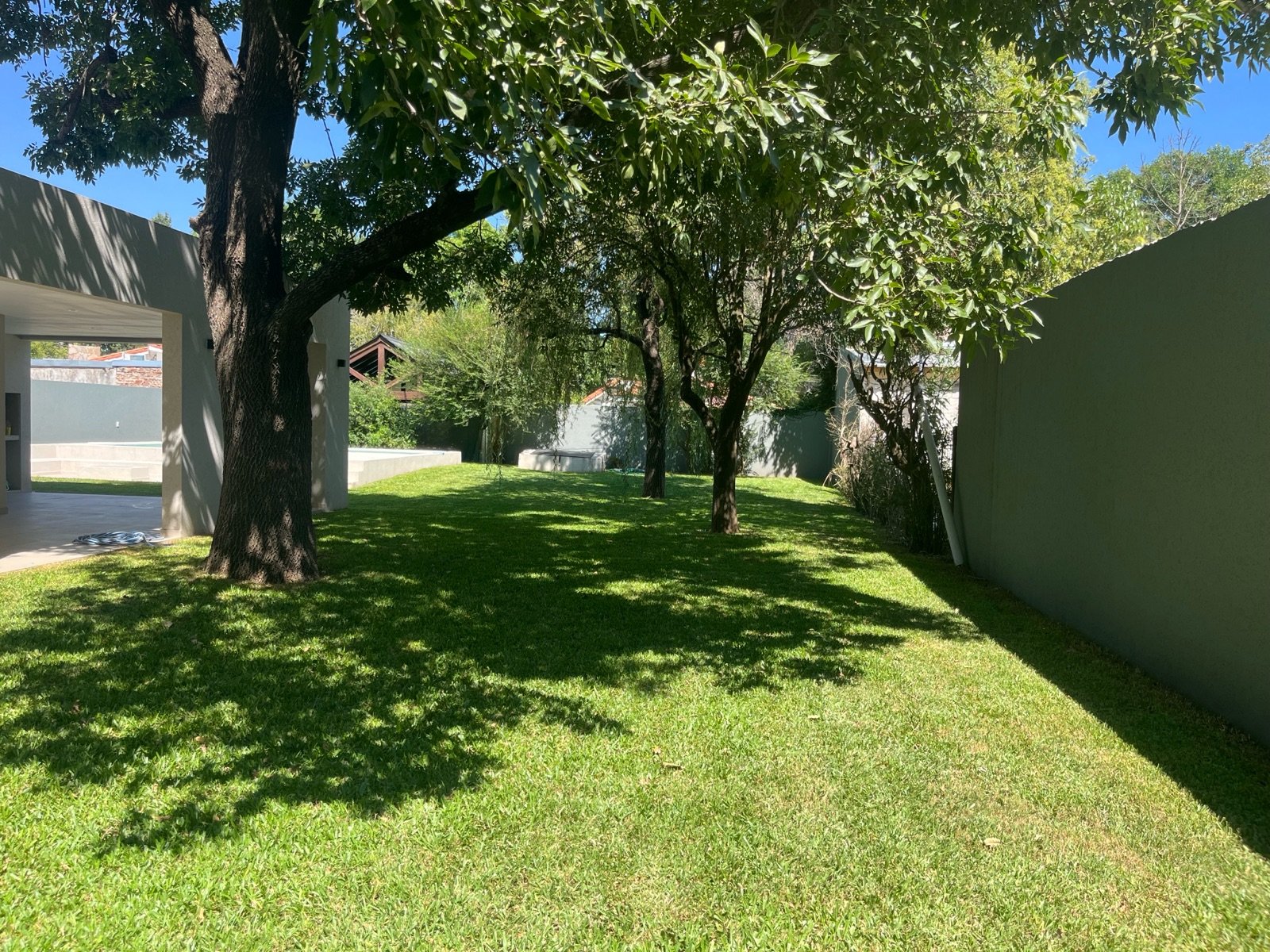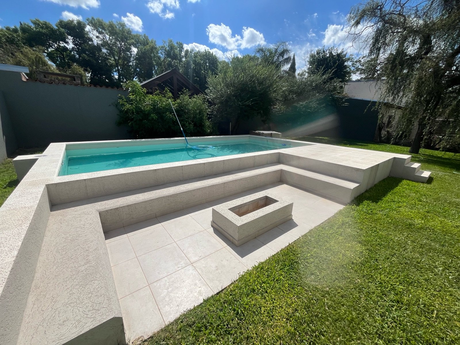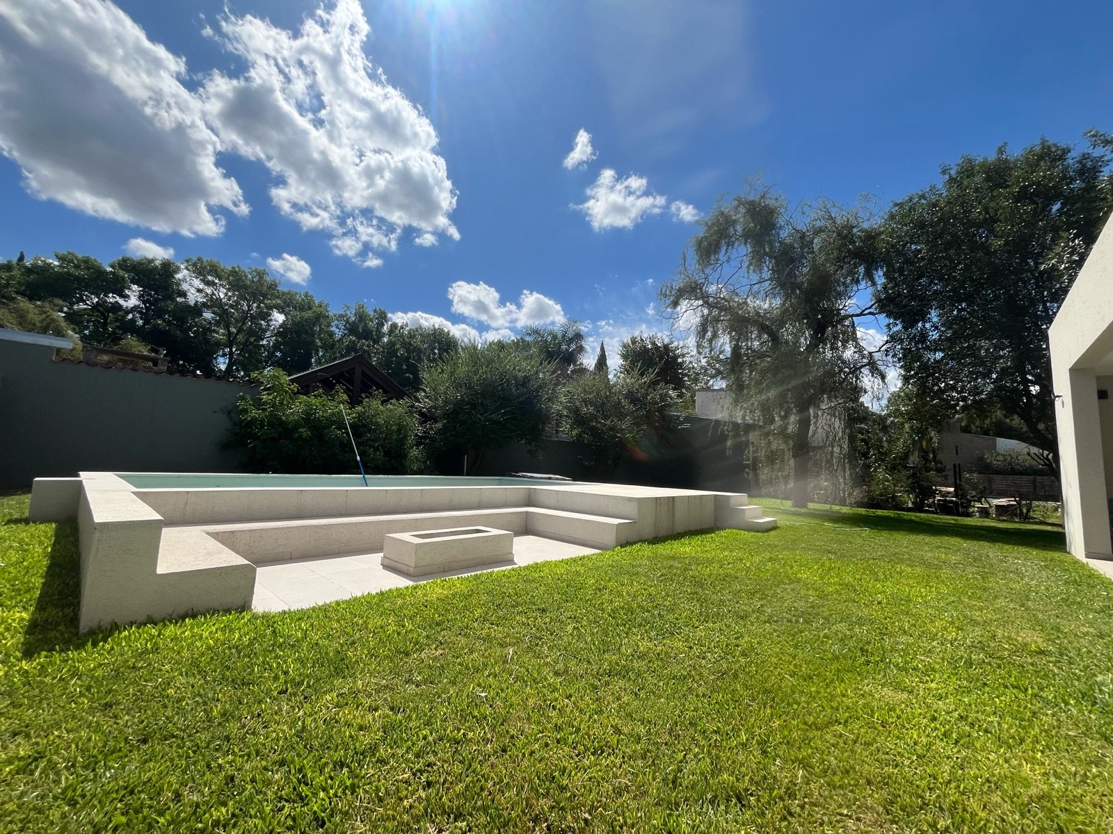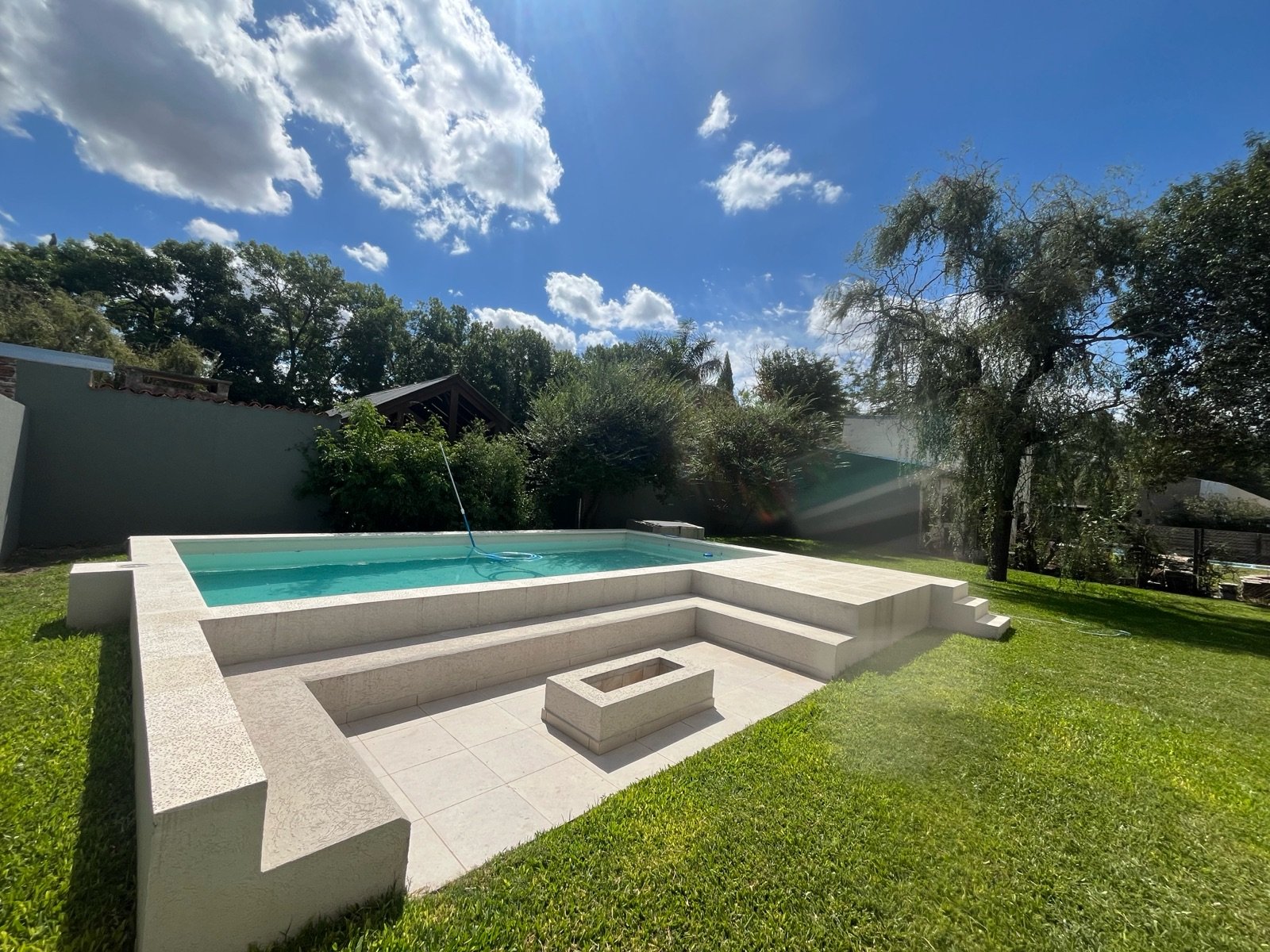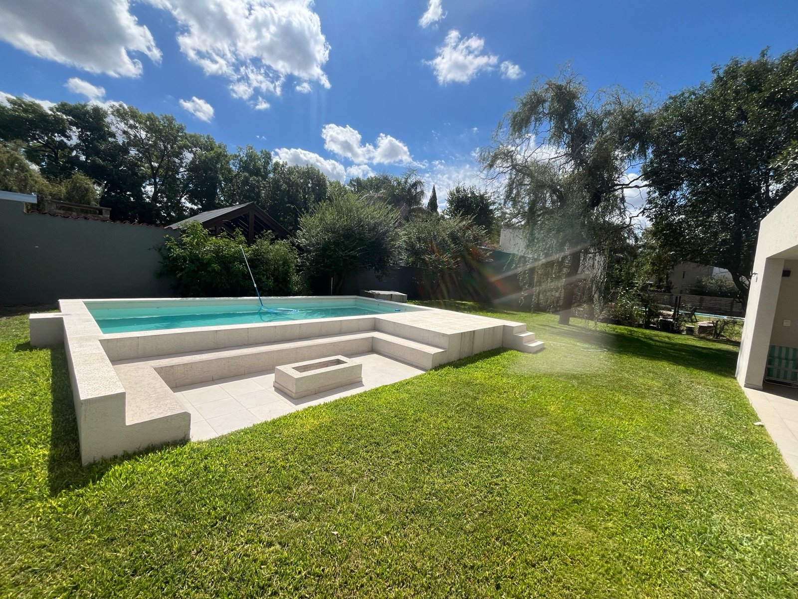 En el exterior se destaca una piscina de 32 m², acompañada por solárium y fogonero, creando un espacio ideal para disfrutar al aire libre en un entorno verde y relajado.
