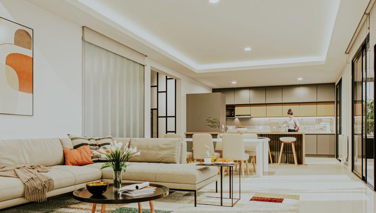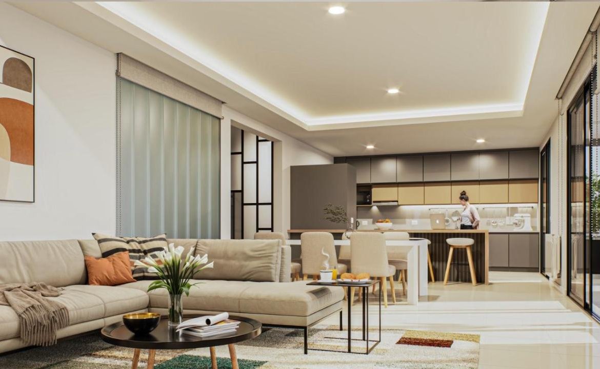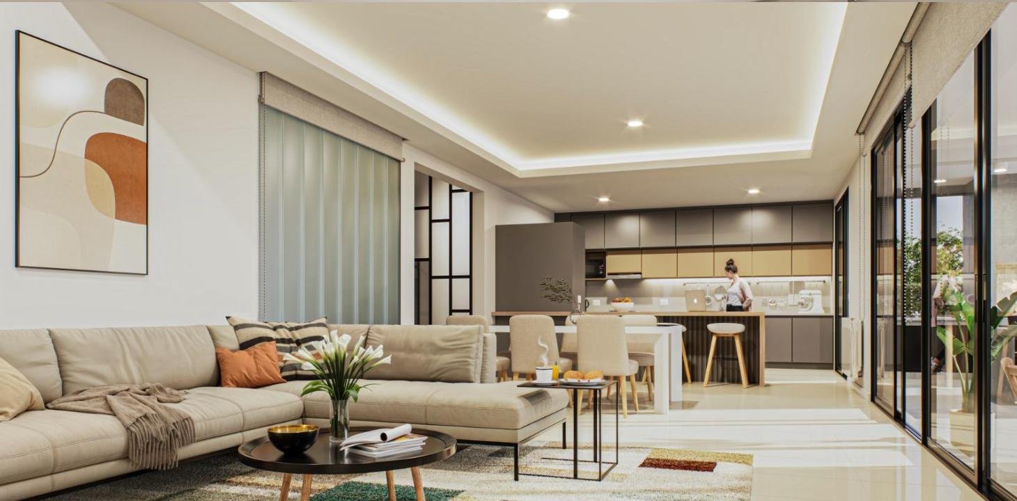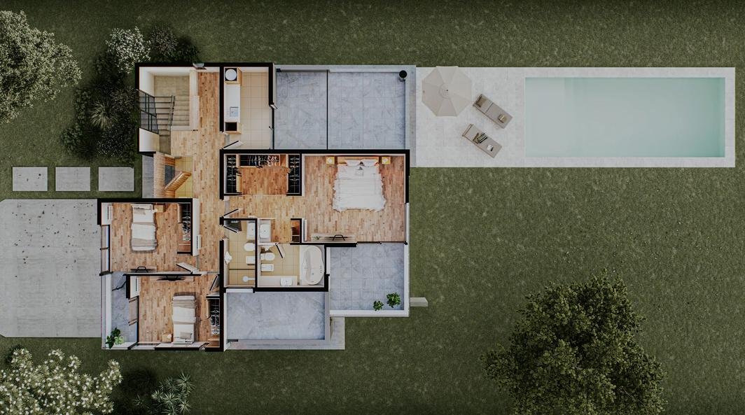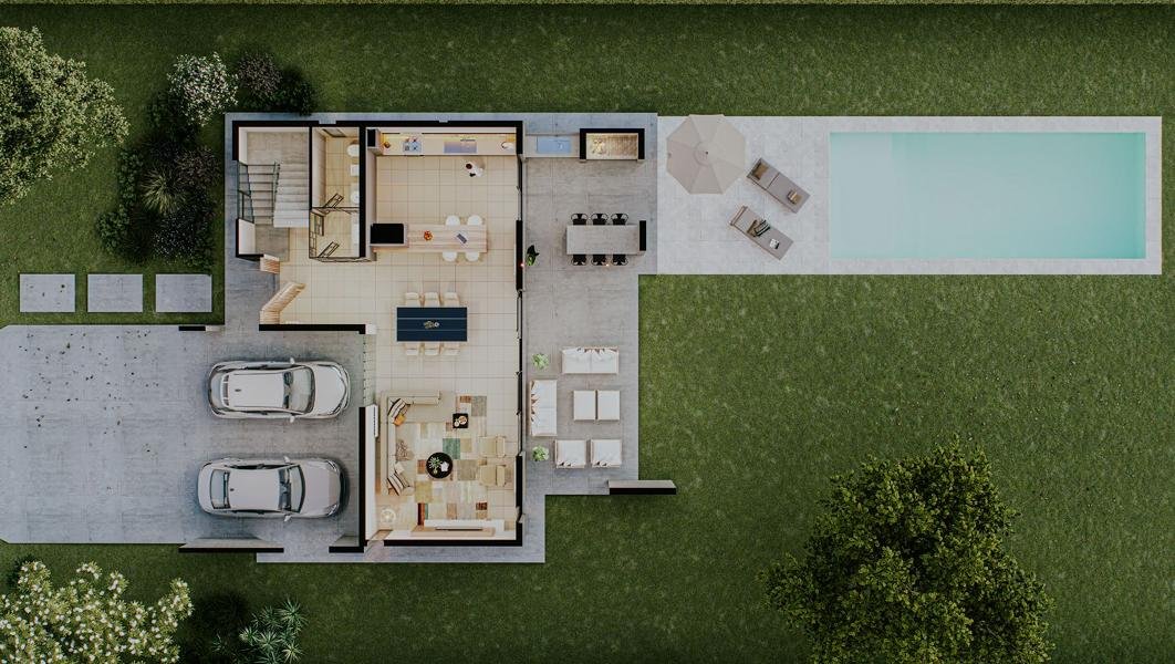 Ingreso vehicular semicubierto para dos autos y acceso peatonal al ingreso principal. Al entrar, un impactante espacio de doble altura brinda gran luminosidad y sensación de amplitud.