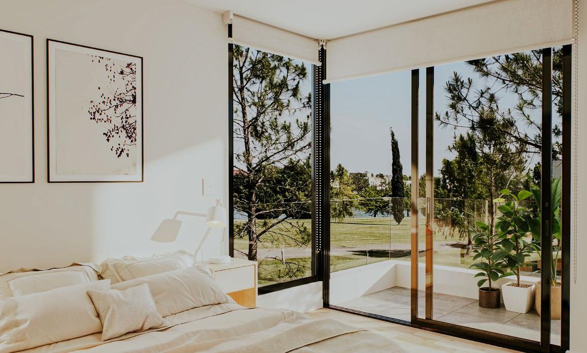 Distribuidor que organiza el área privada. Dormitorio principal en suite, con vestidor y balcón terraza con vista al entorno verde.