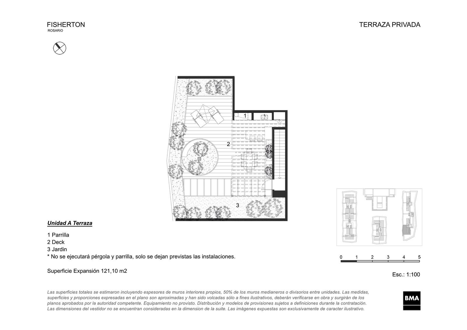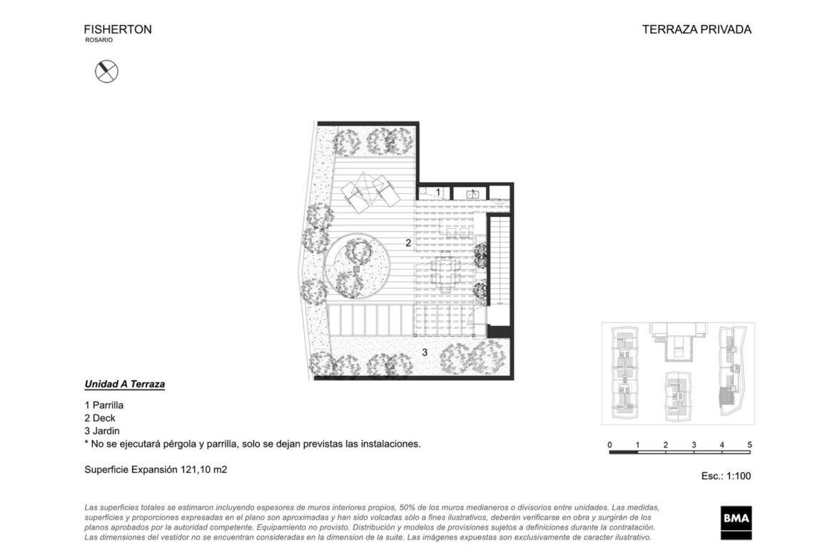 La terraza privada de 122 m2, dispondrá de deck y parrilla, acompañado de un hermoso jardín.