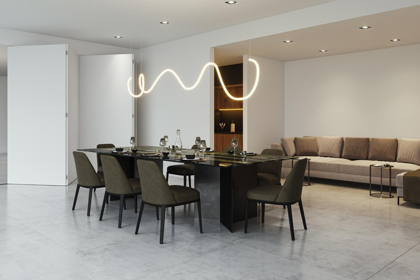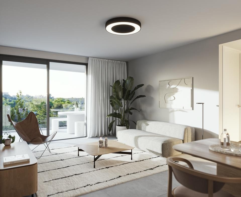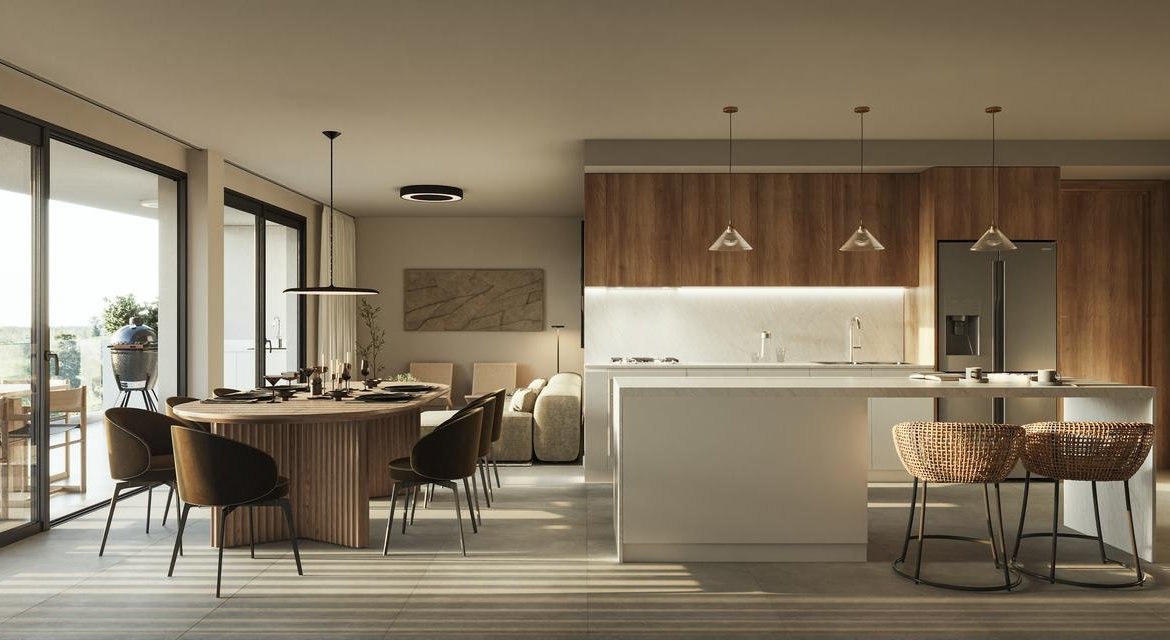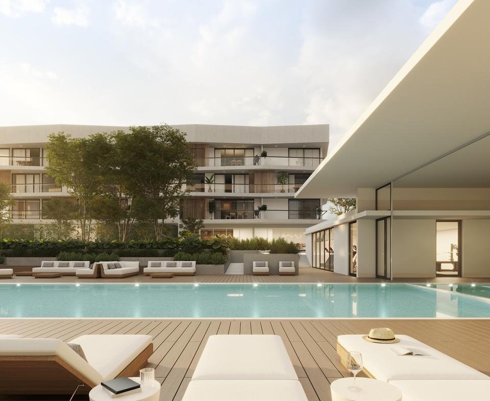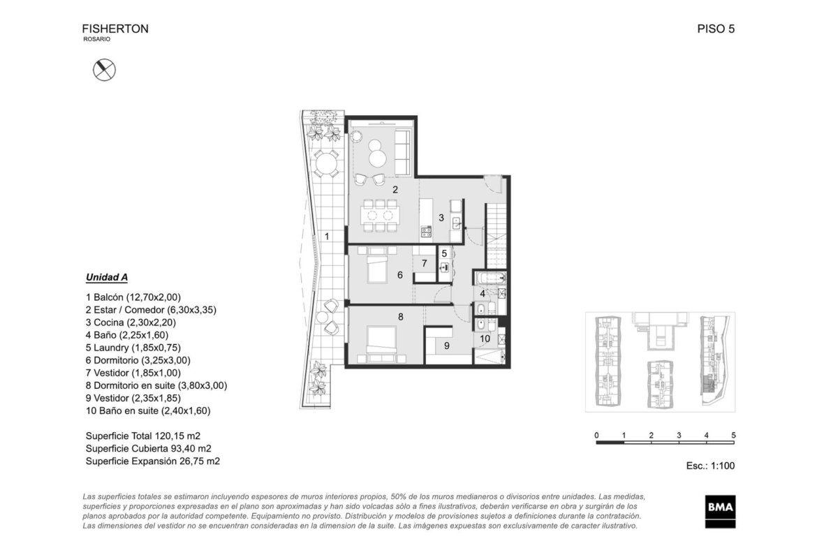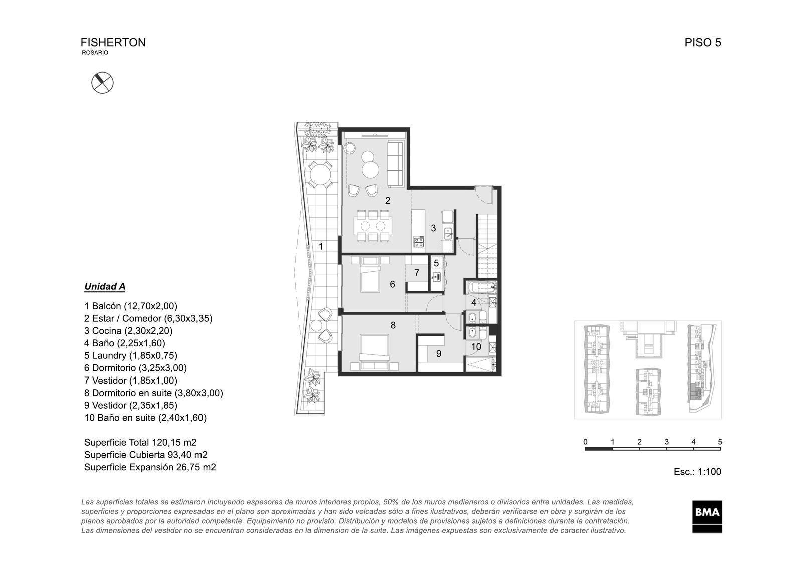 Unidad de 2 dormitorios en quinto piso con terraza privada. Dispone de 242 metros de uso exclusivo, a saber, 93 cubiertos exclusivos, y 26,75 de un mega balcón, y una terraza privada de 122 m2. El ambiente social principal, posee generosas dimensiones integrado a la cocina. Laundry sectorizado, dormitorio principal con baño en suite y vestidor, segundo dormitorio asistido por un baño completo. Amplísimo balcón aterrazado, con agradables visuales al entorno verde del condominio.