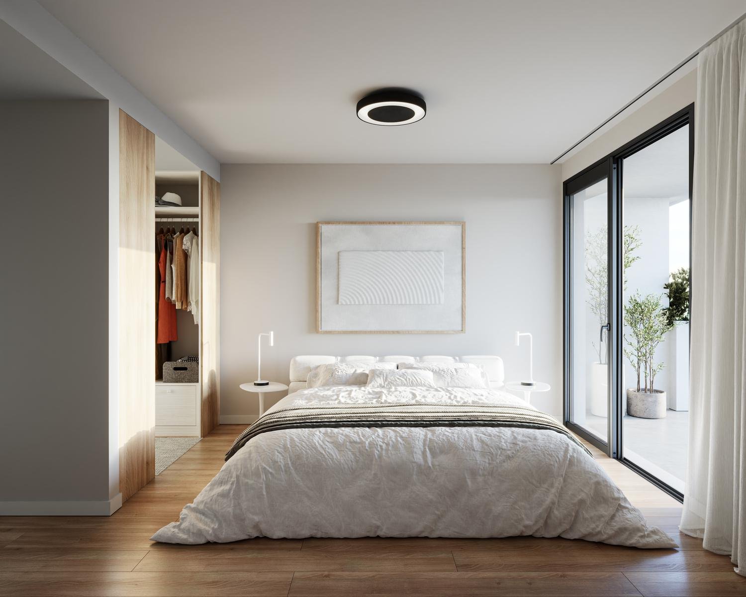 Unidad de 1 dormitorio en primer piso. Dispone de 68,75 metros de uso exclusivo, a saber, 54,50 cubiertos exclusivos, y 14,25 de terraza. Estar comedor integrado a la cocina, dormitorio con vestidor y baño en suite. Posee un balcón terraza con vistas al agradable verde entorno del condominio.
