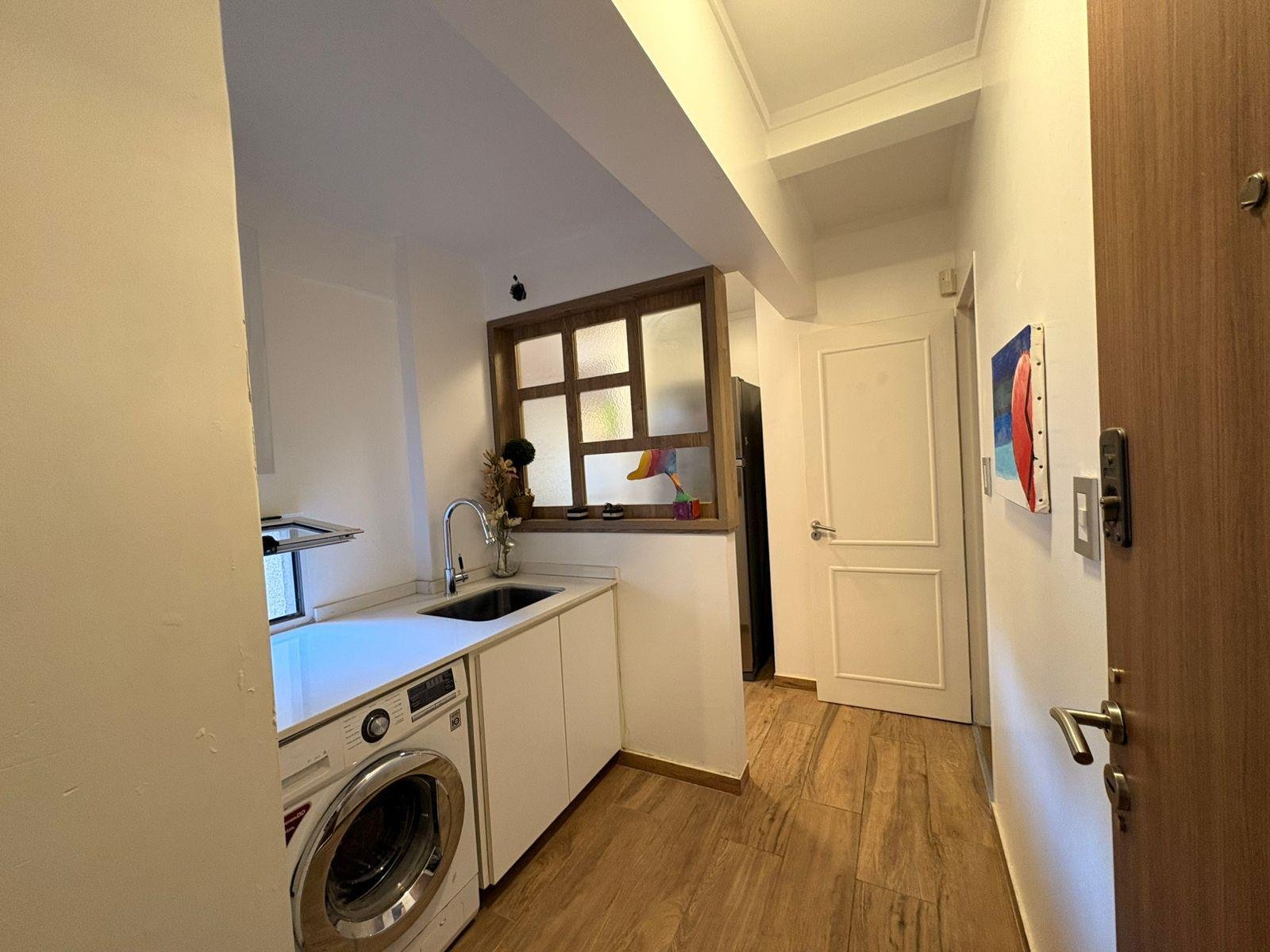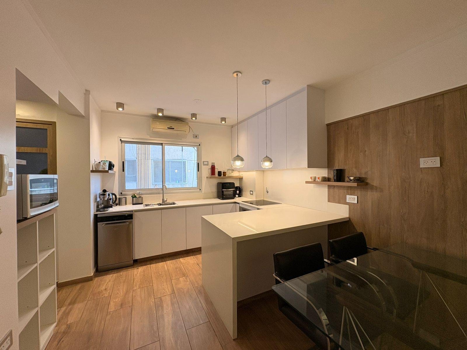 Por el ingreso secundario accedemos a la cocina independiente, totalmente modernizada, con espacio de comedor diario y barra desayunadora. Desde aquí se conecta un lavadero sectorizado con bacha, muy cómodo y bien resuelto.