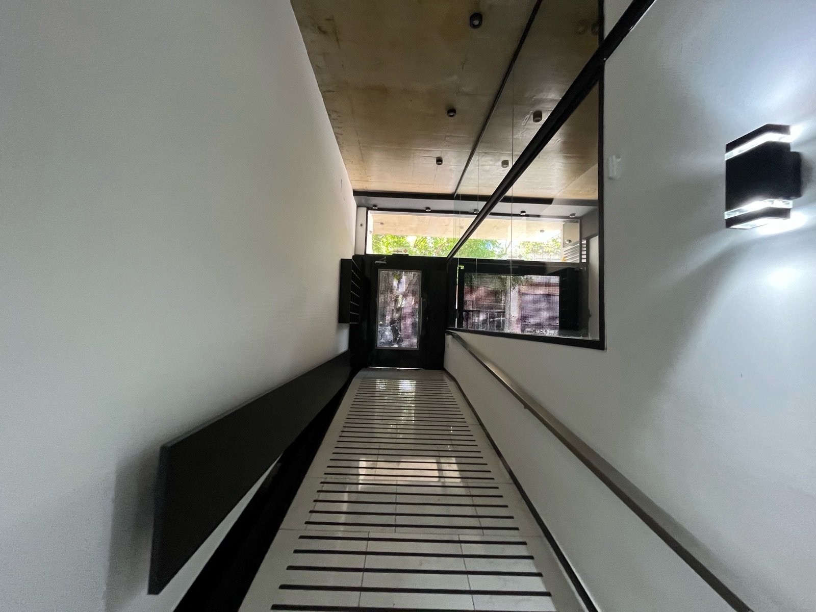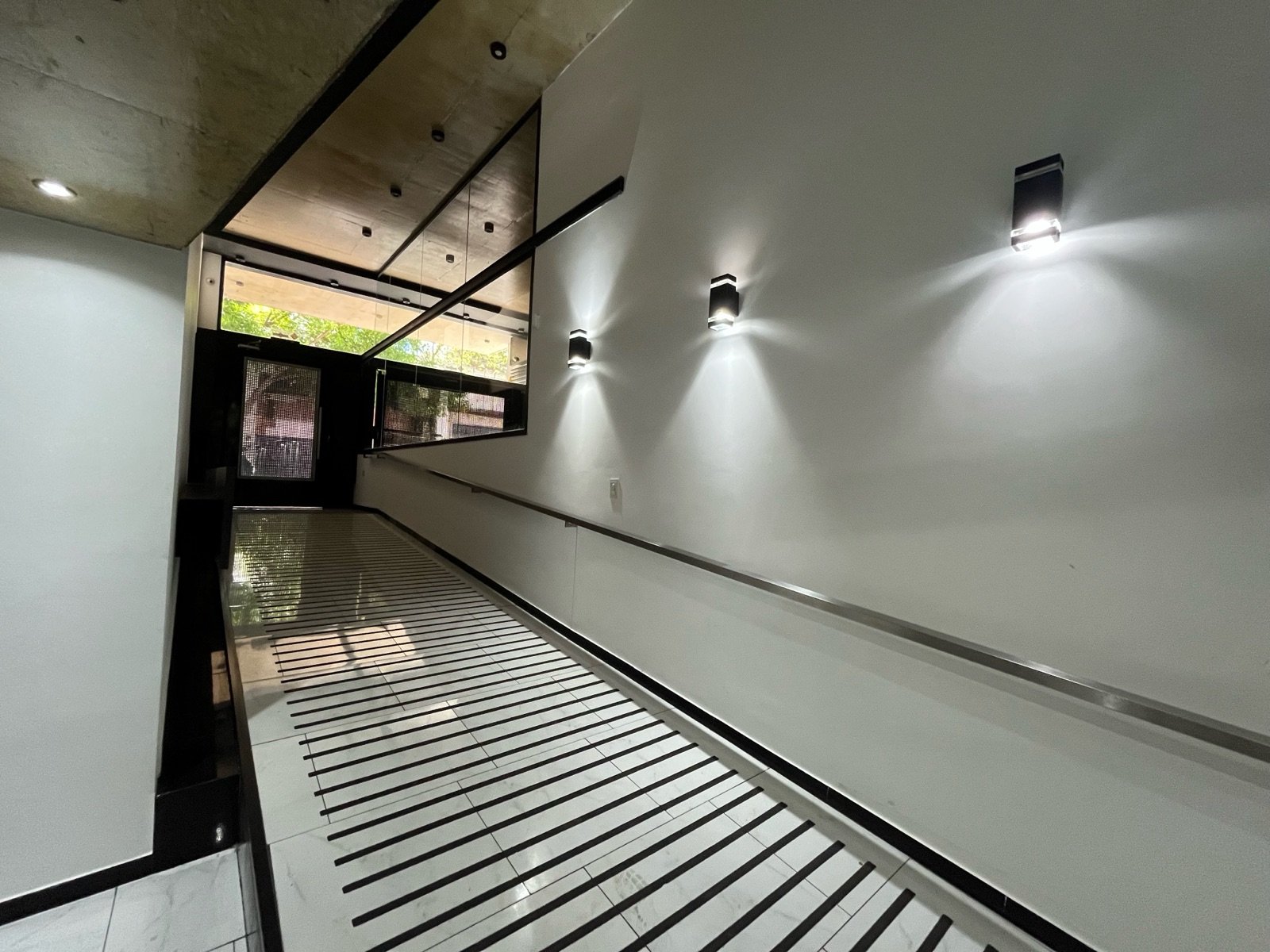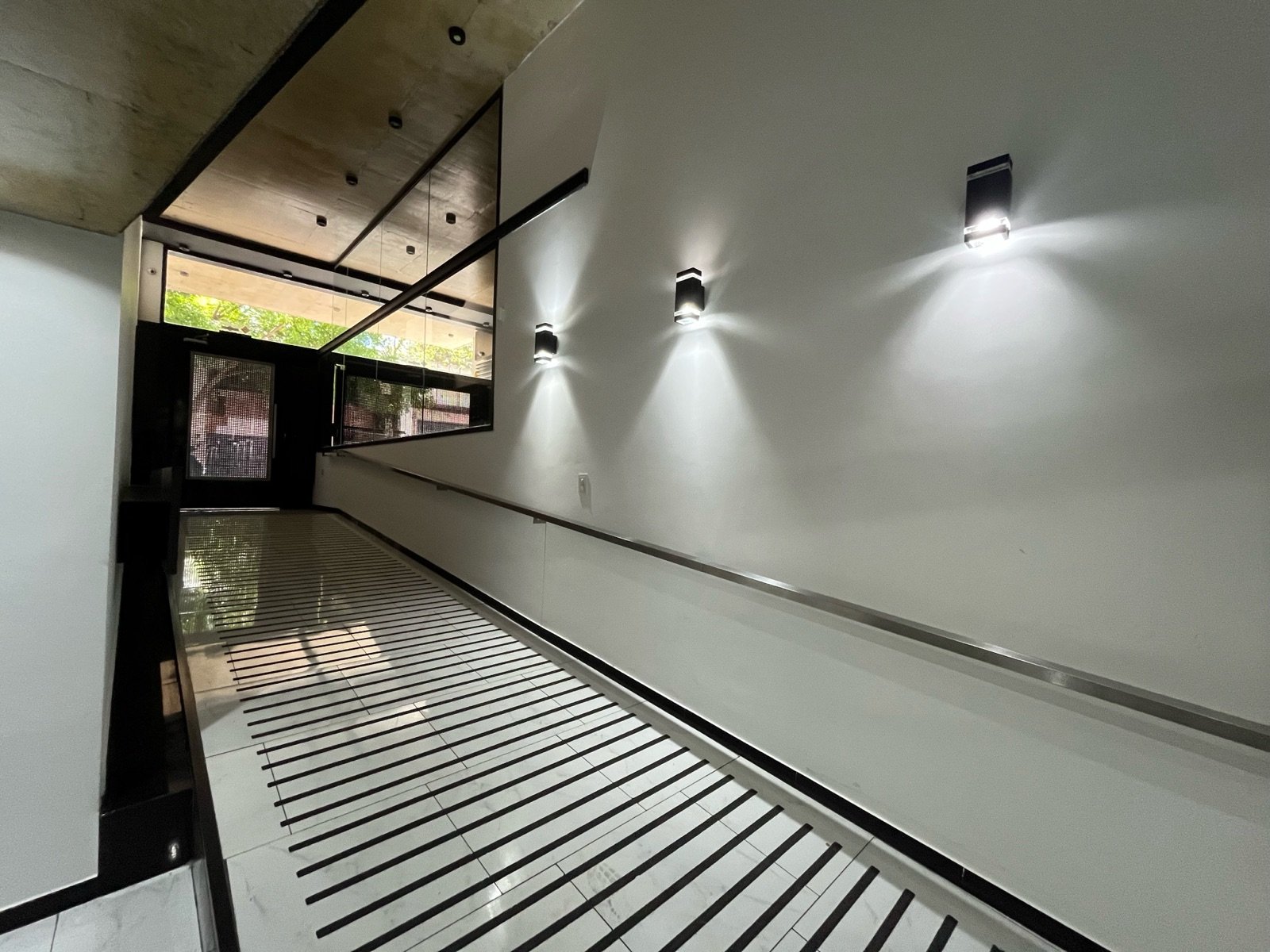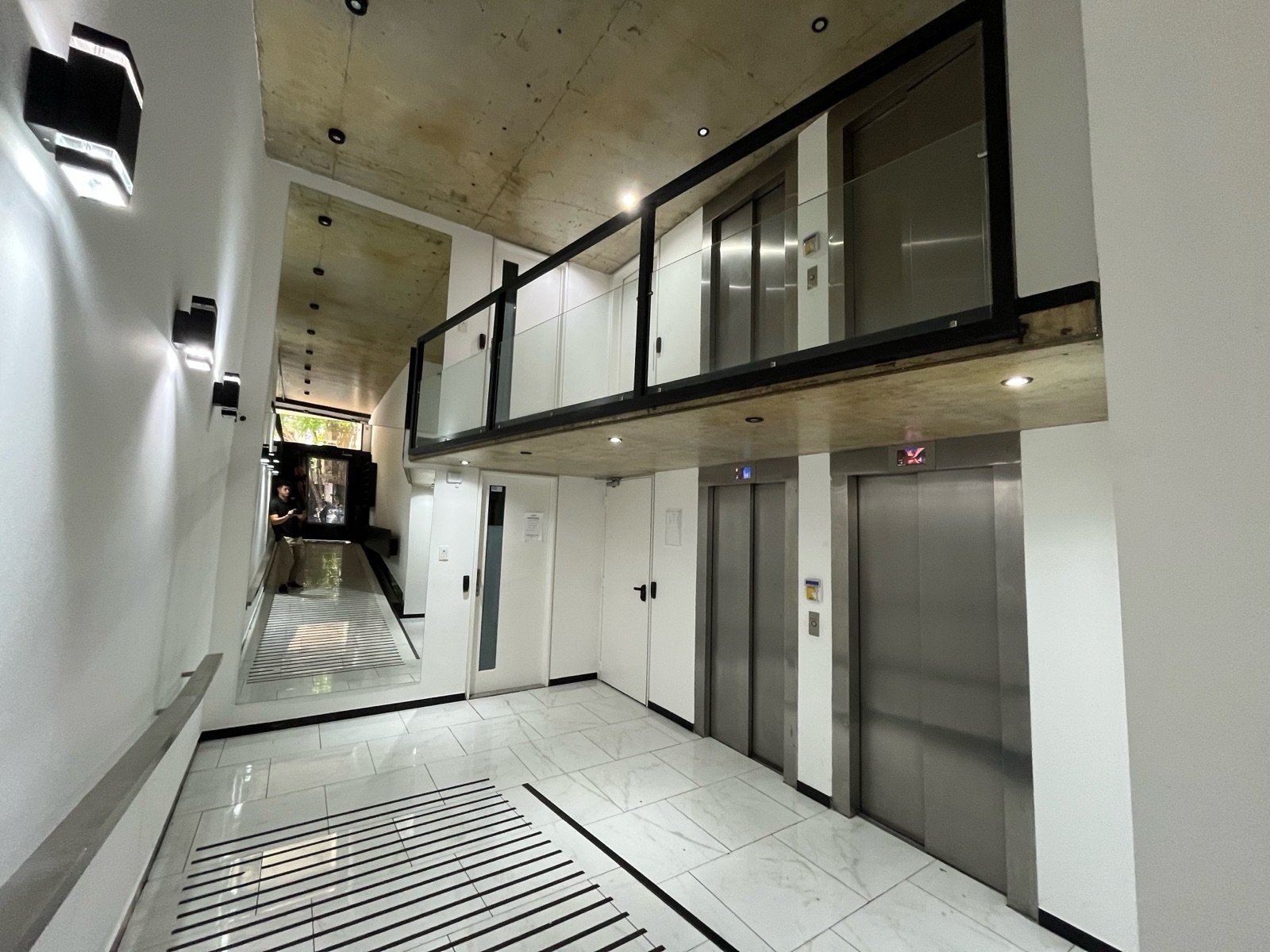Imponente ingreso en doble altura con diseño espejado e iluminación escenográfica