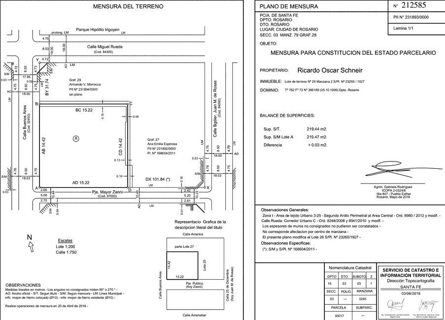 El terreno esta compuesto por 14.42 metros por calle Buenos Aires y 15.22 por Pje. Zanni encierra una superficie de 219 m2. La orientacion del mismo es Oeste sobre calle Buenos Aires y Sur sobre el pasaje.