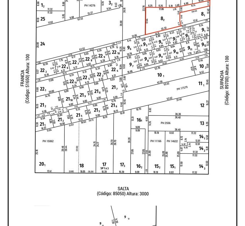 Frente de 3,38 m de pasillo x 18,42 m. A partir de ahi se ensancha y el frente es de 12,85 m x 22,32 m.
